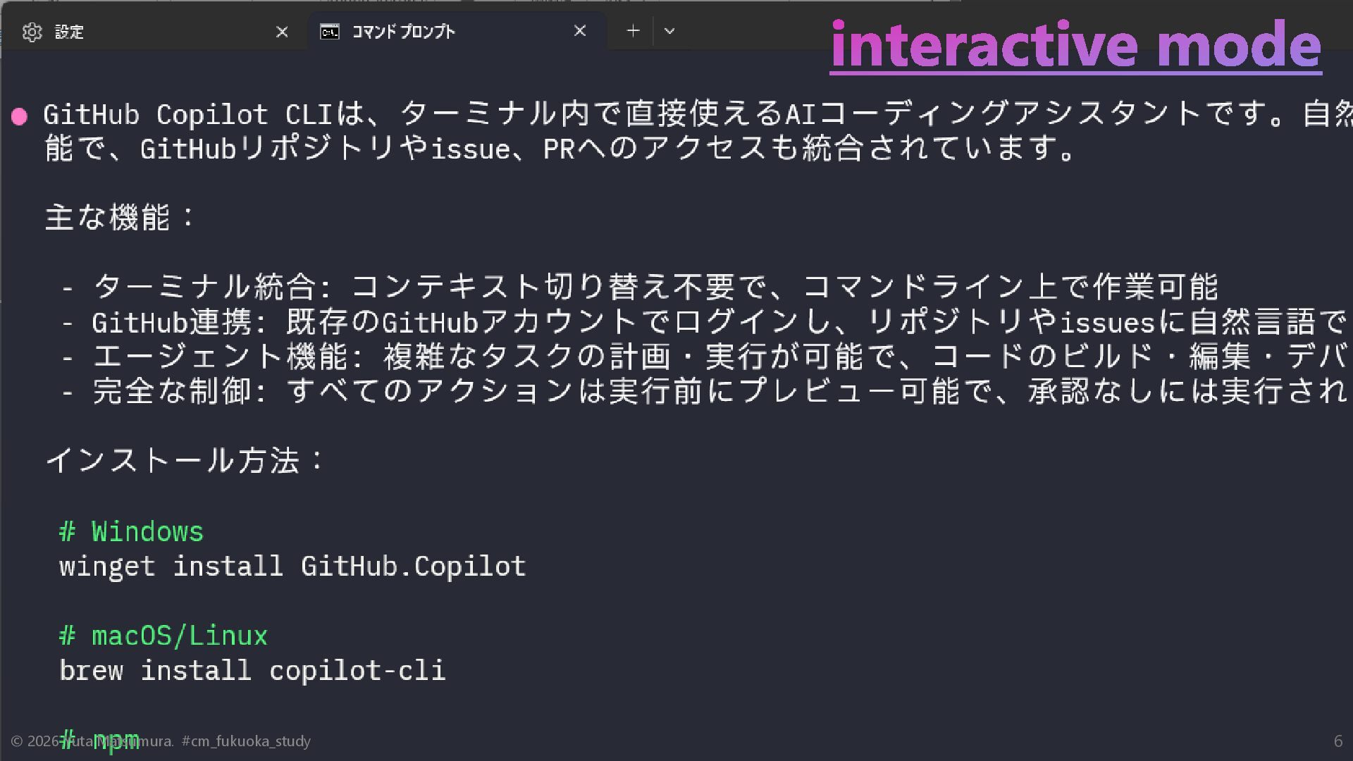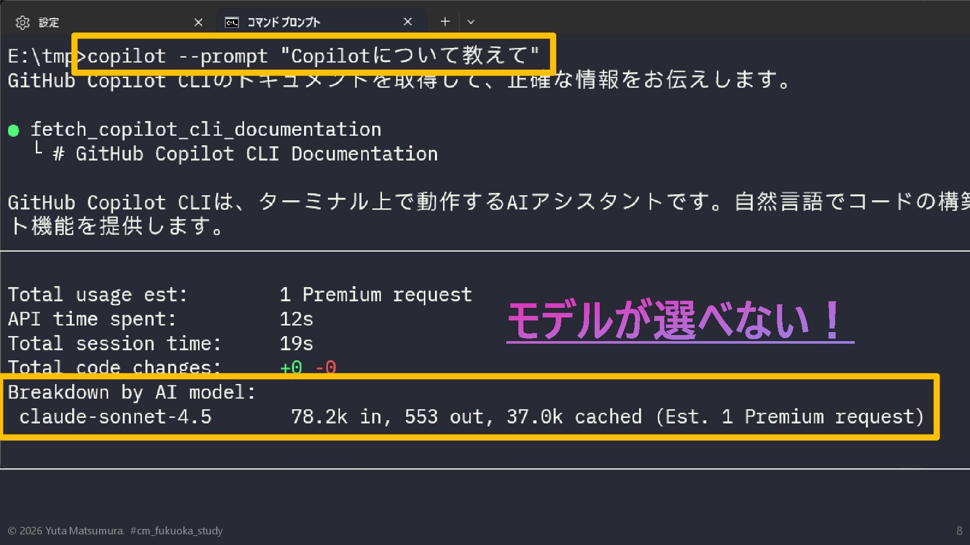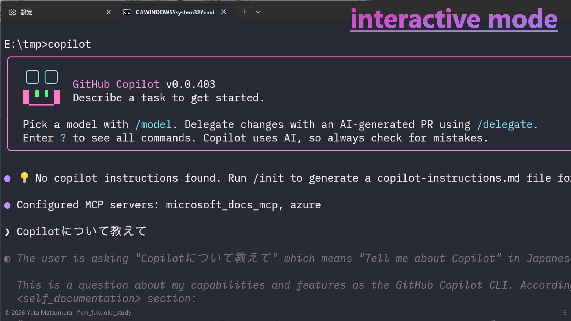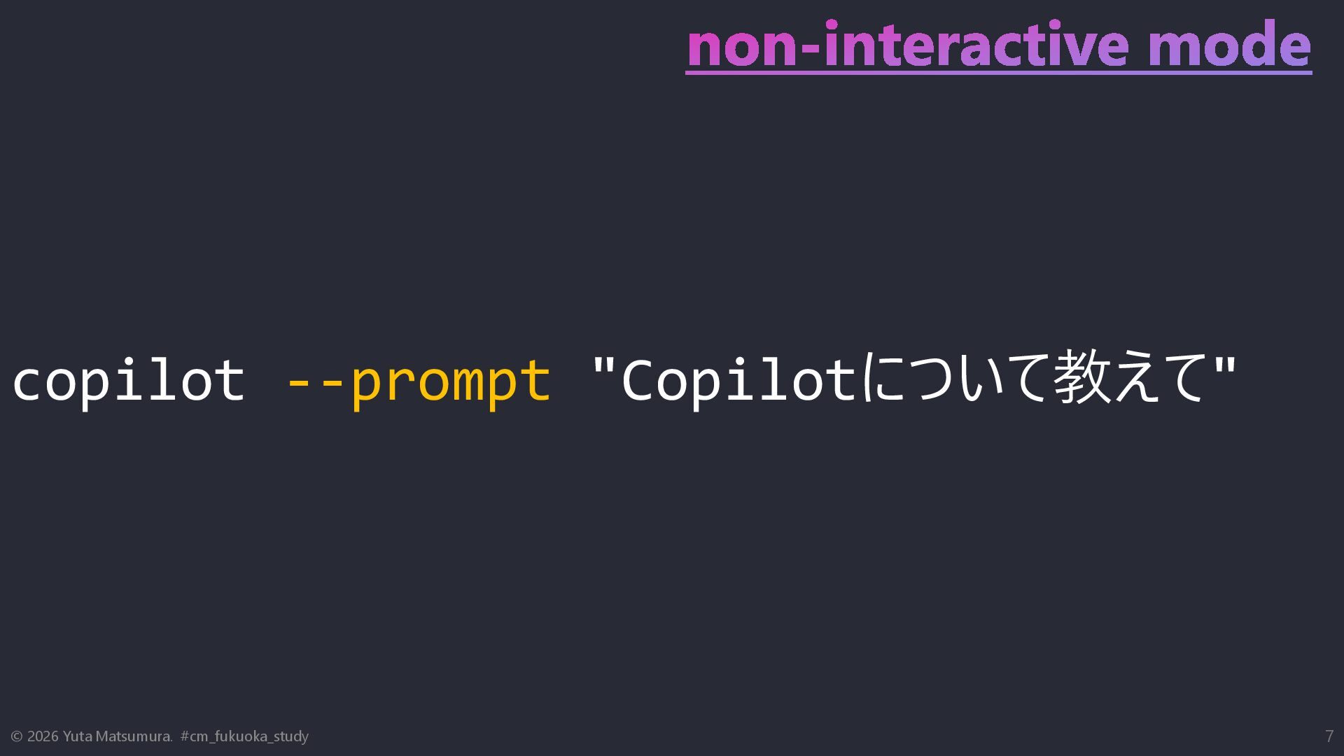 copilot --prompt "Copilotについて教えて" © 2026 Yuta Matsumura. #cm_fukuoka_study 7 non-interactive