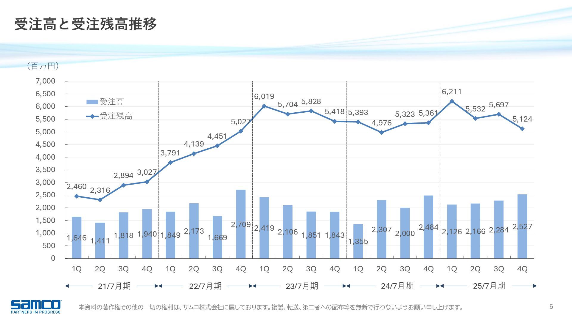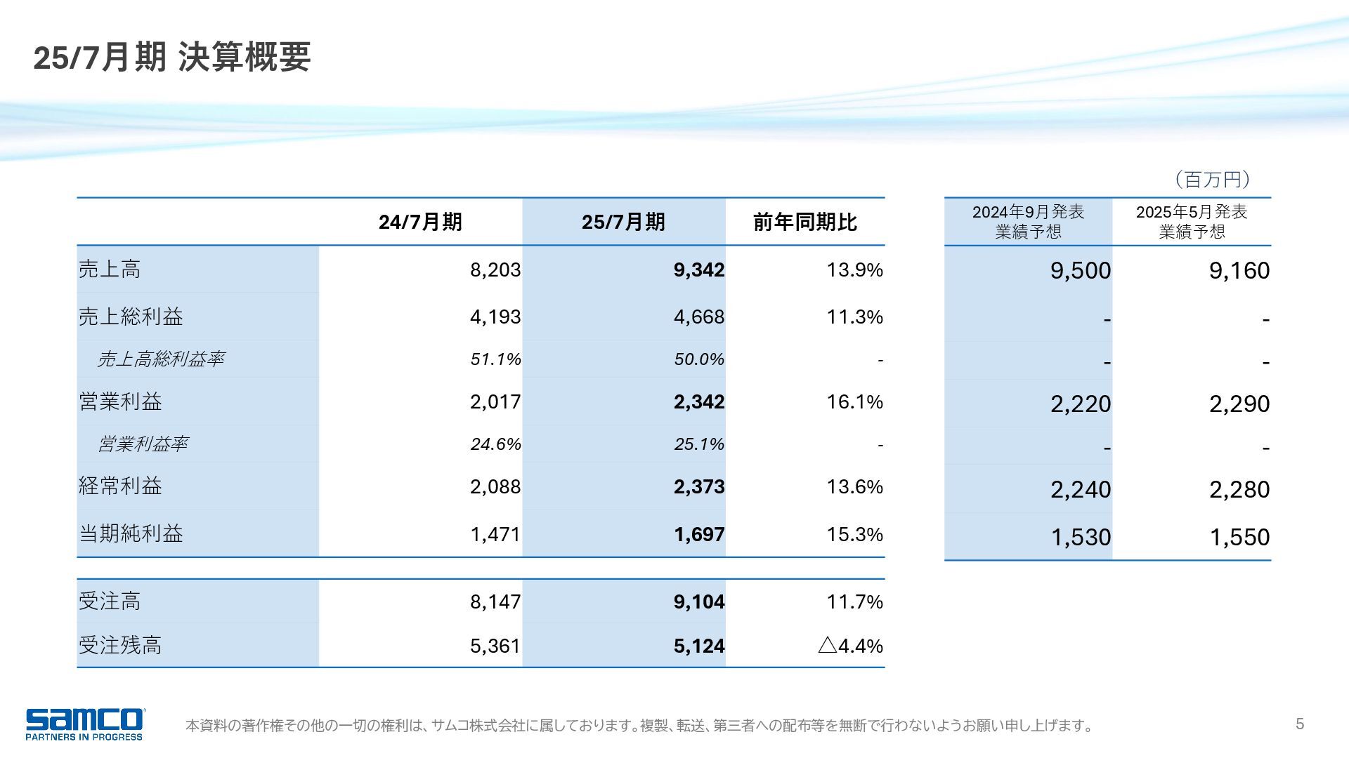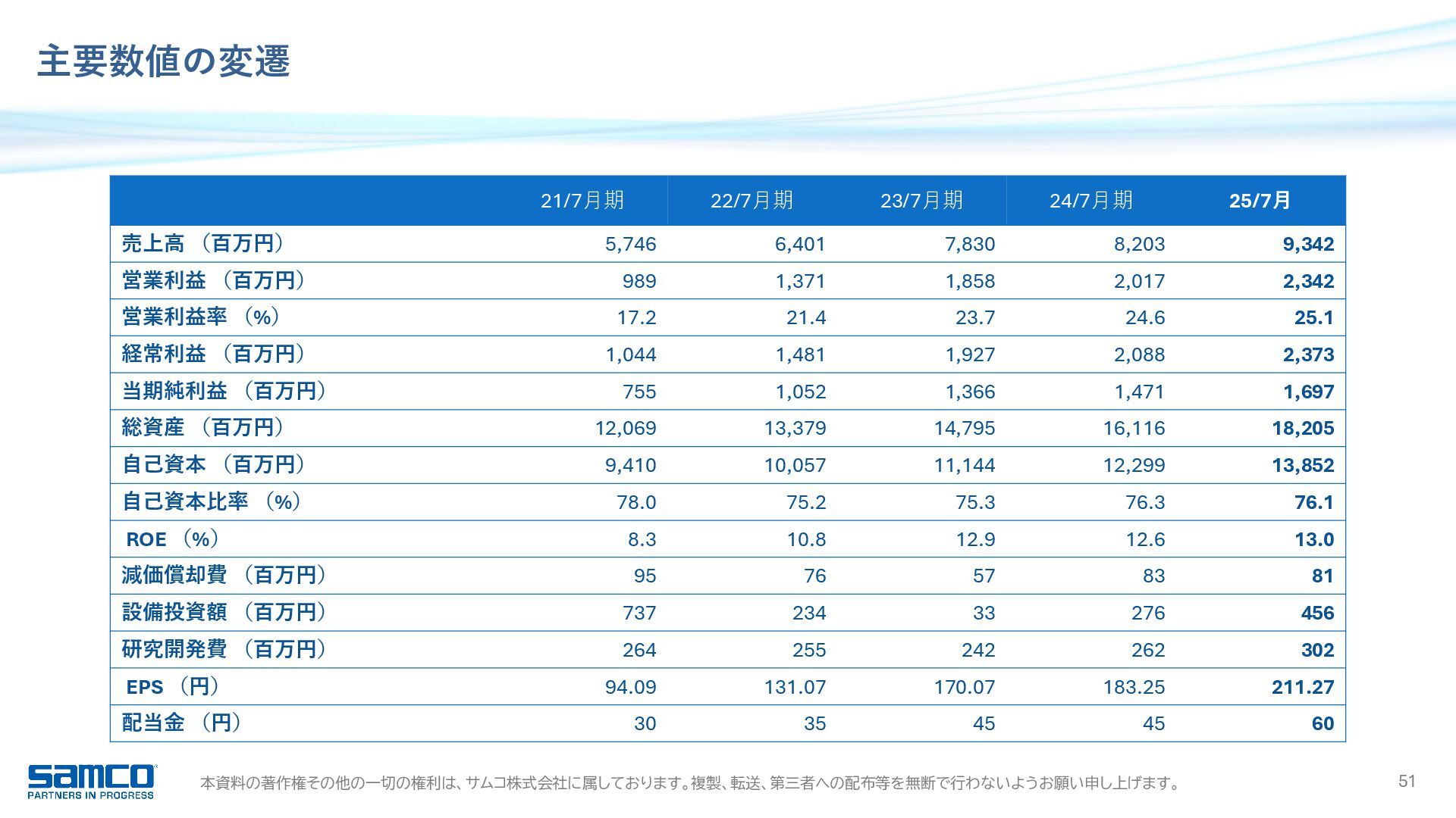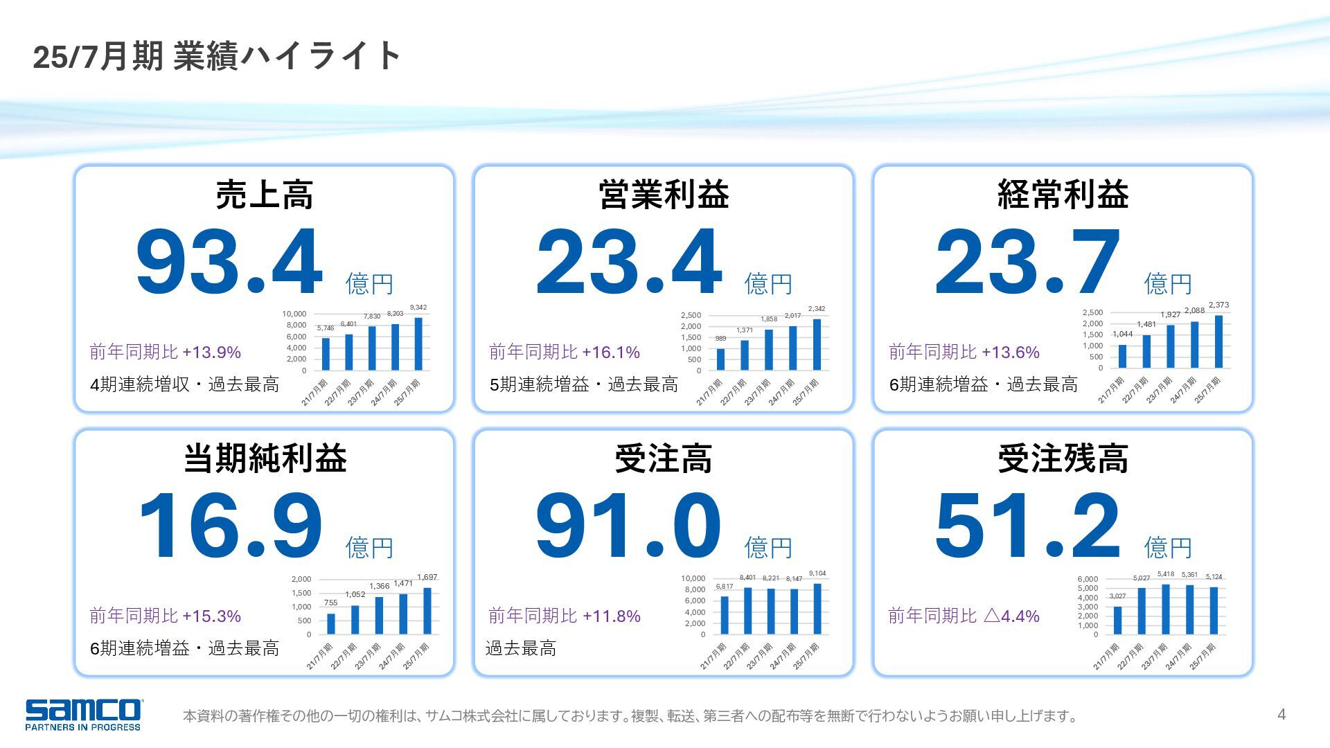 7,830 8,203 9,342 0 2,000 4,000 6,000 8,000 10,000 当期純利益 16.9 億円 前年同期比 +15.3% 6期連続増益・過去最高 受注高 91.0 億円 前年同期比 +11.8% 過去最高 受注残高 51.2 億円 前年同期比 △4.4% 営業利益 23.4 億円 前年同期比 +16.1% 5期連続増益・過去最高 989 1,371 1,858 2,017 2,342 0 500 1,000 1,500 2,000 2,500 経常利益 23.7 億円 前年同期比 +13.6% 6期連続増益・過去最高 1,044 1,481 1,927 2,088 2,373 0 500 1,000 1,500 2,000 2,500 6,817 8,401 8,221 8,147 9,104 0 2,000 4,000 6,000 8,000 10,000 3,027 5,027 5,418 5,361 5,124 0 1,000 2,000 3,000 4,000 5,000 6,000 25/7月期 業績ハイライト 755 1,052 1,366 1,471 1,697 0 500 1,000 1,500 2,000