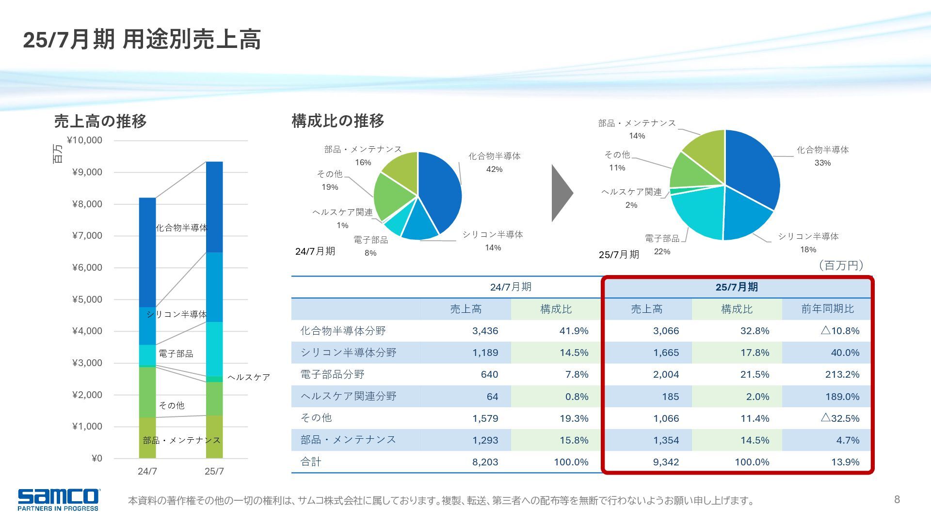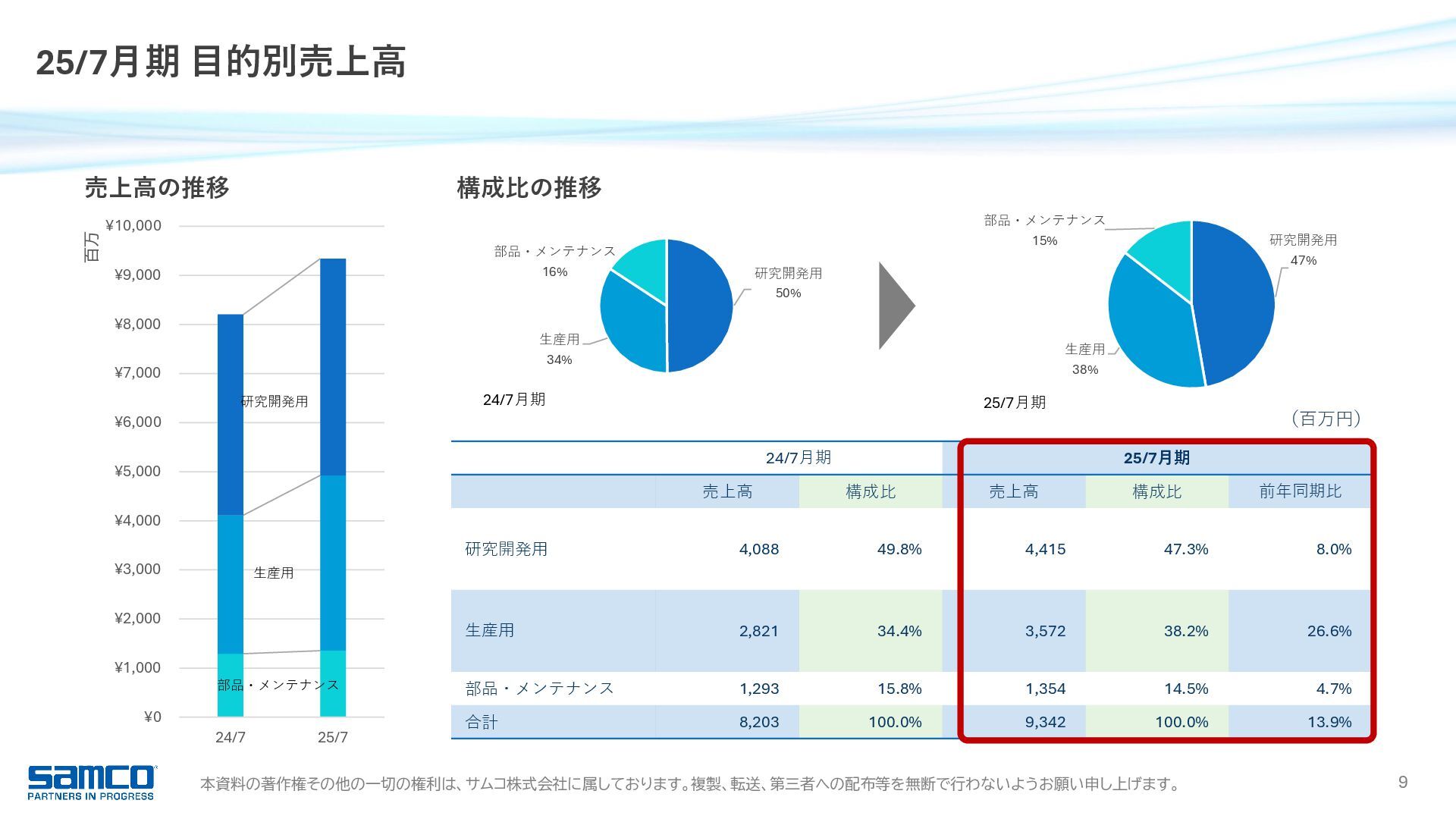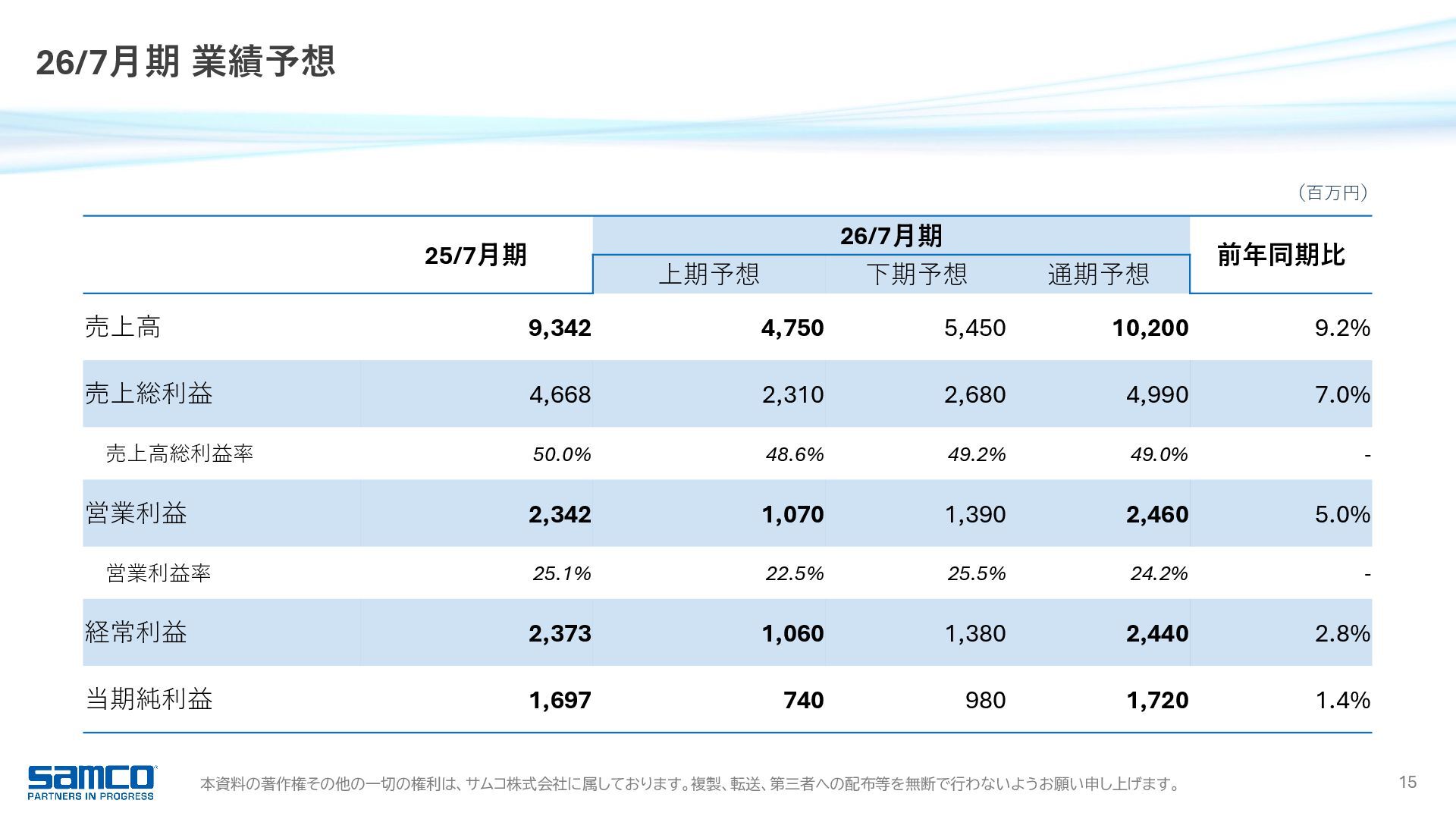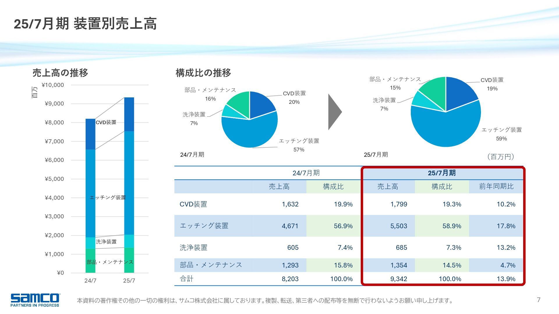 7,830 8,203 9,342 0 2,000 4,000 6,000 8,000 10,000 当期純利益 16.9 億円 前年同期比 +15.3% 6期連続増益・過去最高 受注高 91.0 億円 前年同期比 +11.8% 過去最高 受注残高 51.2 億円 前年同期比 △4.4% 営業利益 23.4 億円 前年同期比 +16.1% 5期連続増益・過去最高 989 1,371 1,858 2,017 2,342 0 500 1,000 1,500 2,000 2,500 経常利益 23.7 億円 前年同期比 +13.6% 6期連続増益・過去最高 1,044 1,481 1,927 2,088 2,373 0 500 1,000 1,500 2,000 2,500 6,817 8,401 8,221 8,147 9,104 0 2,000 4,000 6,000 8,000 10,000 3,027 5,027 5,418 5,361 5,124 0 1,000 2,000 3,000 4,000 5,000 6,000 25/7月期 業績ハイライト 755 1,052 1,366 1,471 1,697 0 500 1,000 1,500 2,000