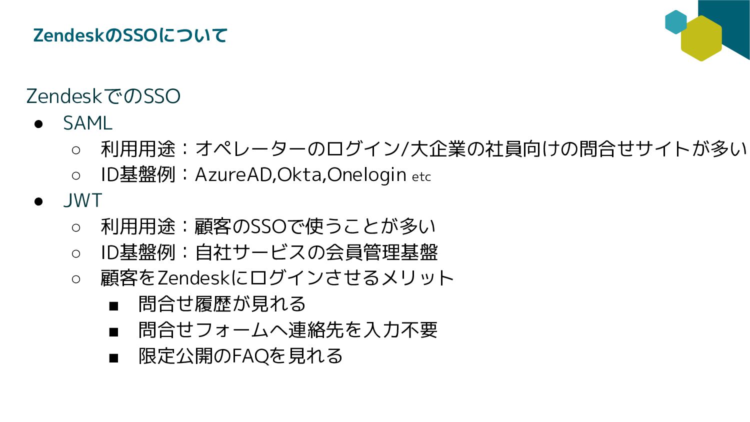 JWT ◦ 利用用途:顧客のSSOで使うことが多い ◦ ID基盤例:自社サービスの会員管理基盤 ◦ 顧客をZendeskにログインさせるメリット ▪ 問合せ履歴が見れる ▪ 問合せフォームへ連絡先を入力不要 ▪ 限定公開のFAQを見れる