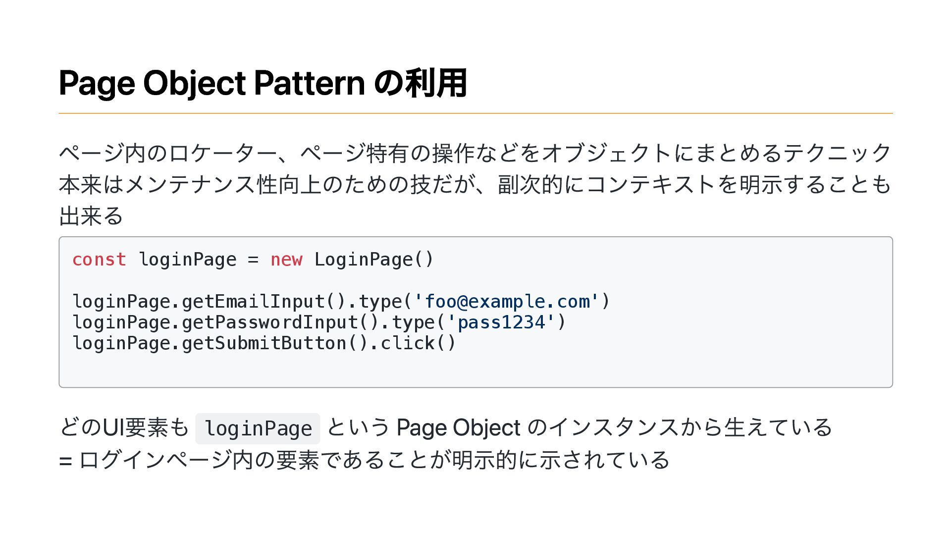 Page Object Pattern の利用 ページ内のロケーター、ページ特有の操作などをオブジェクトにまとめるテクニック 本来はメンテナンス性向上のための技だが、副次的にコンテキストを明示することも 出来る const loginPage =