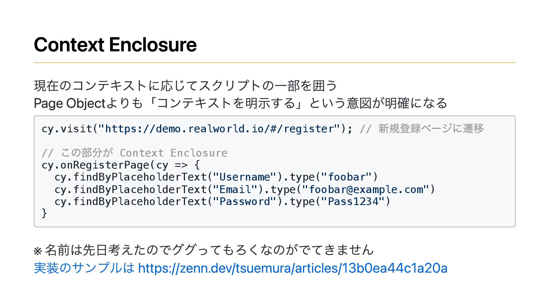 Context Enclosure 現在のコンテキストに応じてスクリプトの一部を囲う Page Objectよりも「コンテキストを明示する」という意図が明確になる cy.visit("https://demo.realworld.io/#/register"); // 新規登録ページに遷移 // この部分が