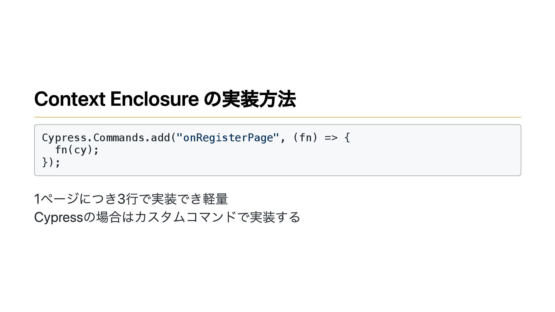 Context Enclosure の実装方法 Cypress.Commands.add("onRegisterPage", (fn) => { fn(cy); }); 1ページにつき3行で実装でき軽量