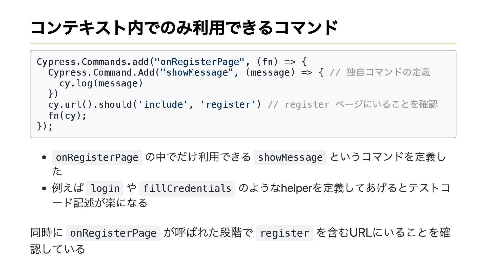 コンテキスト内でのみ利用できるコマンド Cypress.Commands.add("onRegisterPage", (fn) => { Cypress.Command.Add("showMessage", (message) => { //