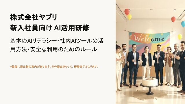 株式会社ヤプリ 新入社員向け AI活用研修 基本のAIリテラシー・社内AIツールの活 用方法・安全な利用のためのルール ※最後に提出物の案内があります。その提出をもって、研修完了となります。