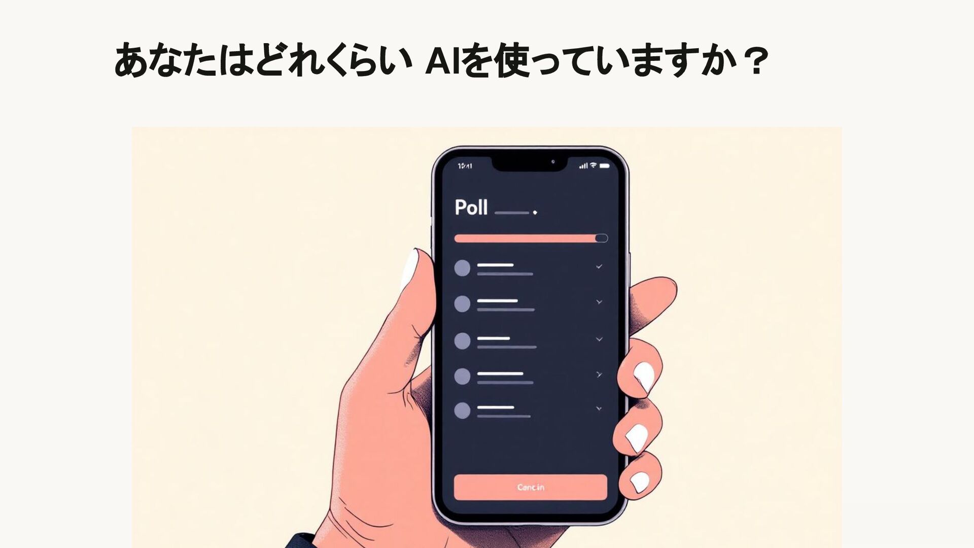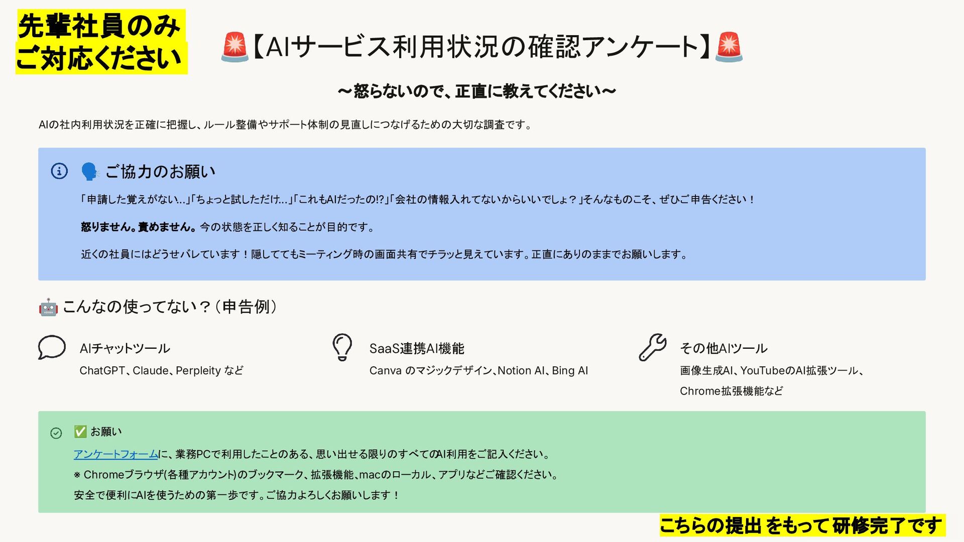 🚨【AIサービス利用状況の確認アンケート】🚨 〜怒らないので、正直に教えてください〜 AIの社内利用状況を正確に把握し、ルール整備やサポート体制の見直しにつなげるための大切な調査です。 🗣 ご協力のお願い 「申請した覚えがない…」「ちょっと試しただけ…」「これもAIだったの!?」「会社の情報入れてないからいいでしょ?」 そんなものこそ、ぜひご申告ください! 怒りません。責めません。 今の状態を正しく知ることが目的です。 近くの社員にはどうせバレています!隠しててもミーティング時の画面共有でチラッと見えています。正直にありのままでお願いします。