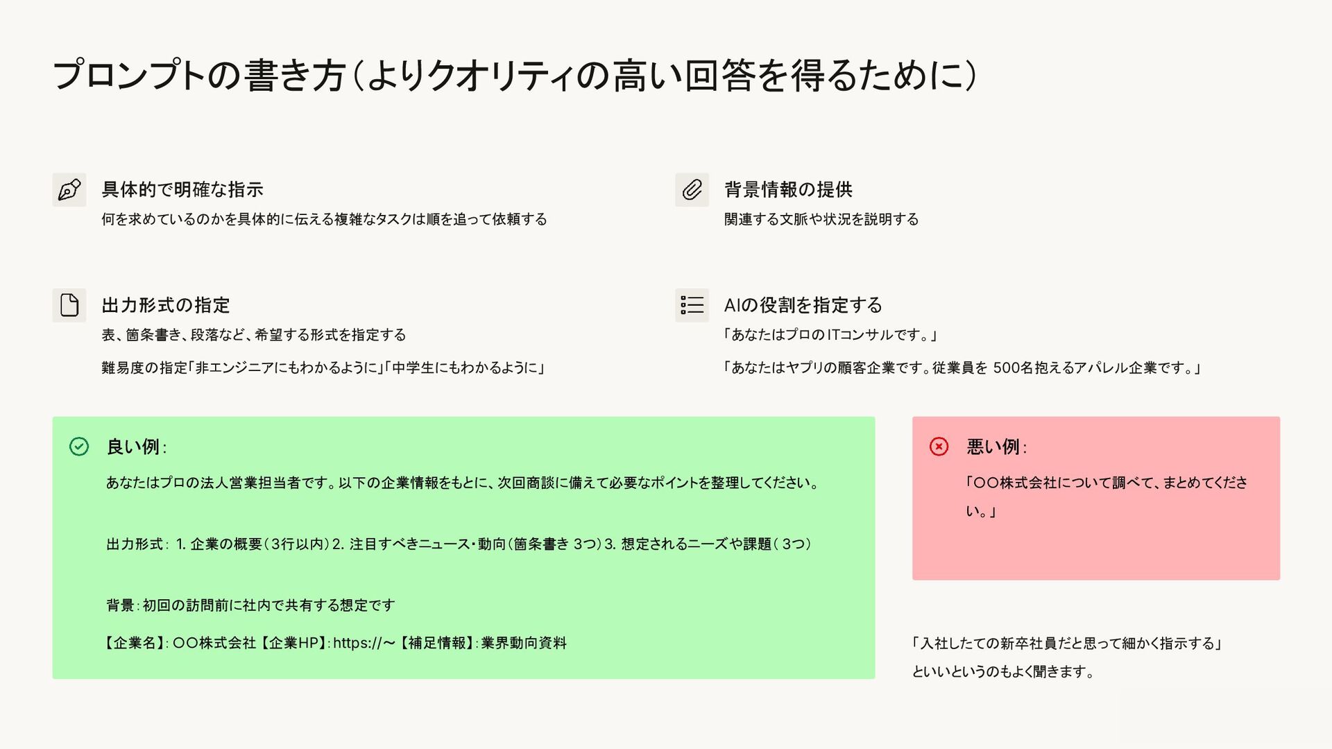 「あなたはヤプリの顧客企業です。従業員を 500名抱えるアパレル企業です。」 良い例: あなたはプロの法人営業担当者です。以下の企業情報をもとに、次回商談に備えて必要なポイントを整理してください。 出力形式: 1. 企業の概要(3行以内)2. 注目すべきニュース・動向(箇条書き 3つ)3. 想定されるニーズや課題( 3つ) 背景:初回の訪問前に社内で共有する想定です 【企業名】:◦◦株式会社 【企業HP】:https://〜 【補足情報】:業界動向資料 悪い例: 「◦◦株式会社について調べて、まとめてくださ い。」 「入社したての新卒社員だと思って細かく指示する」 といいというのもよく聞きます。