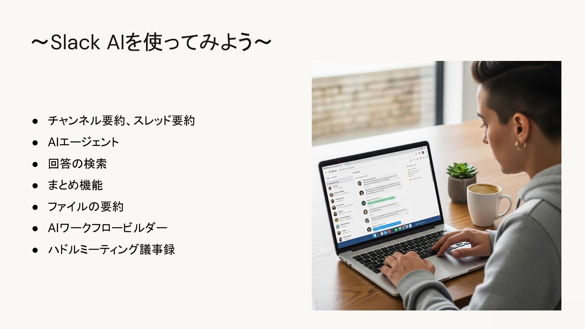 〜Slack AIを使ってみよう〜 • チャンネル要約、スレッド要約 • AIエージェント • 回答の検索 • まとめ機能