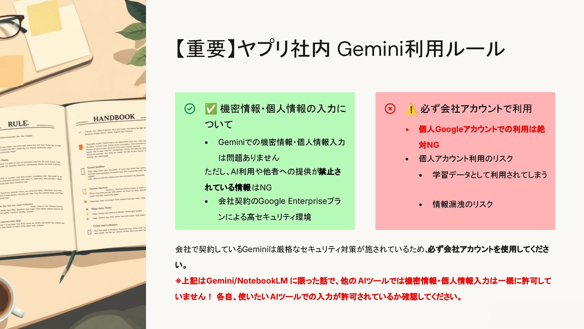 • 会社契約のGoogle Enterpriseプラ ンによる高セキュリティ環境 ⚠ 必ず会社アカウントで利用 • 個人Googleアカウントでの利用は絶 対NG • 個人アカウント利用のリスク • 学習データとして利用されてしまう • 情報漏洩のリスク 会社で契約しているGeminiは厳格なセキュリティ対策が施されているため、 必ず会社アカウントを使用してくださ い。 ※上記はGemini/NotebookLM に限った話で、他の AIツールでは機密情報・個人情報入力は一概に許可して いません! 各自、使いたいAIツールでの入力が許可されているか確認してください。