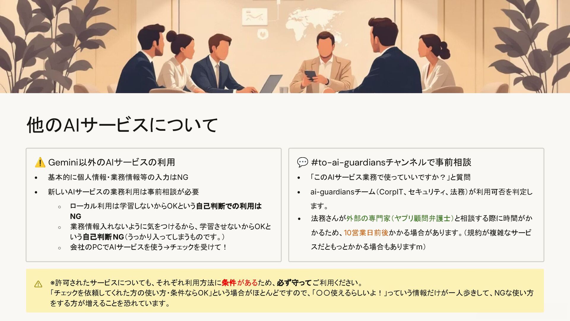 ◦ 業務情報入れないように気をつけるから、学習させないからOKと いう自己判断NG(うっかり入ってしまうものです。) ◦ 会社のPCでAIサービスを使う→チェックを受けて! 💬 #to-ai-guardiansチャンネルで事前相談 • 「このAIサービス業務で使っていいですか?」と質問 • ai-guardiansチーム(CorpIT、セキュリティ、法務)が利用可否を判定し ます。 ※許可されたサービスについても、それぞれ利用方法に条件があるため、必ず守って ご利用ください。 「チェックを依頼してくれた方の使い方・条件ならOK」という場合がほとんどですので、「〇〇使えるらしいよ!」っていう情報だけが一人歩きして、NGな使い方 をする方が増えることを恐れています。 • 法務さんが外部の専門家(ヤプリ顧問弁護士)と相談する際に時間がか かるため、10営業日前後かかる場合があります。(規約が複雑なサービ スだともっとかかる場合もありますm)