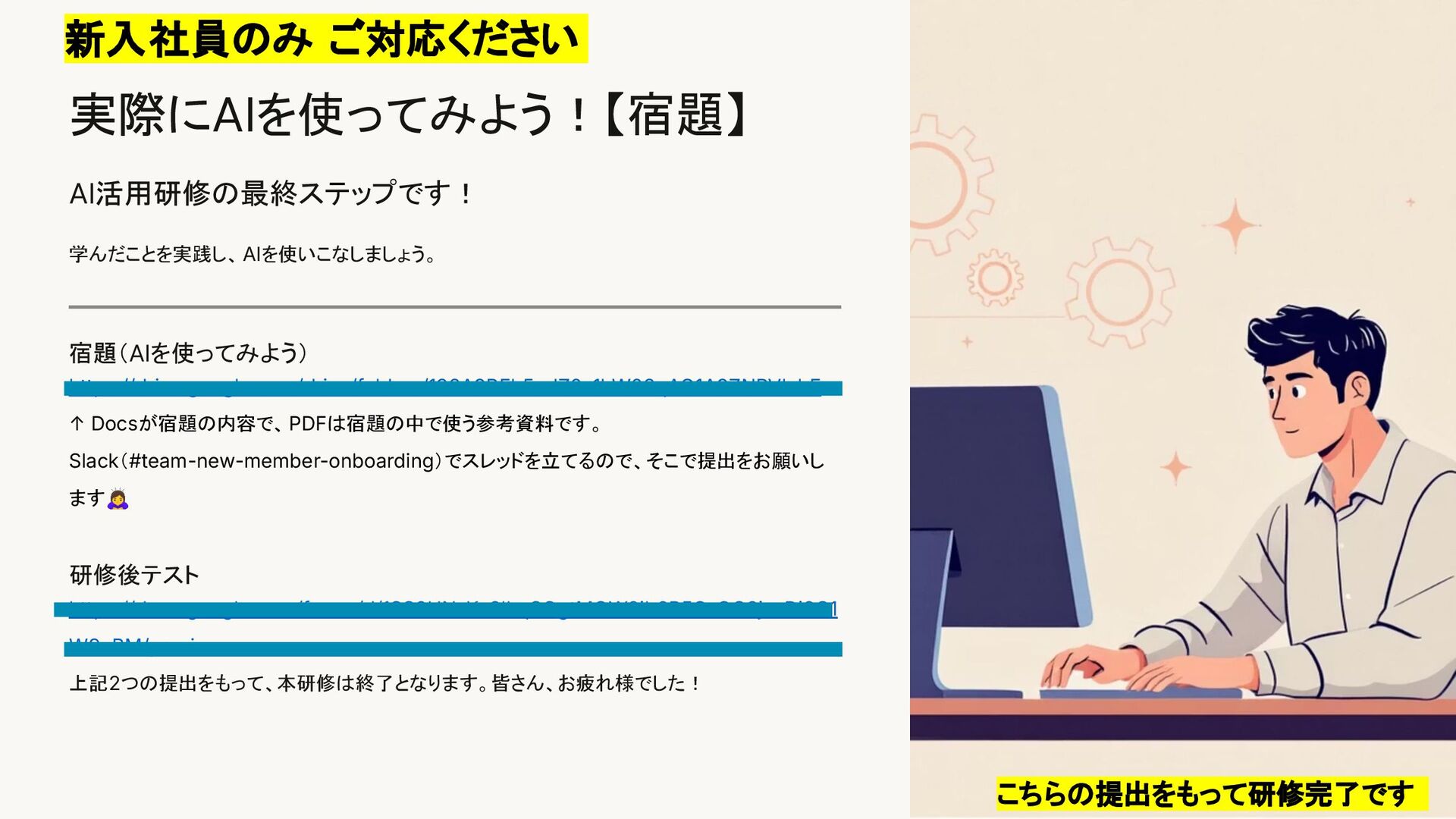 実際にAIを使ってみよう!【宿題】 AI活用研修の最終ステップです! 学んだことを実践し、AIを使いこなしましょう。 宿題(AIを使ってみよう) https://drive.google.com/drive/folders/138A9BFb5odZ0a1bW08qAO1A9ZNRVlvbF ↑ Docsが宿題の内容で、PDFは宿題の中で使う参考資料です。 Slack(#team-new-member-onboarding)でスレッドを立てるので、そこで提出をお願いし ます 研修後テスト