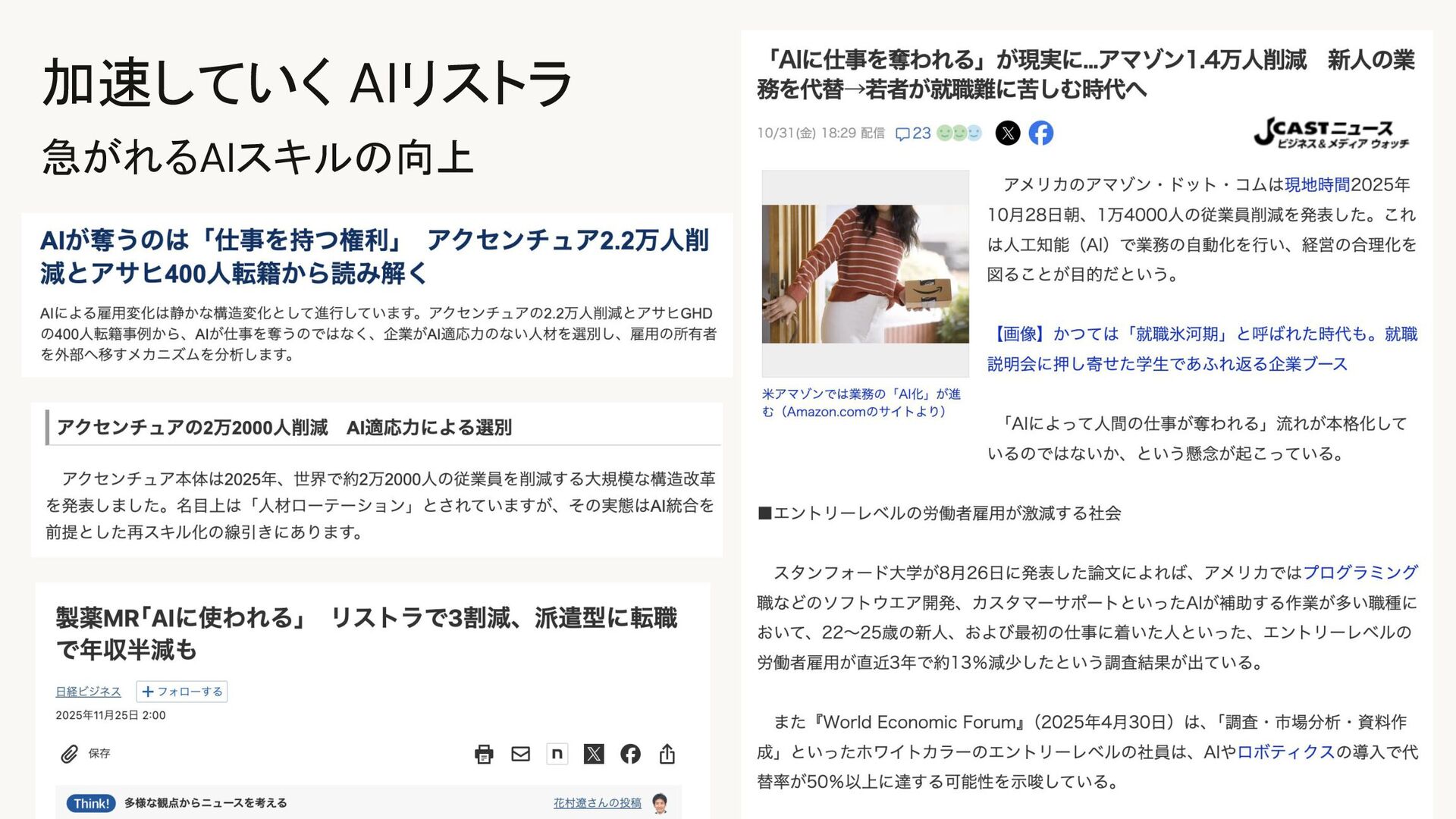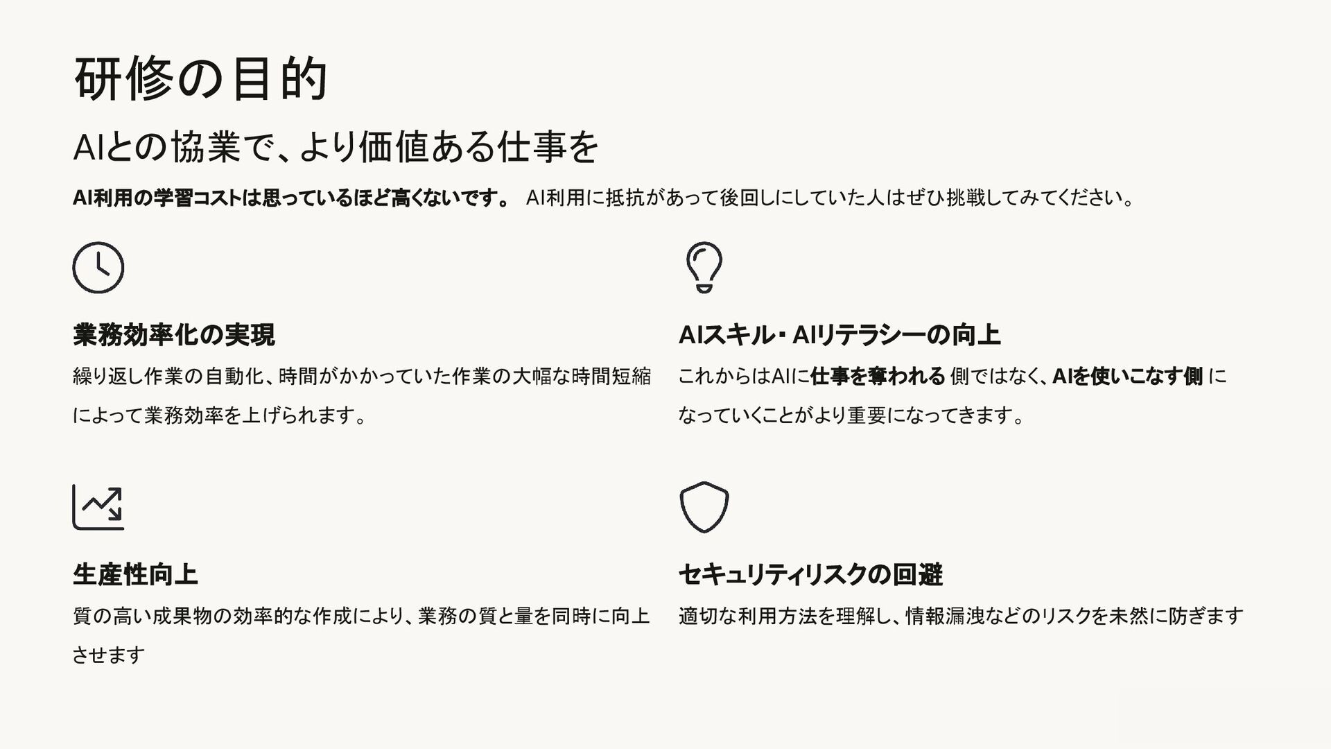 研修の目的 AI利用の学習コストは思っているほど高くないです。 AI利用に抵抗があって後回しにしていた人はぜひ挑戦してみてください。 業務効率化の実現 繰り返し作業の自動化、時間がかかっていた作業の大幅な時間短縮 によって業務効率を上げられます。 AIスキル・AIリテラシーの向上 これからはAIに仕事を奪われる 側ではなく、AIを使いこなす側 に