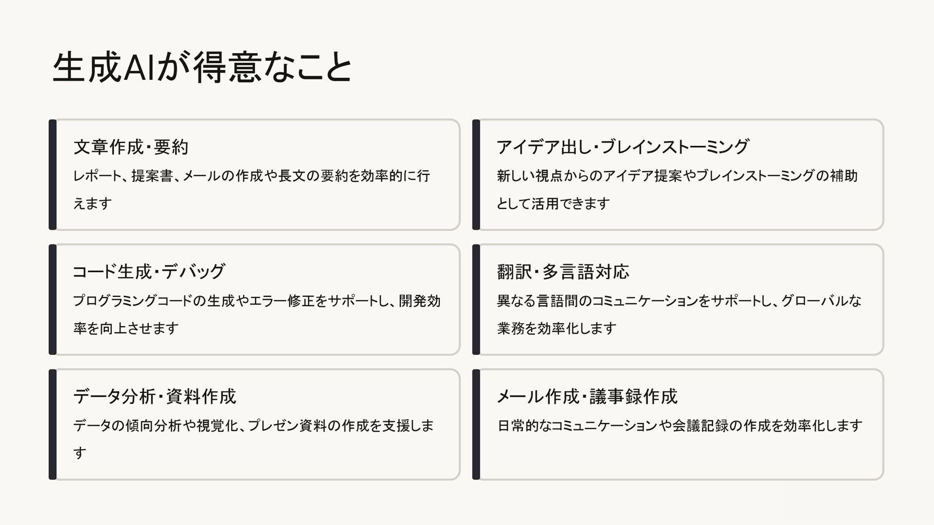 生成AIが得意なこと 文章作成・要約 レポート、提案書、メールの作成や長文の要約を効率的に行 えます アイデア出し・ブレインストーミング 新しい視点からのアイデア提案やブレインストーミングの補助 として活用できます コード生成・デバッグ プログラミングコードの生成やエラー修正をサポートし、開発効 率を向上させます