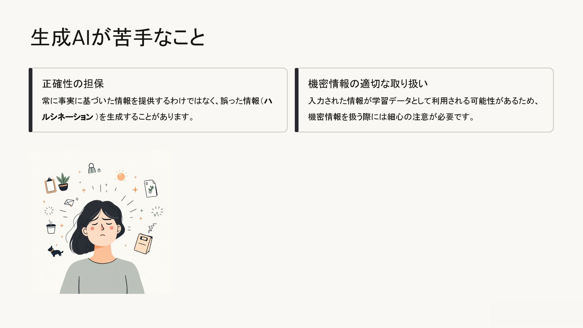 生成AIが苦手なこと 正確性の担保 常に事実に基づいた情報を提供するわけではなく、誤った情報(ハ ルシネーション )を生成することがあります。 機密情報の適切な取り扱い 入力された情報が学習データとして利用される可能性があるため、 機密情報を扱う際には細心の注意が必要です。