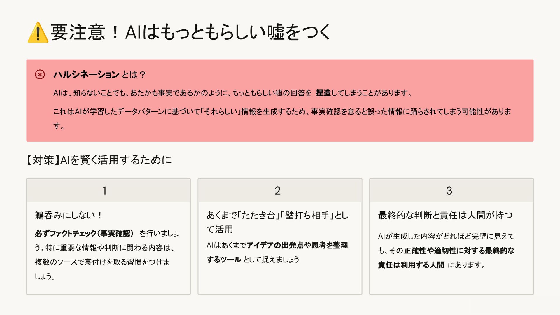 ⚠要注意!AIはもっともらしい嘘をつく ハルシネーション とは? AIは、知らないことでも、あたかも事実であるかのように、もっともらしい嘘の回答を 捏造してしまうことがあります。 これはAIが学習したデータパターンに基づいて「それらしい」情報を生成するため、事実確認を怠ると誤った情報に踊らされてしまう可能性がありま す。 【対策】AIを賢く活用するために 1 鵜呑みにしない!