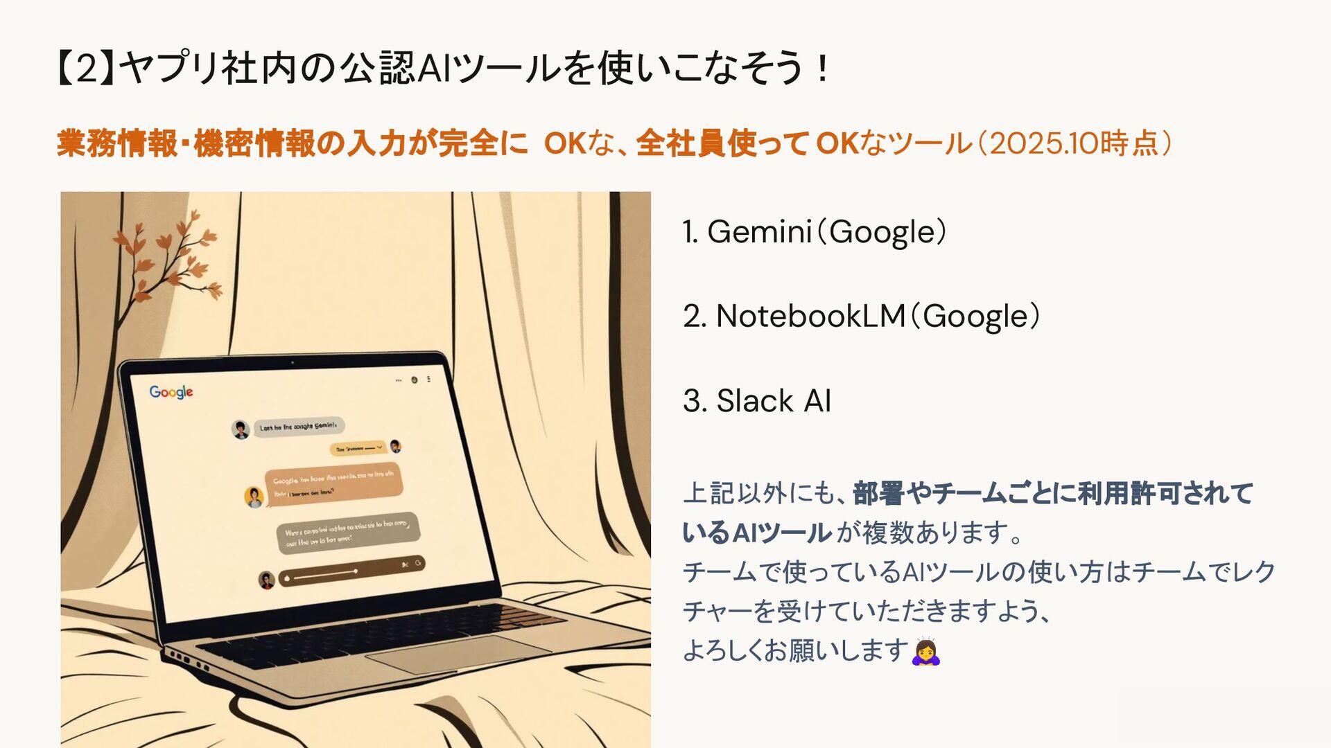 【2】ヤプリ社内の公認AIツールを使いこなそう! 業務情報・機密情報の入力が完全に OKな、全社員使って OKなツール(2025.10時点) 1. Gemini(Google) 2. NotebookLM(Google) 3. Slack