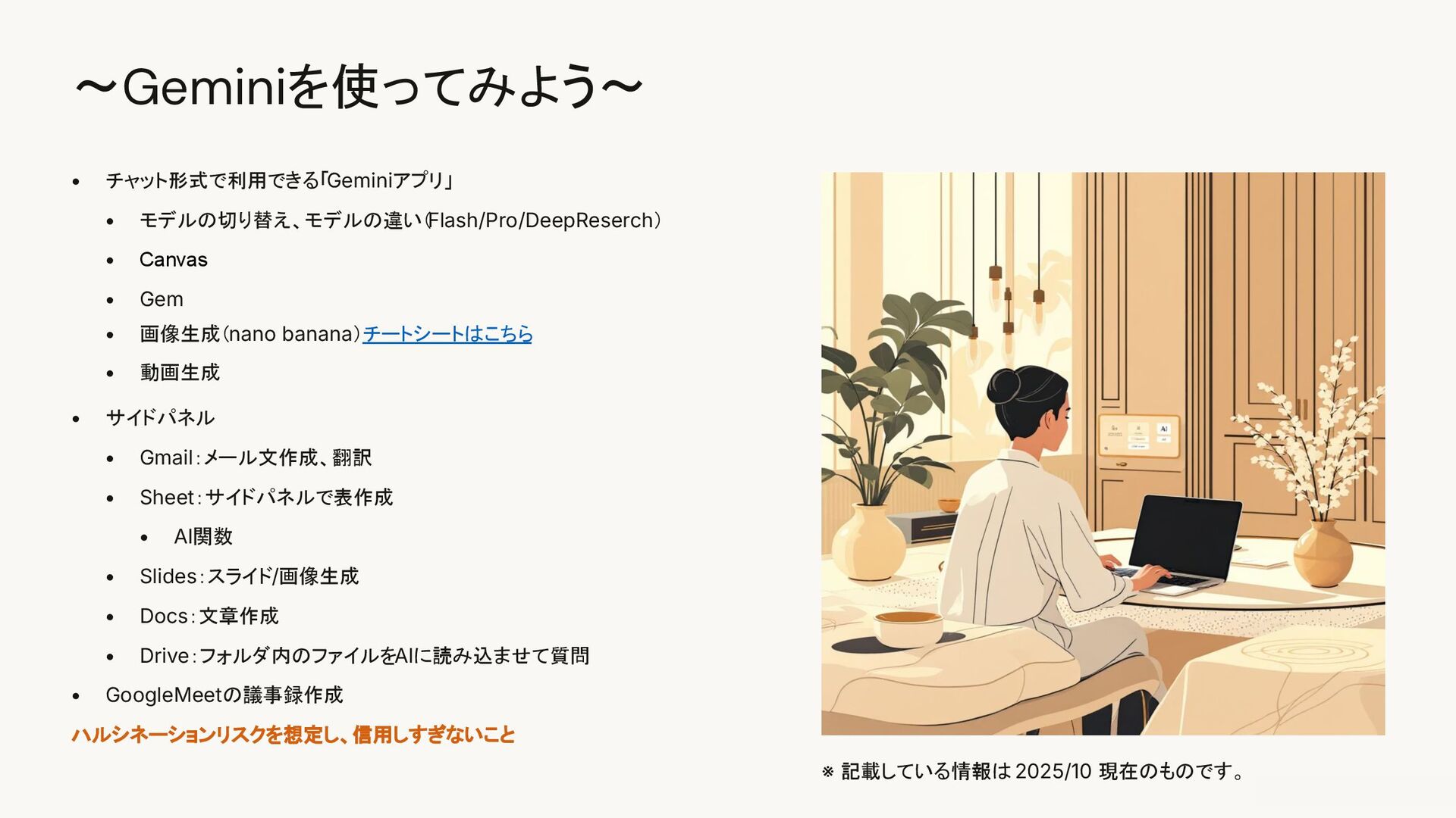 • 動画生成 • 画像生成(nano banana)チートシートはこちら • サイドパネル • Gmail:メール文作成、翻訳 • Sheet:サイドパネルで表作成 • AI関数 • Slides:スライド/画像生成 • Docs:文章作成 • Drive:フォルダ内のファイルをAIに読み込ませて質問 • GoogleMeetの議事録作成 ハルシネーションリスクを想定し、信用しすぎないこと ※ 記載している情報は 2025/10 現在のものです。