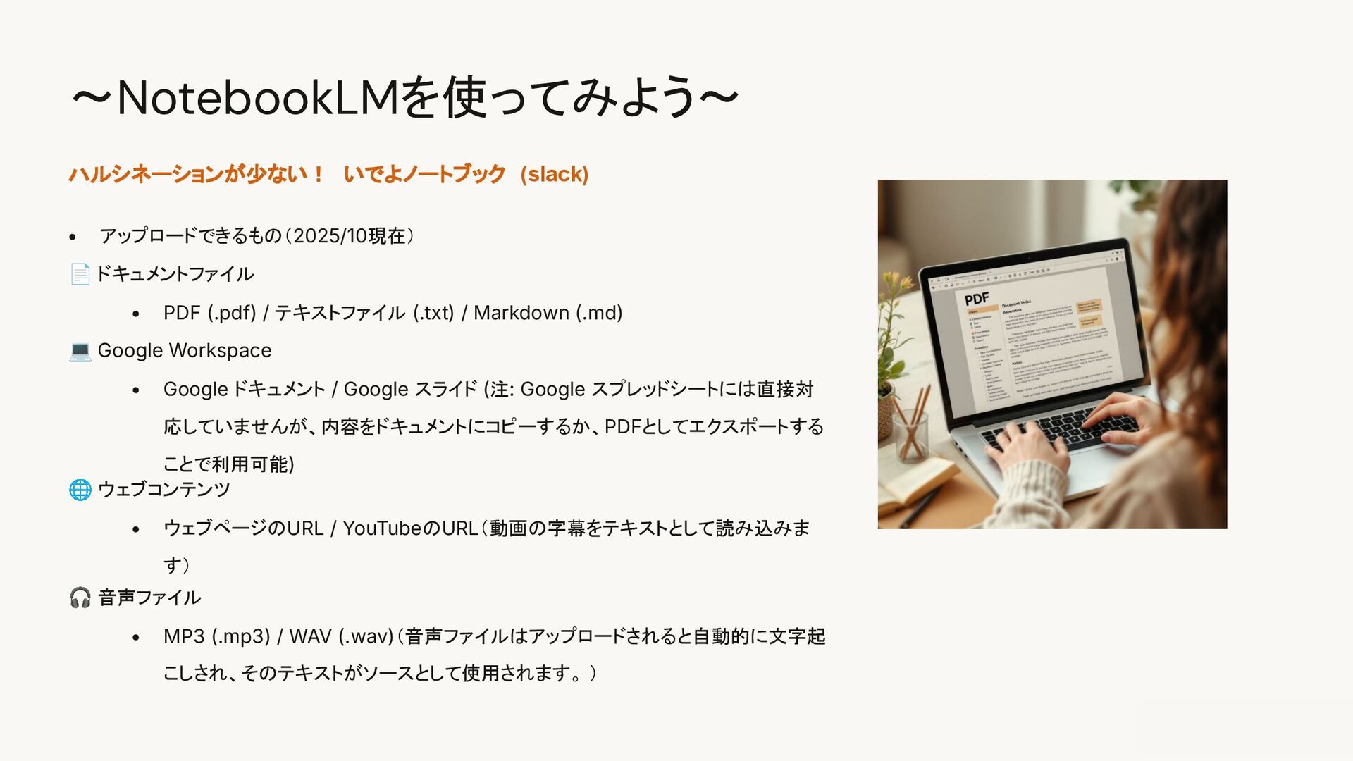 〜NotebookLMを使ってみよう〜 ハルシネーションが少ない! いでよノートブック (slack) • アップロードできるもの(2025/10現在) 📄 ドキュメントファイル • PDF (.pdf)