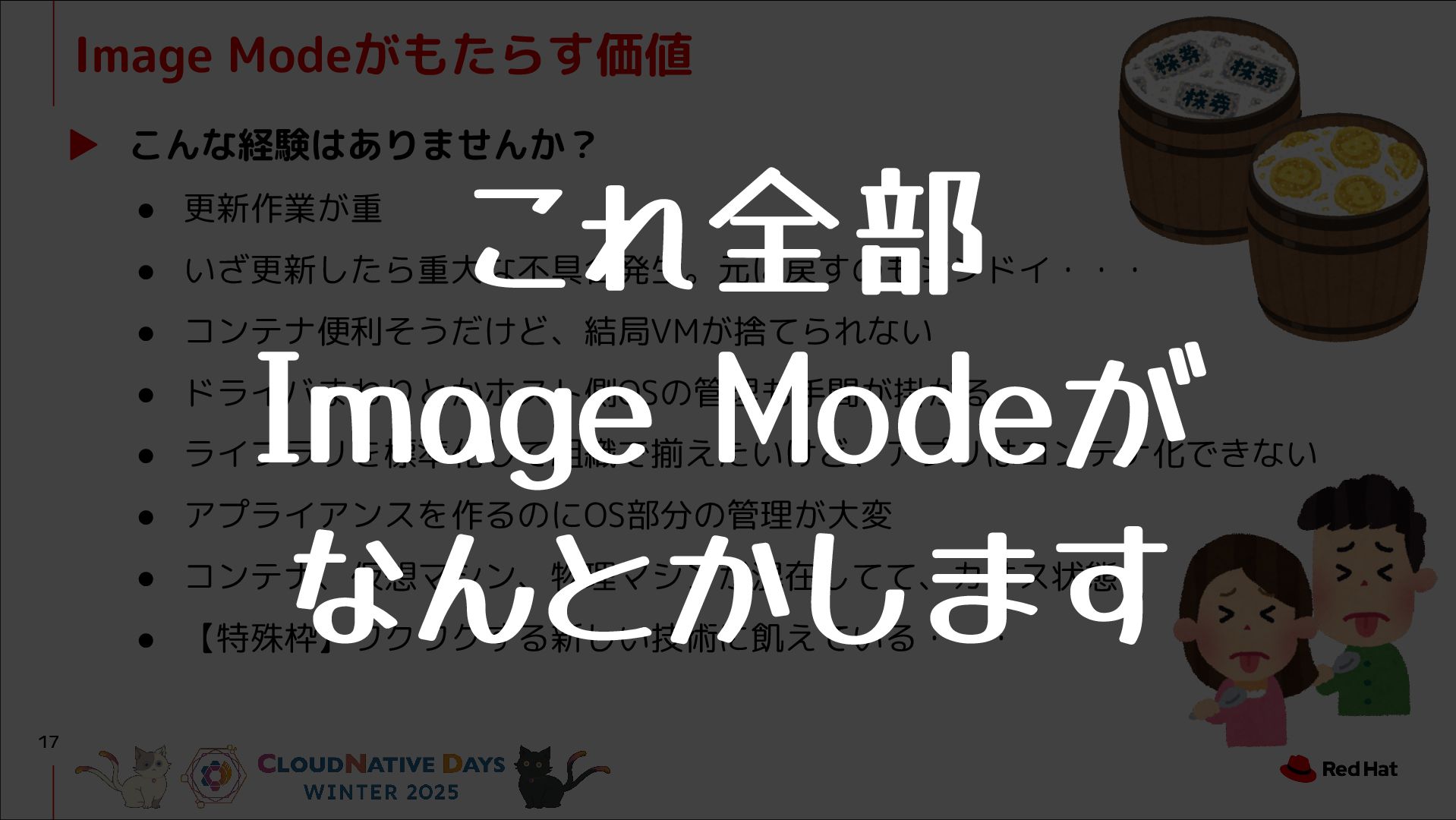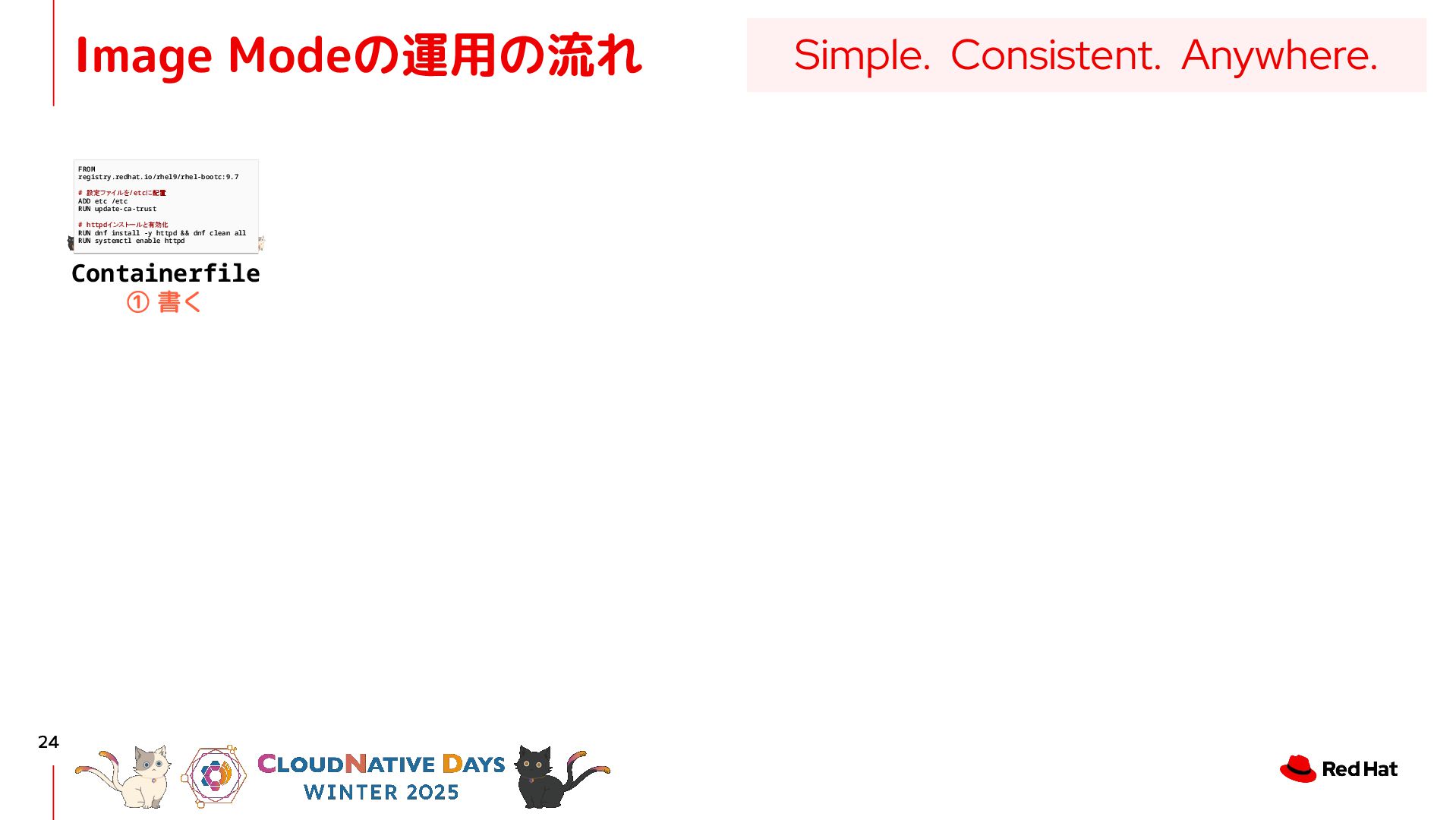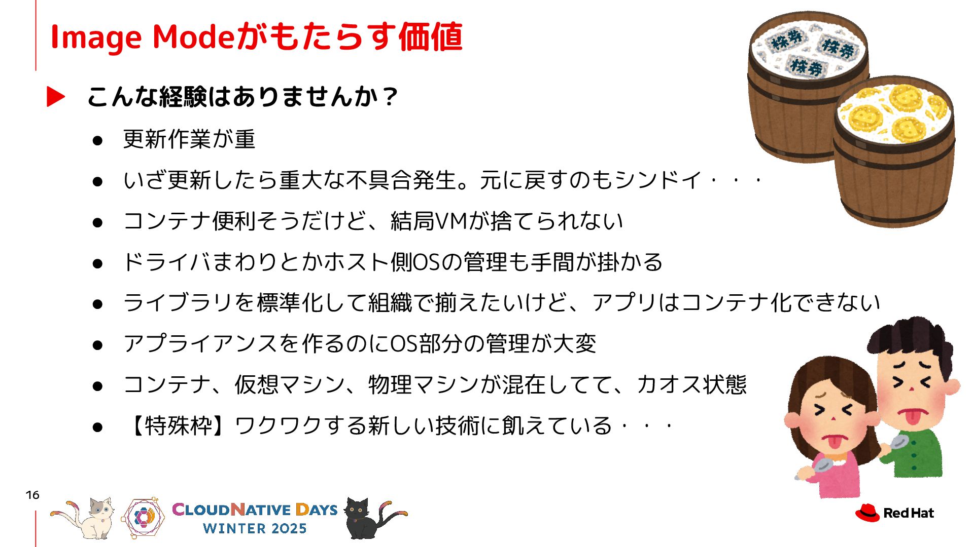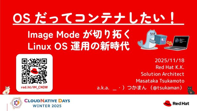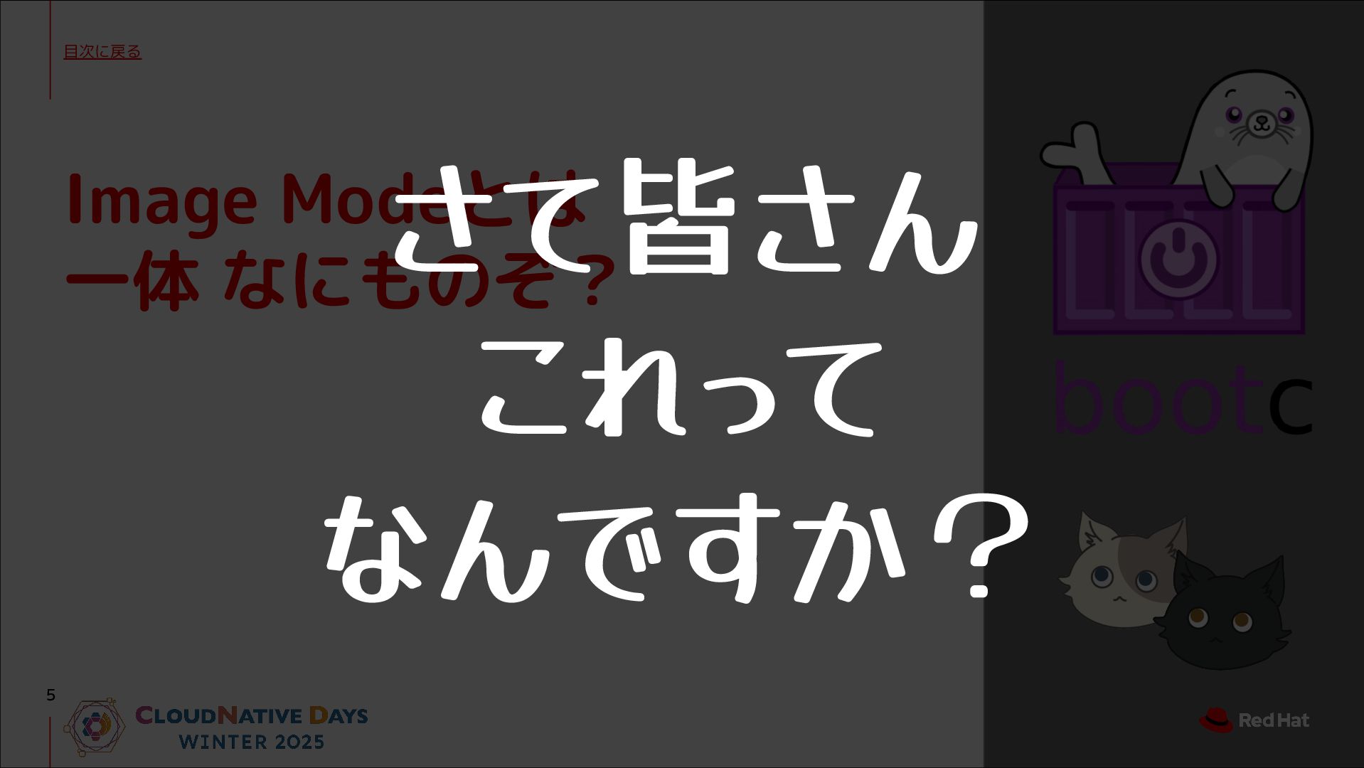 CNDW2025における Track B 2025/11/18 15:20-16:00「OSだってコンテナしたい❗Image Modeが切り拓くLinux OS運用の新時代」での登壇資料です。
