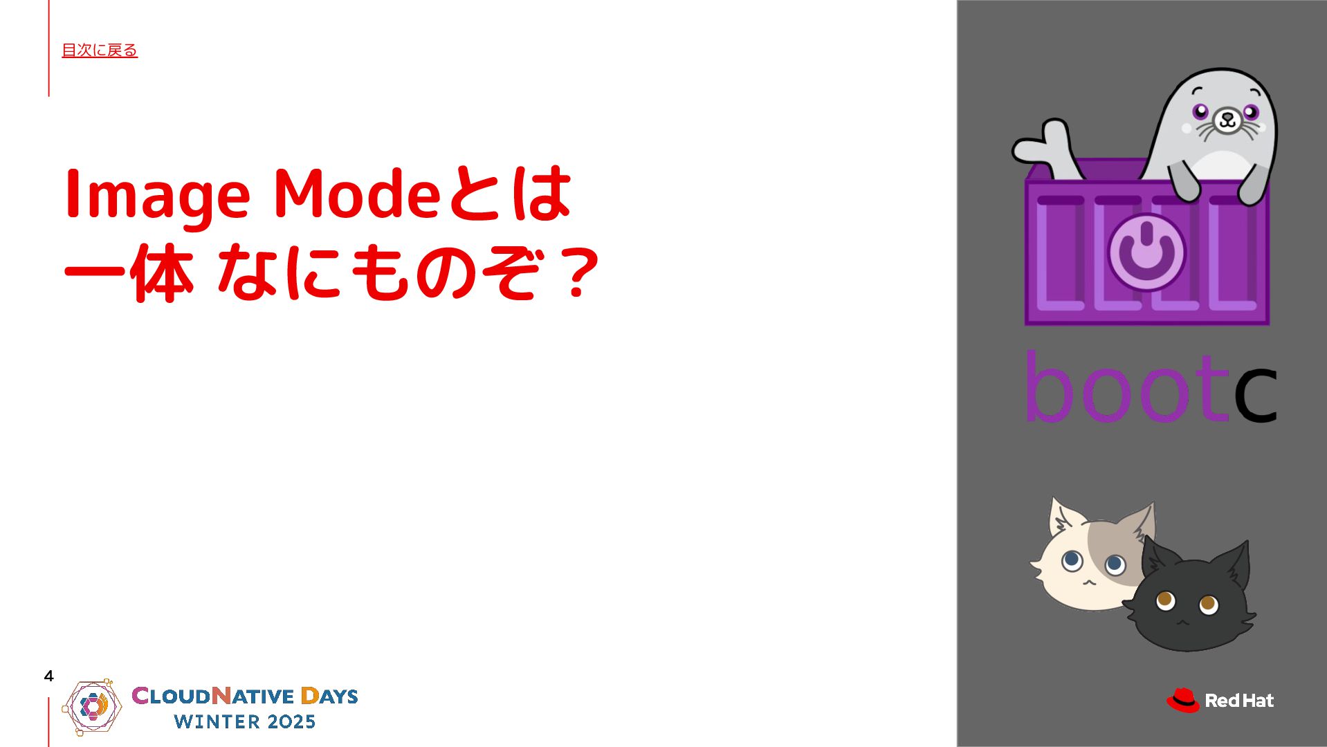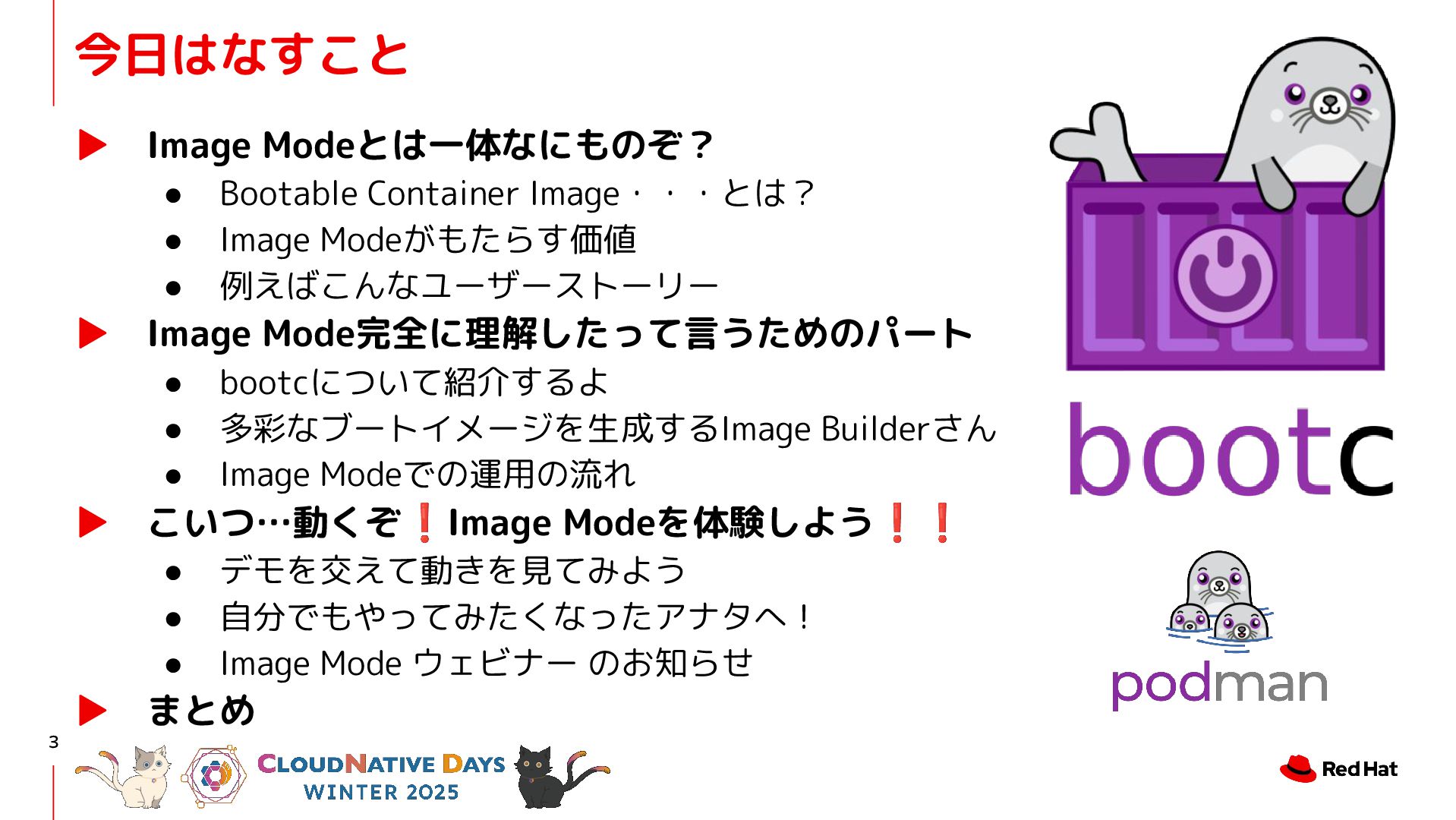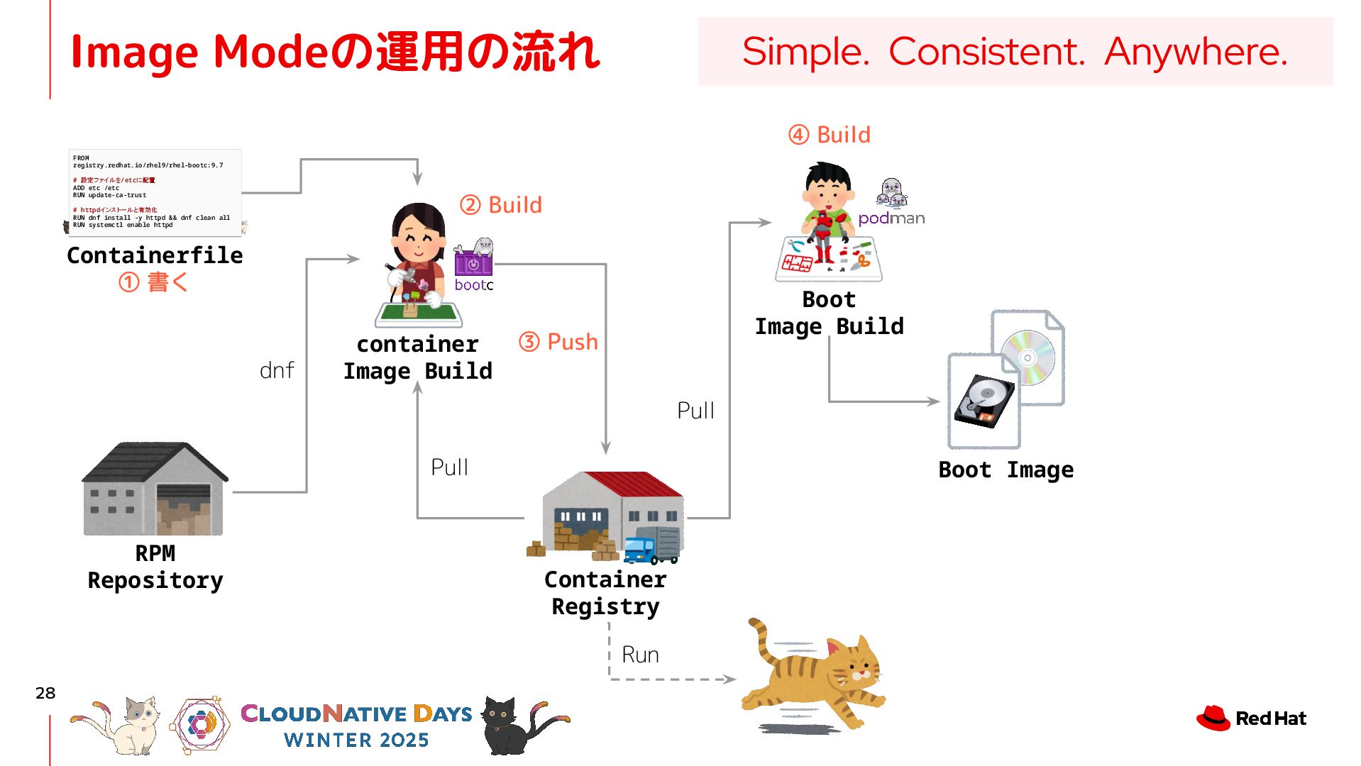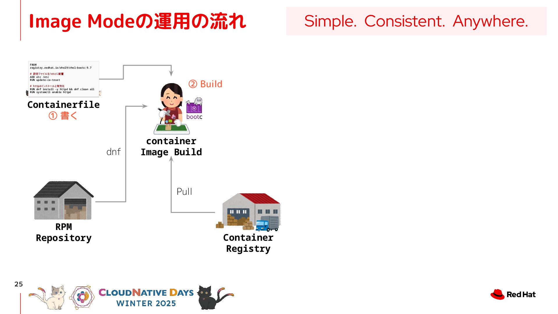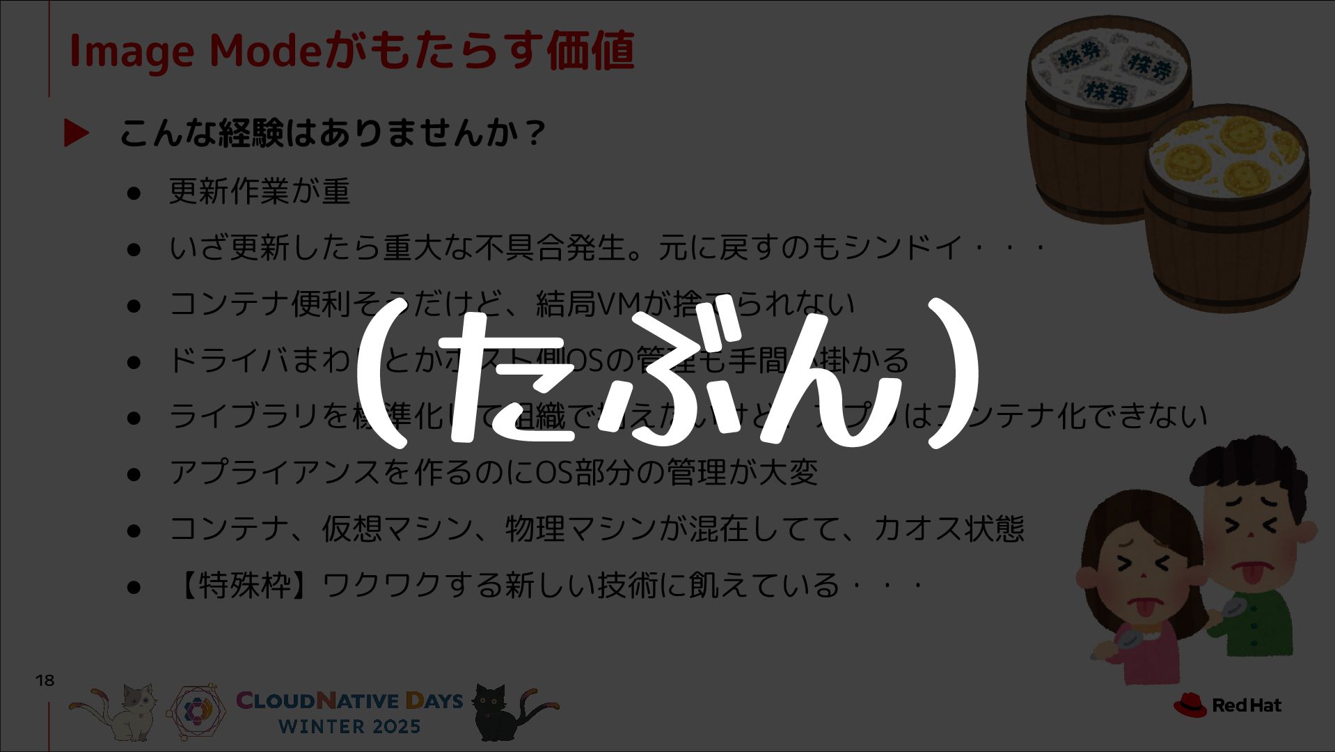 CNDW2025における Track B 2025/11/18 15:20-16:00「OSだってコンテナしたい❗Image Modeが切り拓くLinux OS運用の新時代」での登壇資料です。