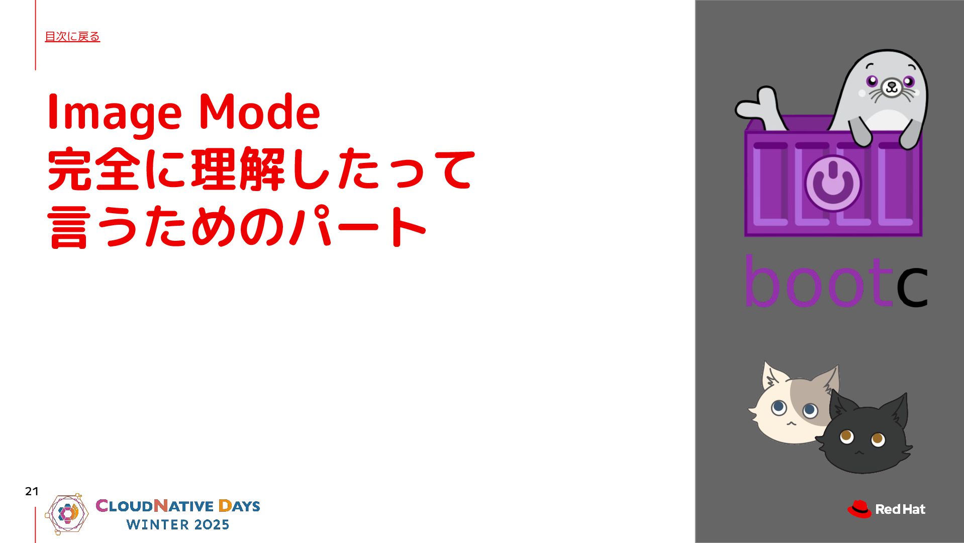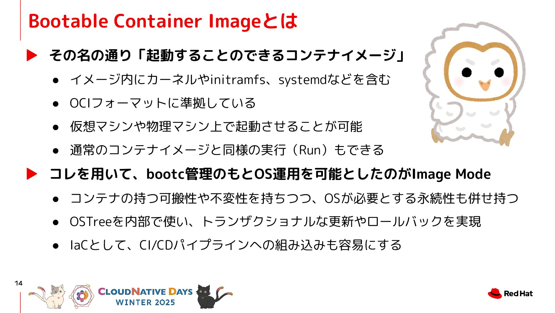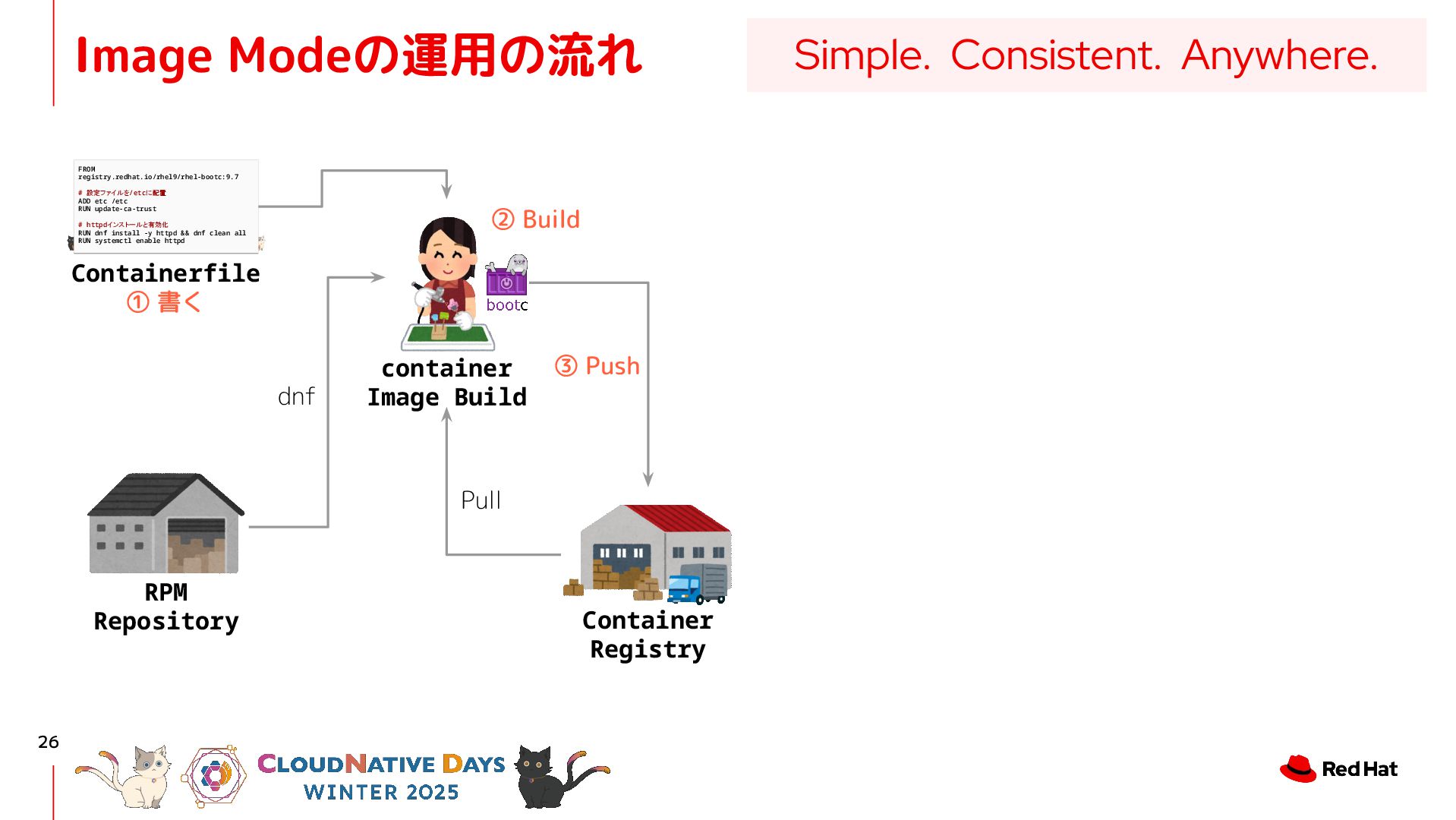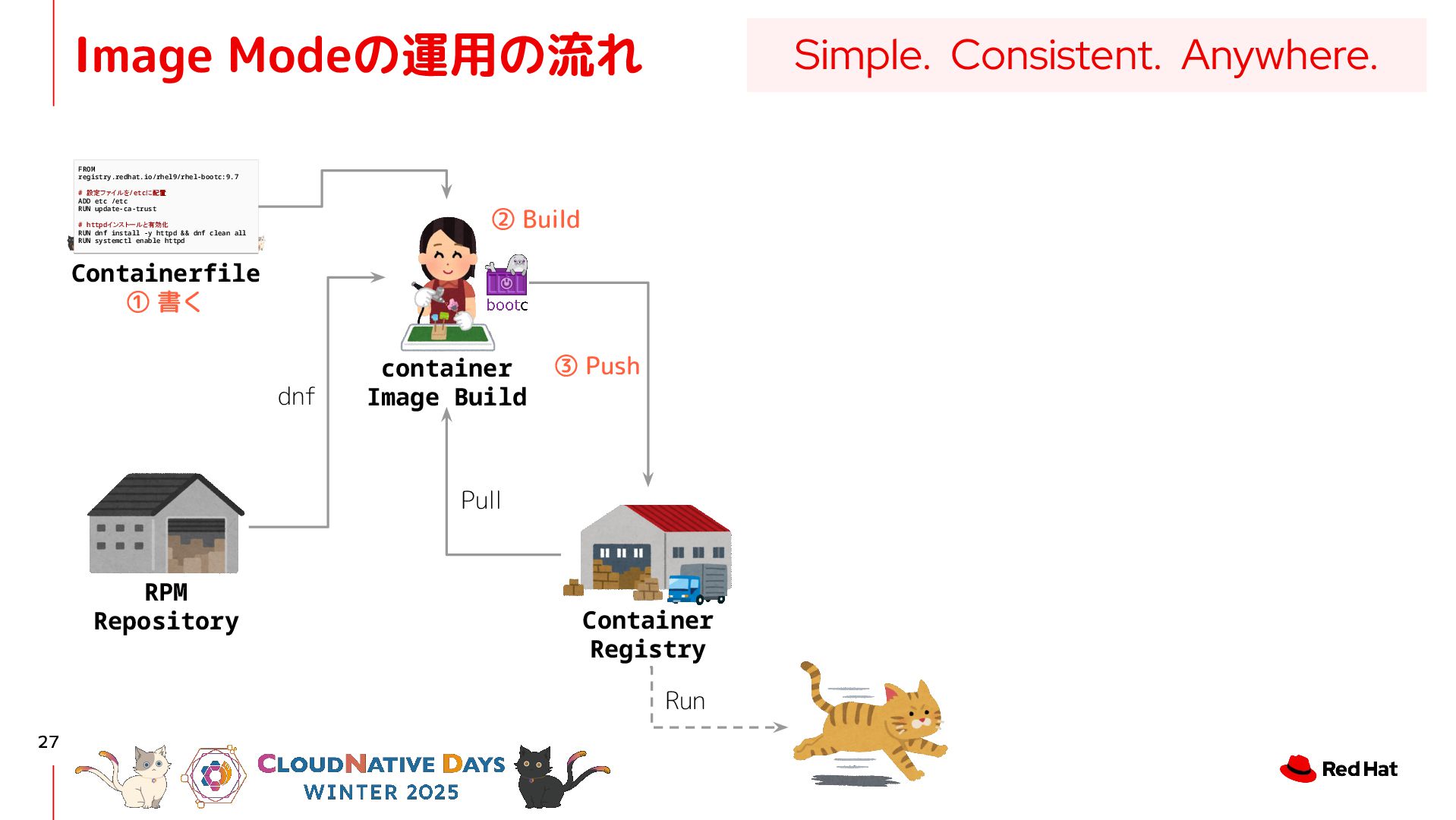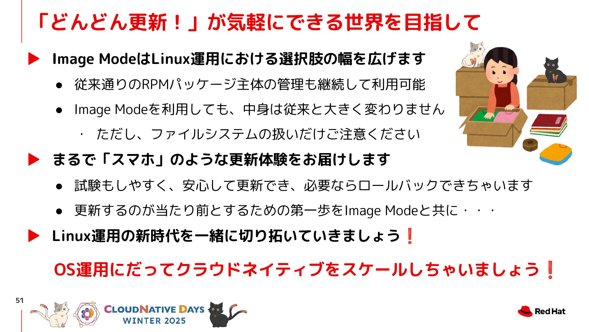 CNDW2025における Track B 2025/11/18 15:20-16:00「OSだってコンテナしたい❗Image Modeが切り拓くLinux OS運用の新時代」での登壇資料です。