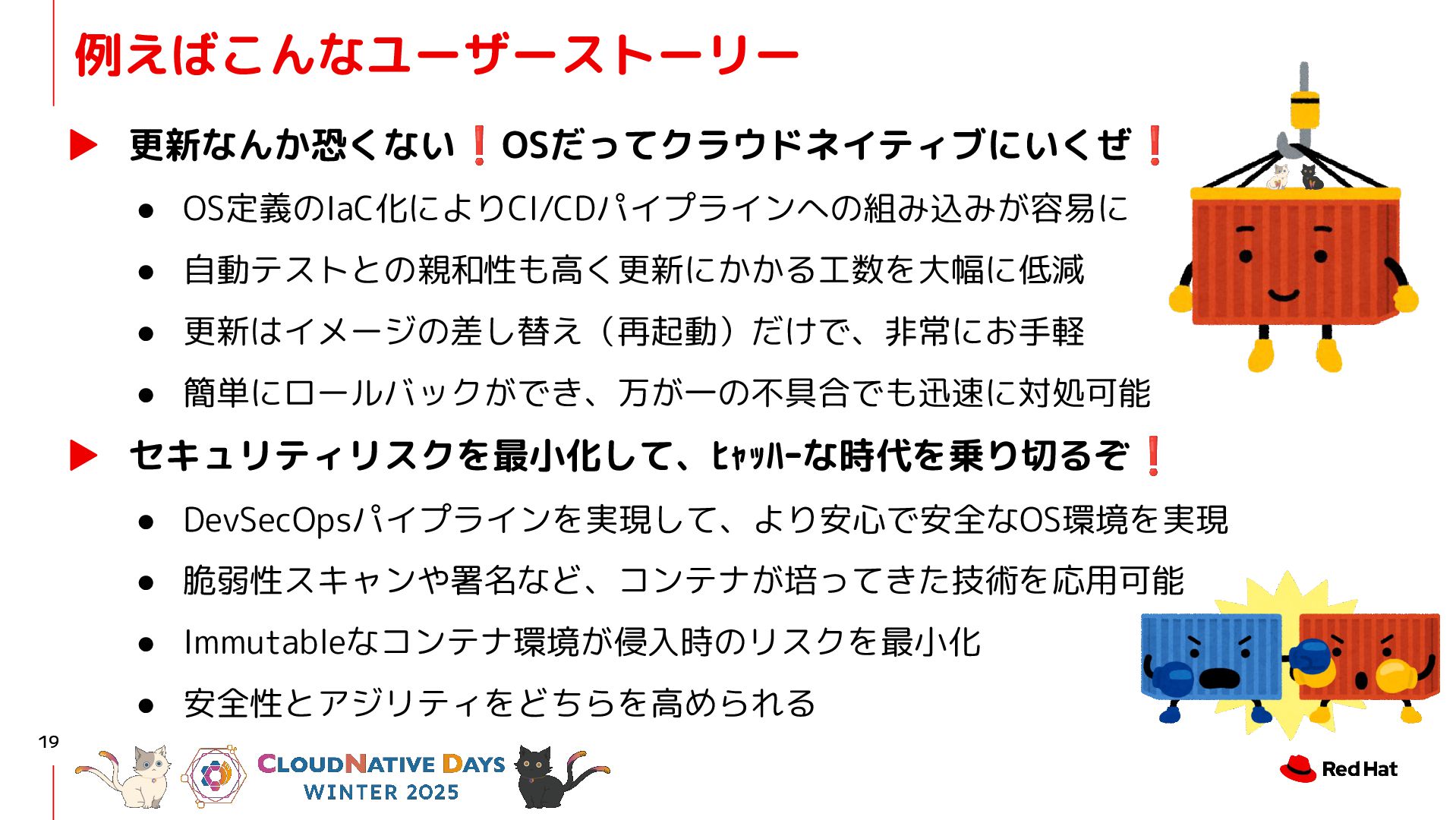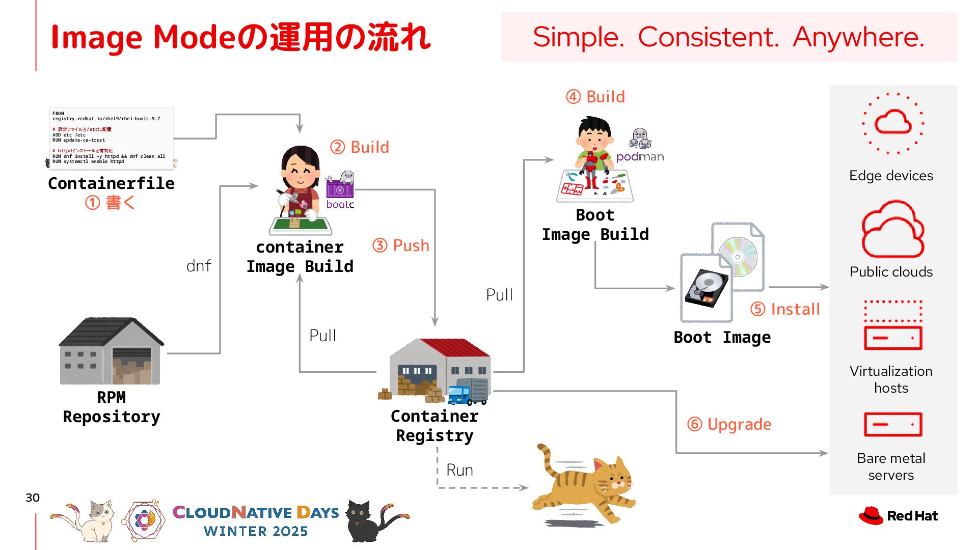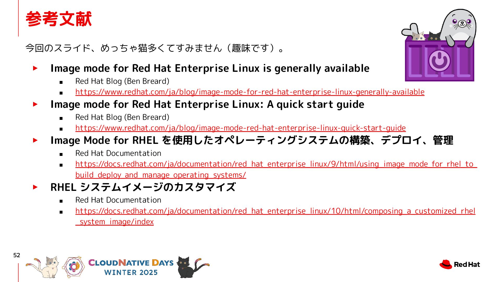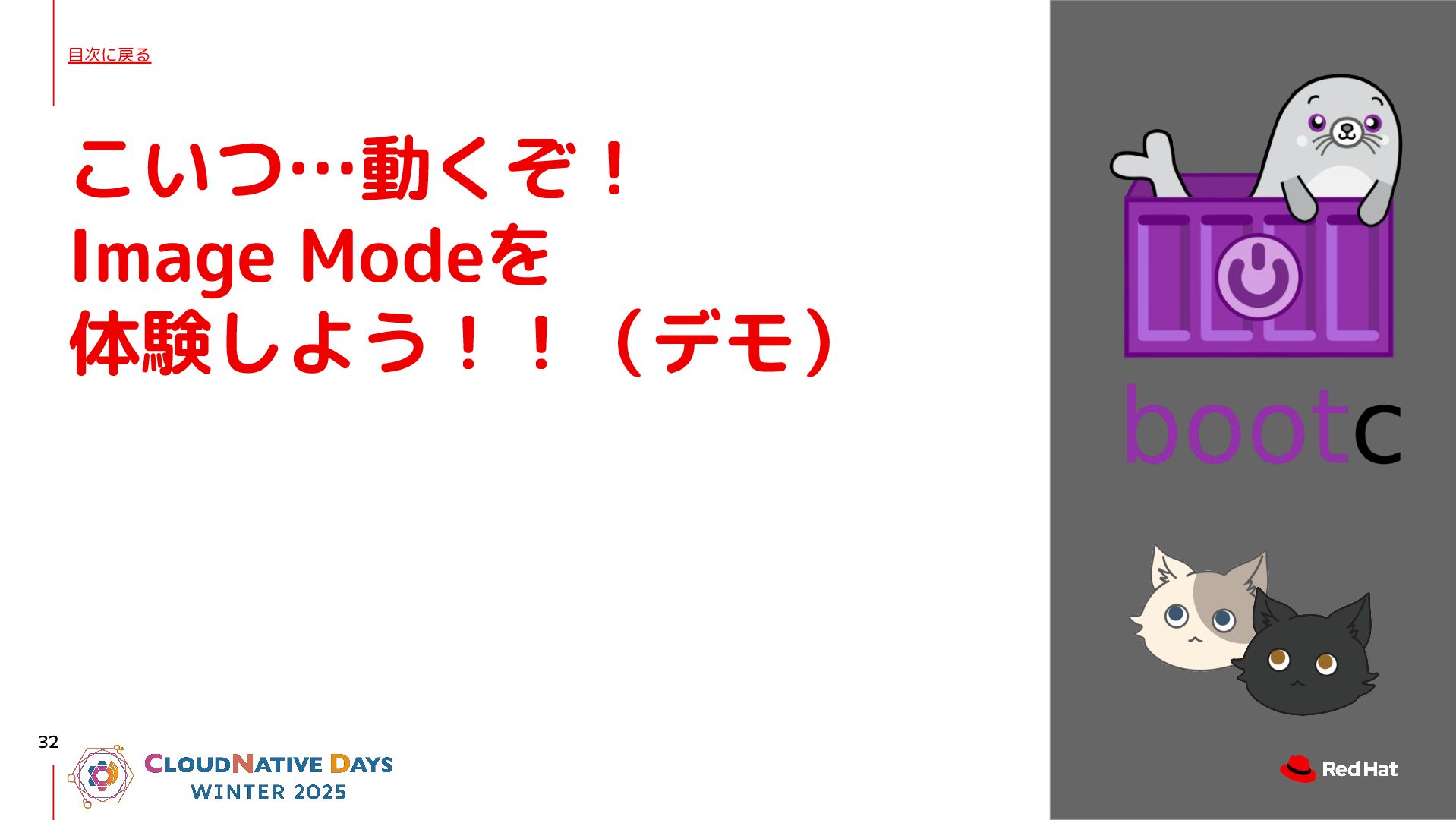 CNDW2025における Track B 2025/11/18 15:20-16:00「OSだってコンテナしたい❗Image Modeが切り拓くLinux OS運用の新時代」での登壇資料です。
