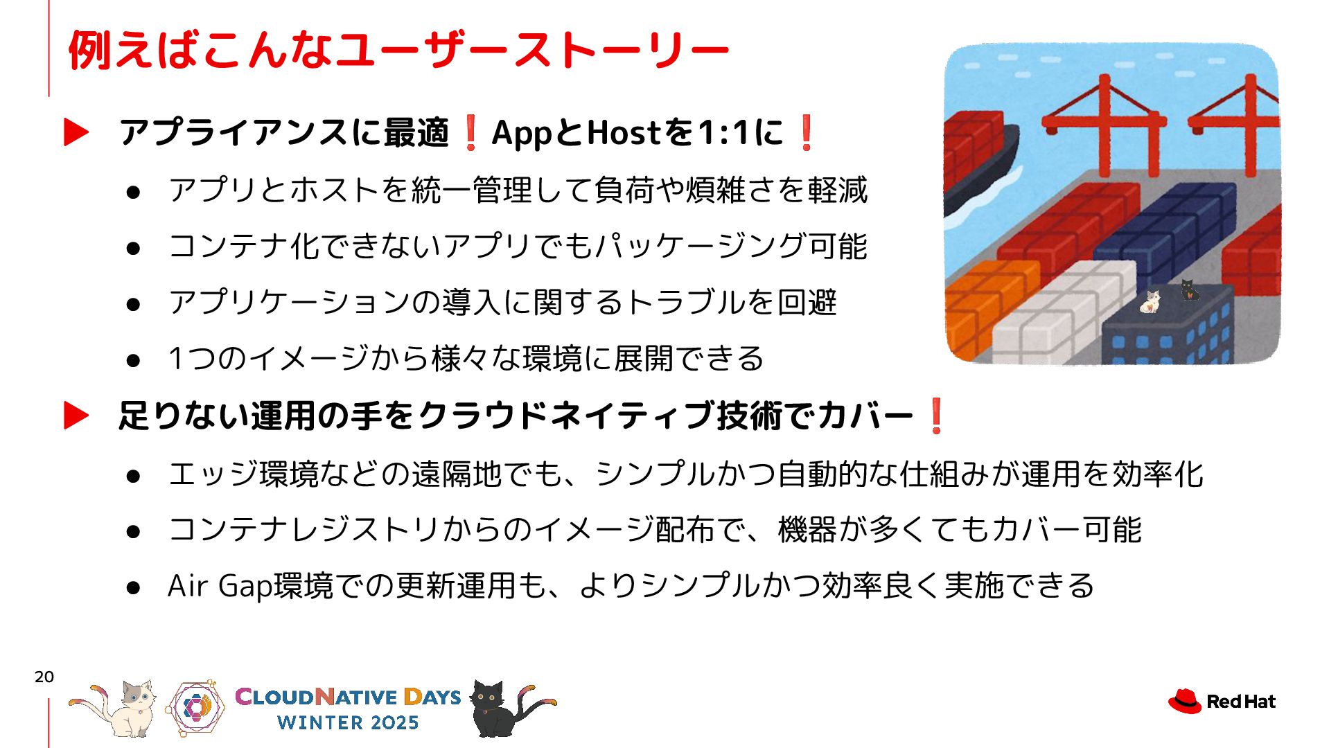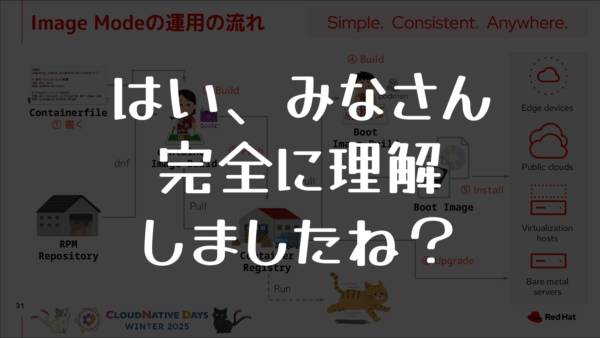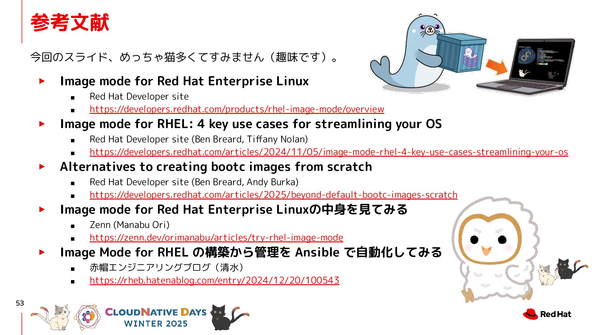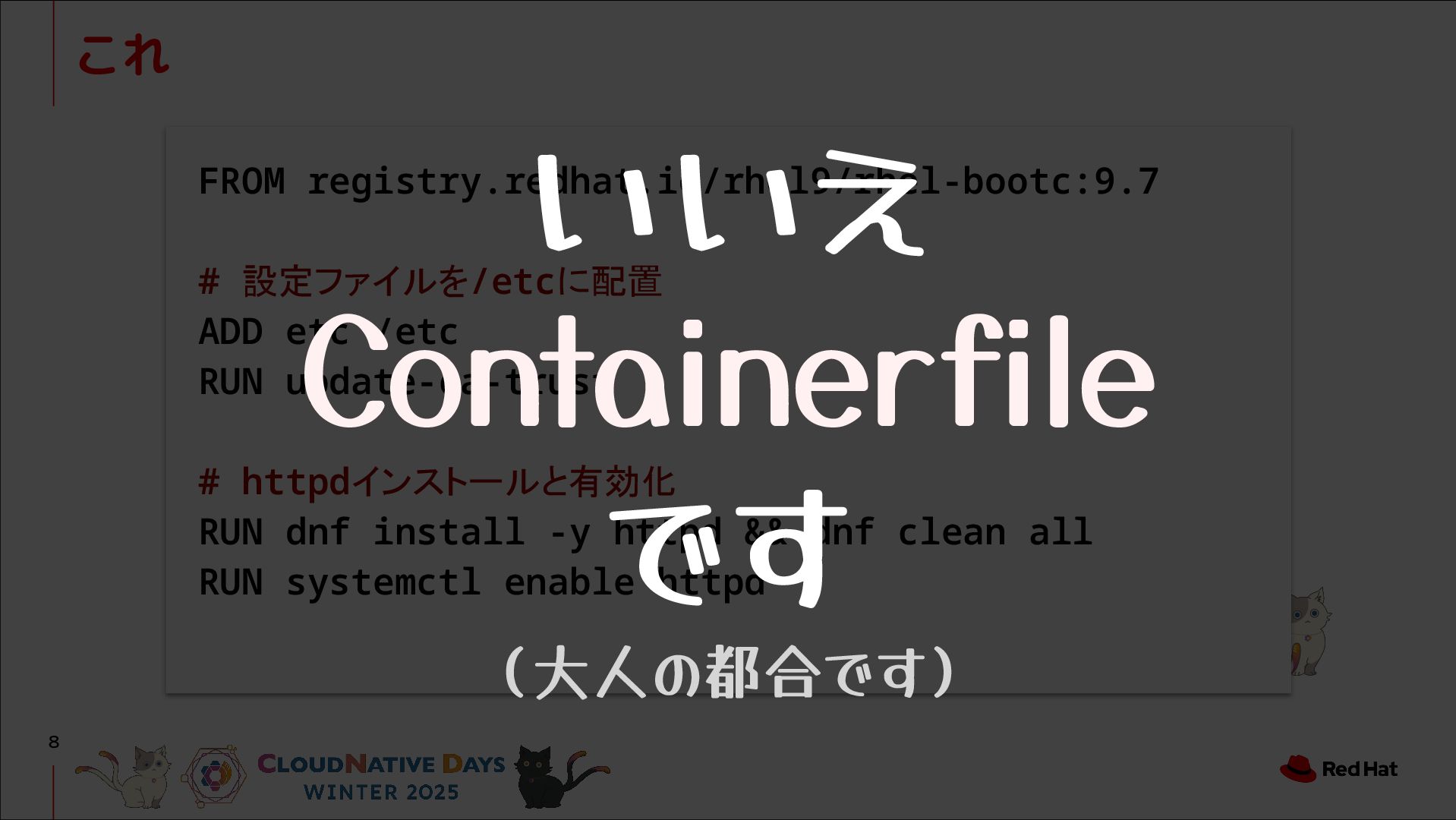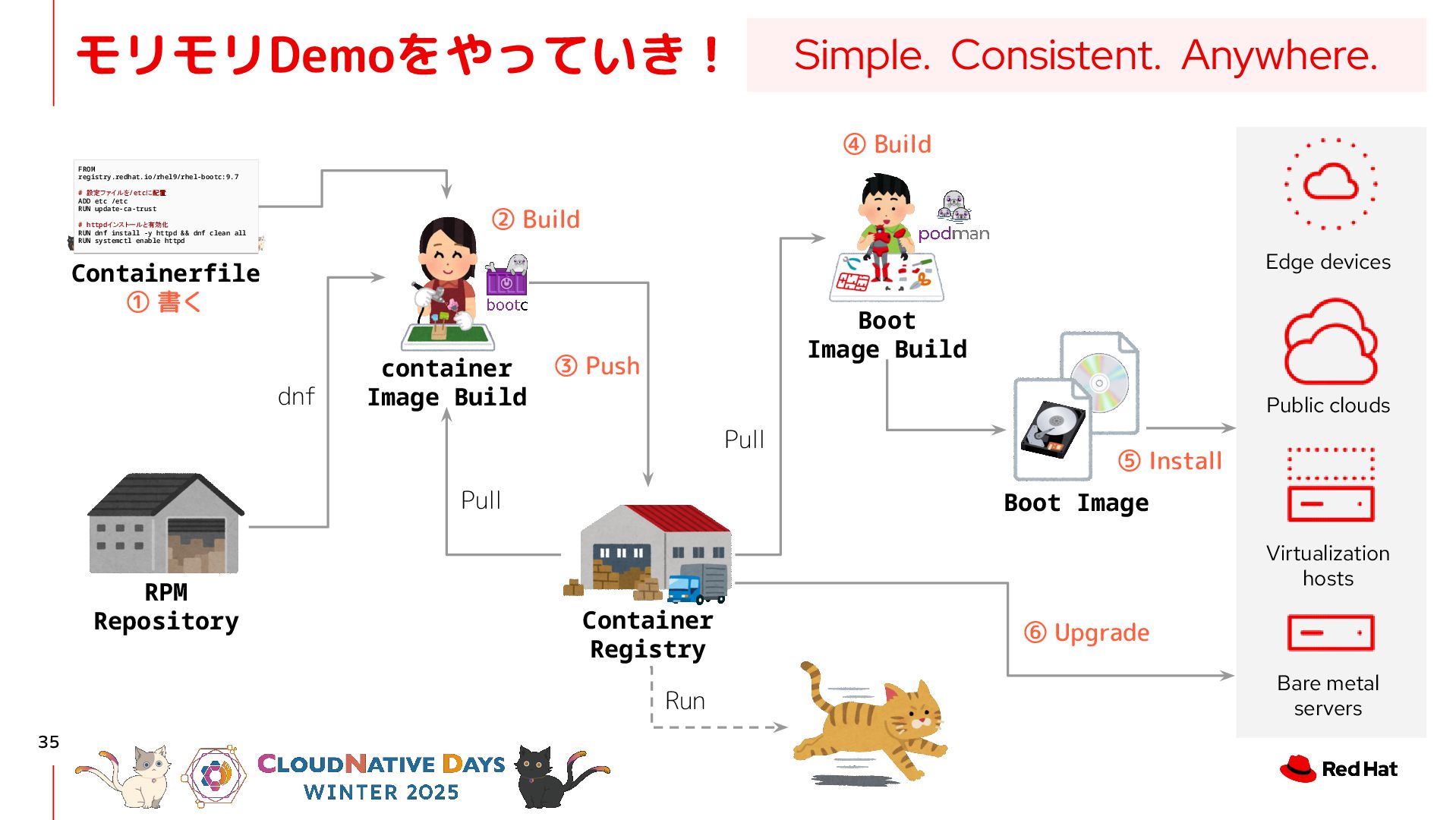 CNDW2025における Track B 2025/11/18 15:20-16:00「OSだってコンテナしたい❗Image Modeが切り拓くLinux OS運用の新時代」での登壇資料です。