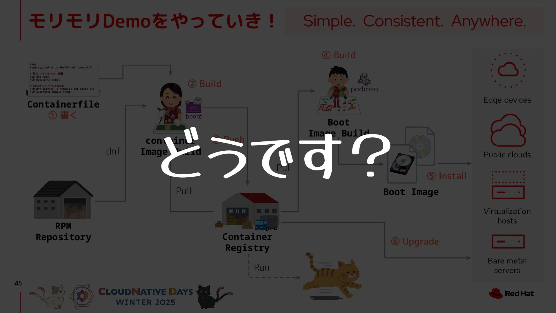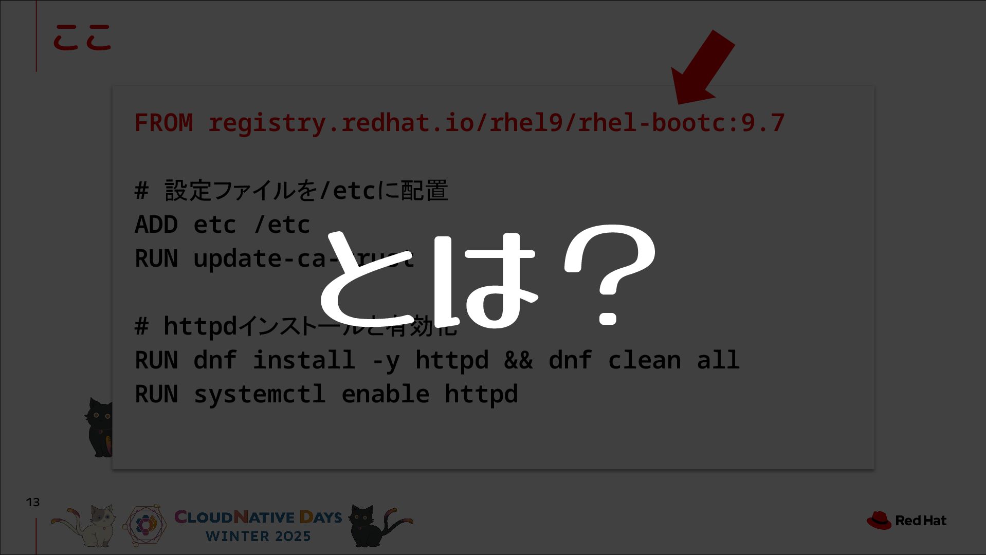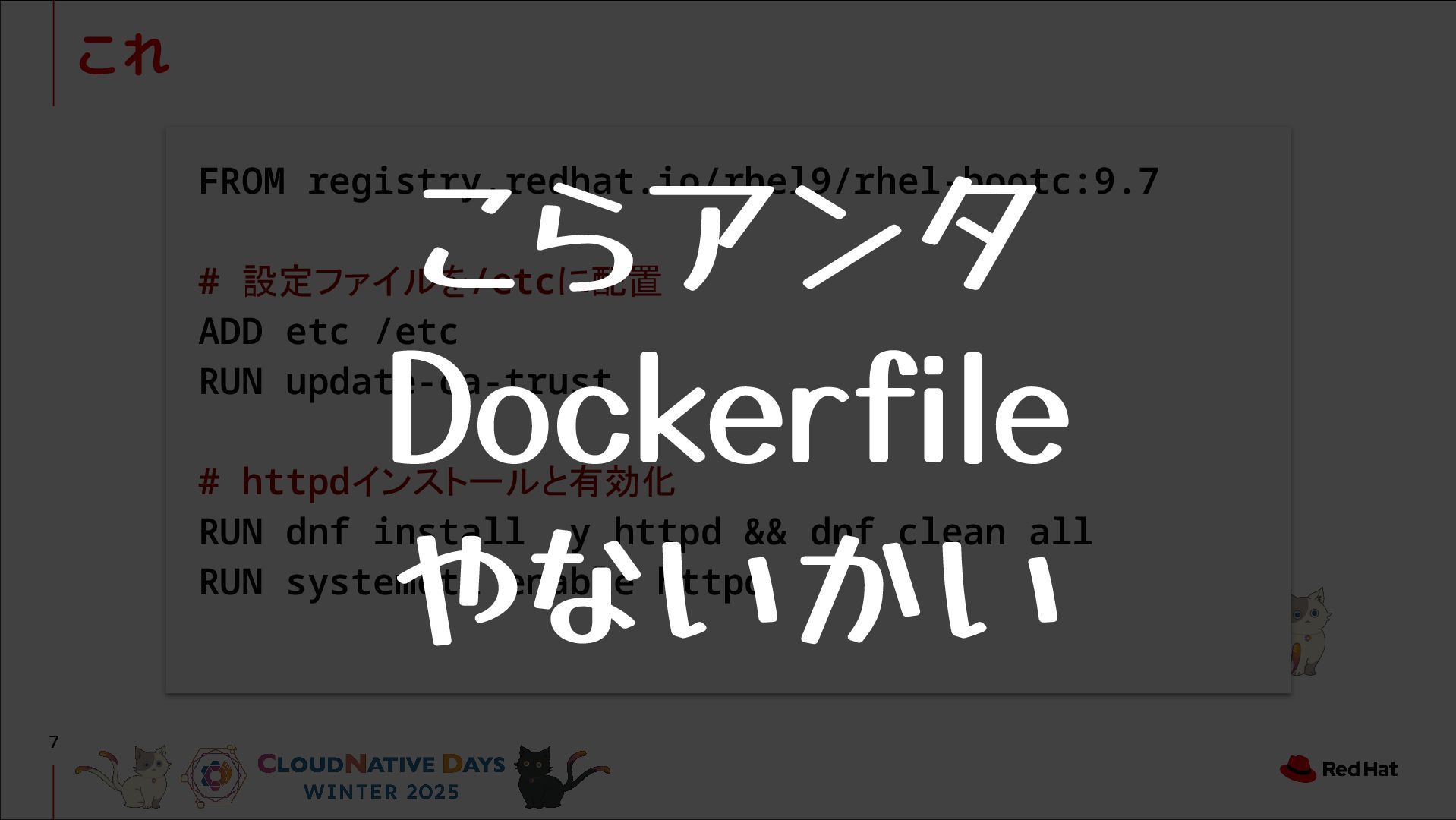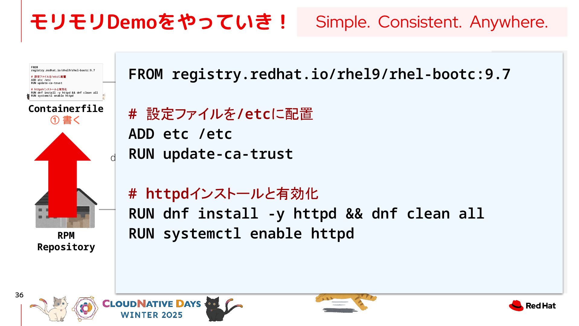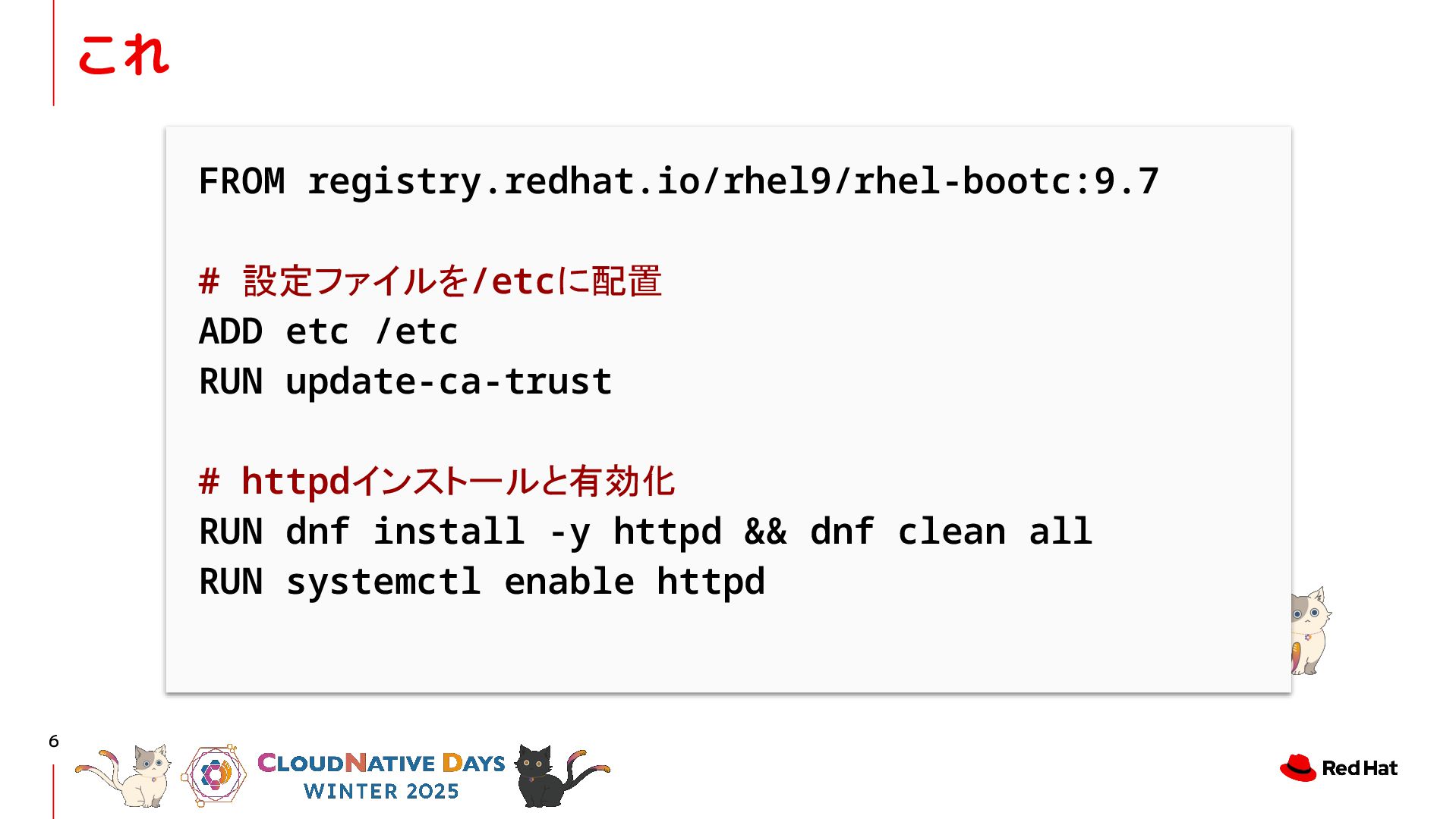 CNDW2025における Track B 2025/11/18 15:20-16:00「OSだってコンテナしたい❗Image Modeが切り拓くLinux OS運用の新時代」での登壇資料です。