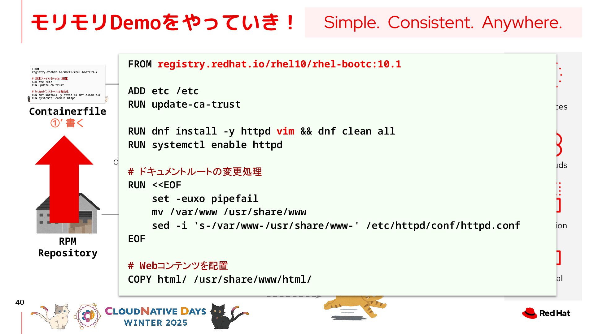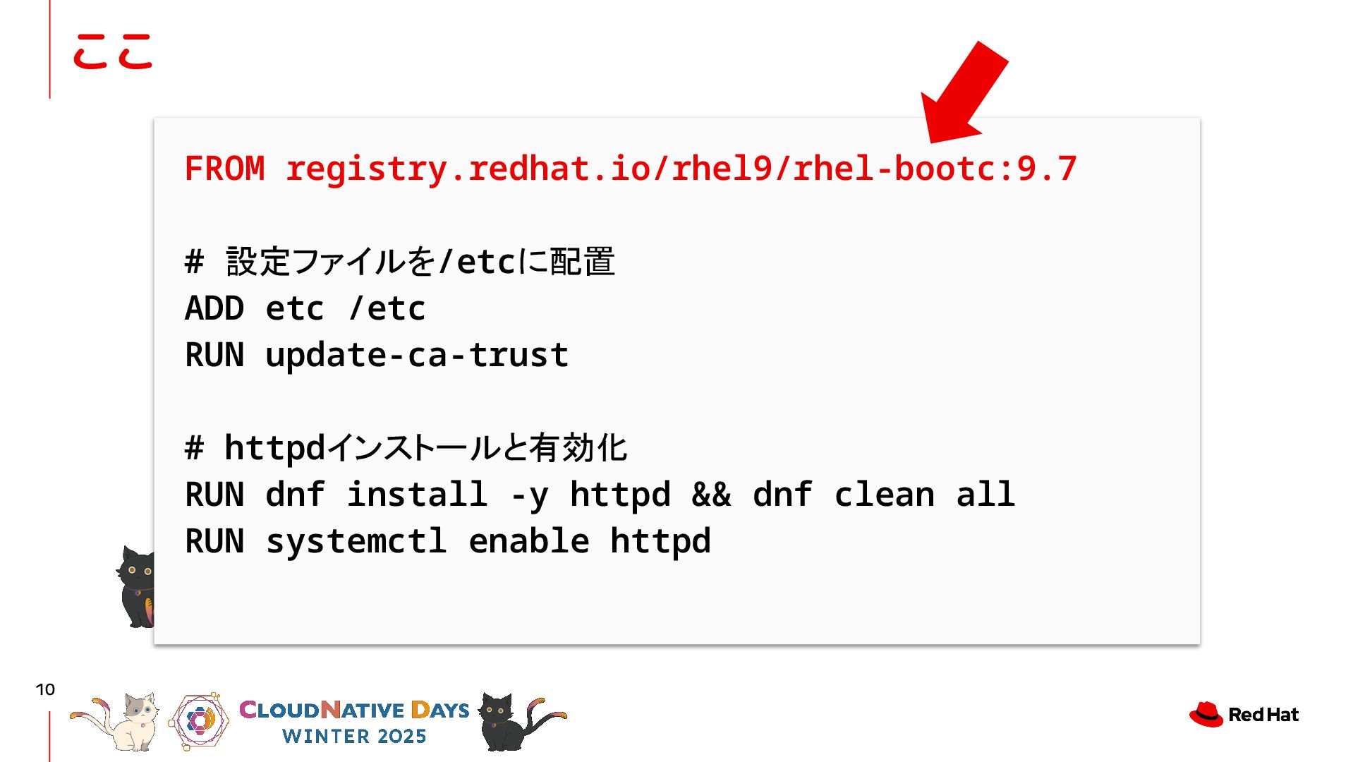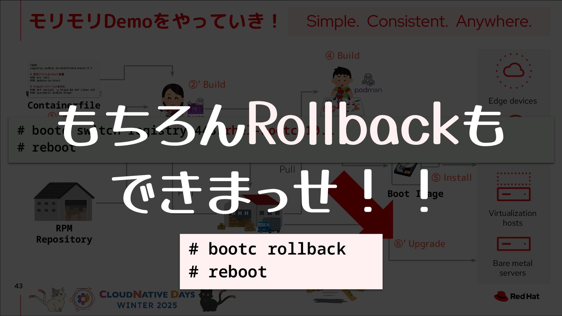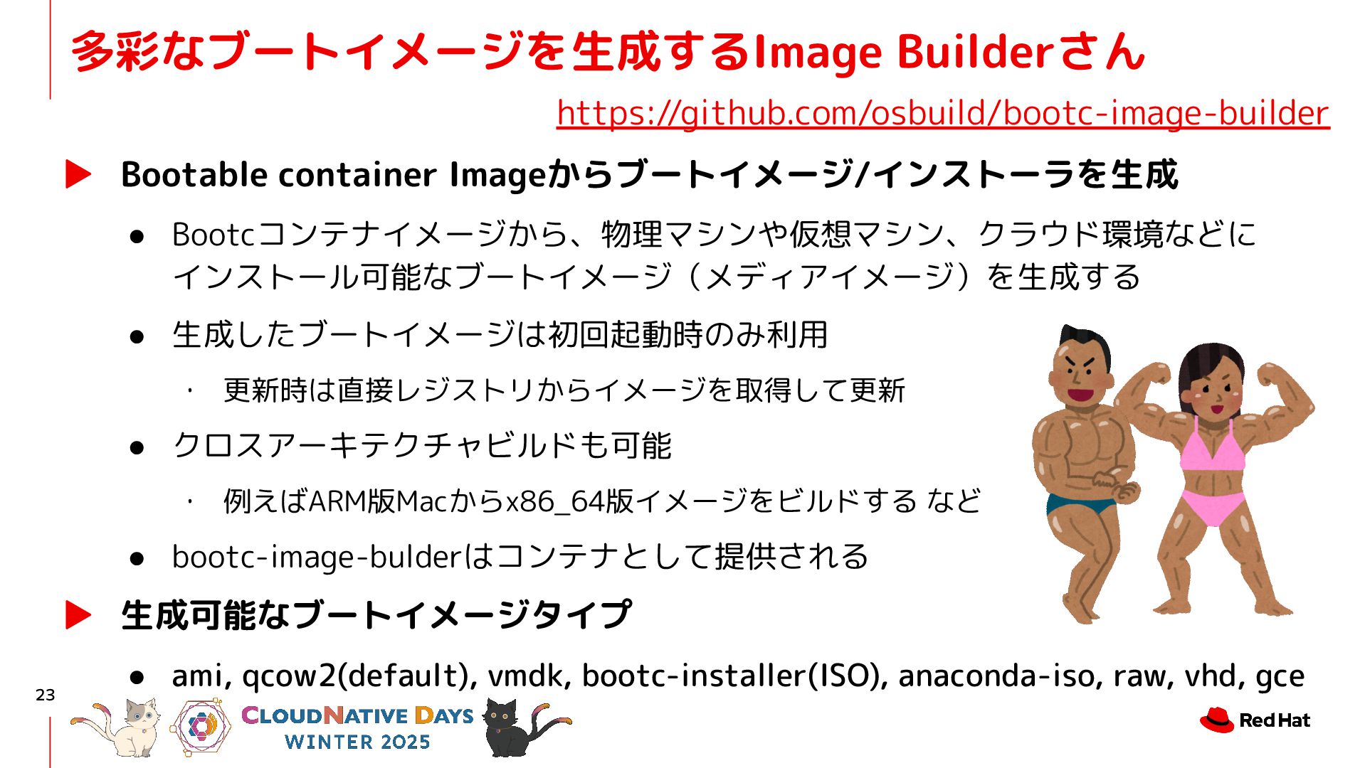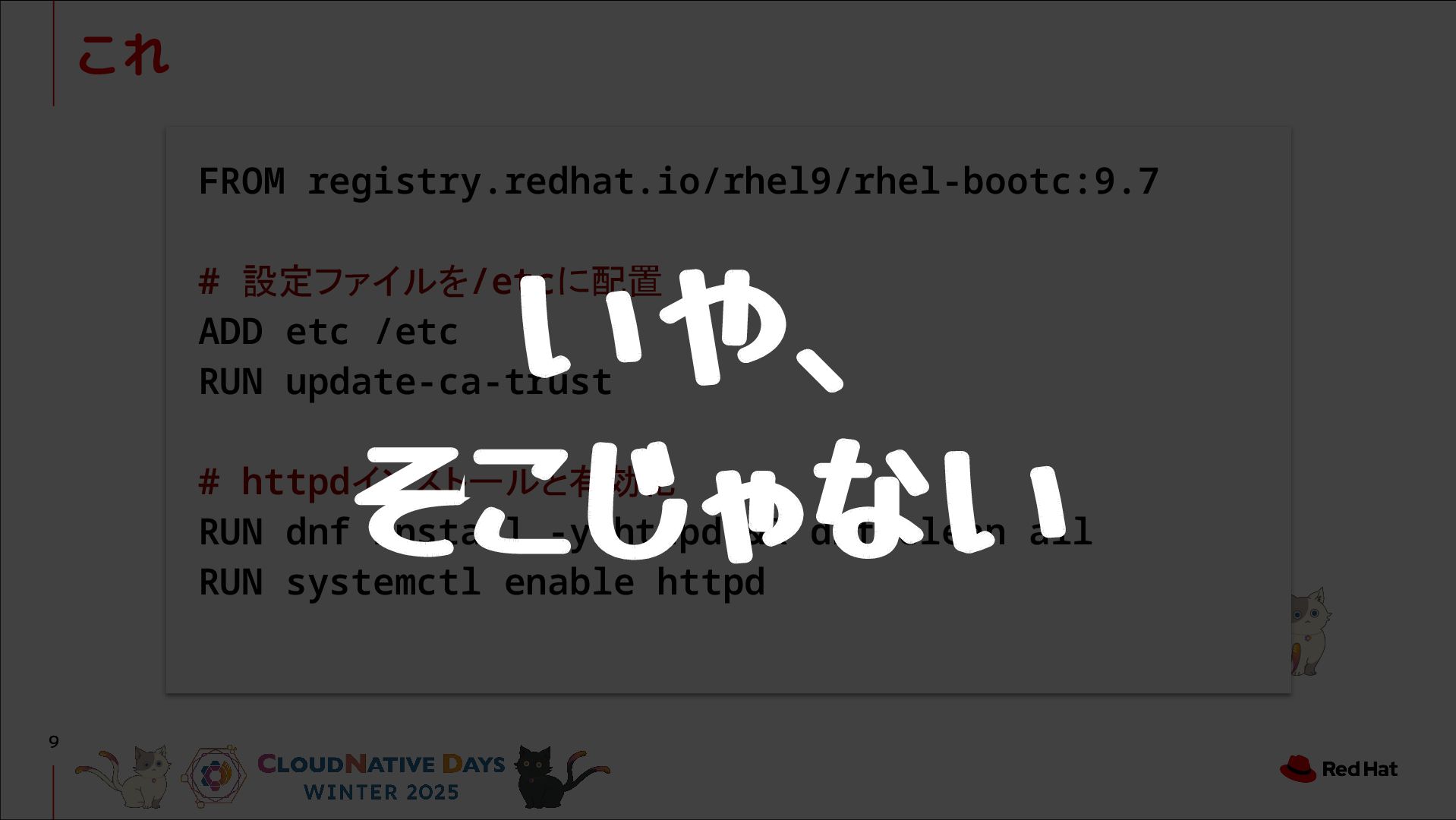 CNDW2025における Track B 2025/11/18 15:20-16:00「OSだってコンテナしたい❗Image Modeが切り拓くLinux OS運用の新時代」での登壇資料です。