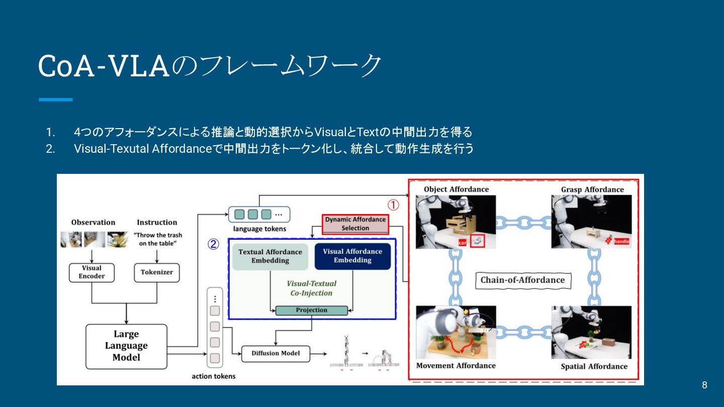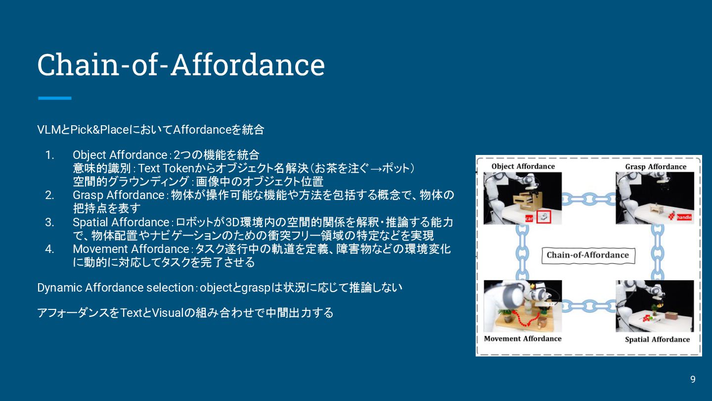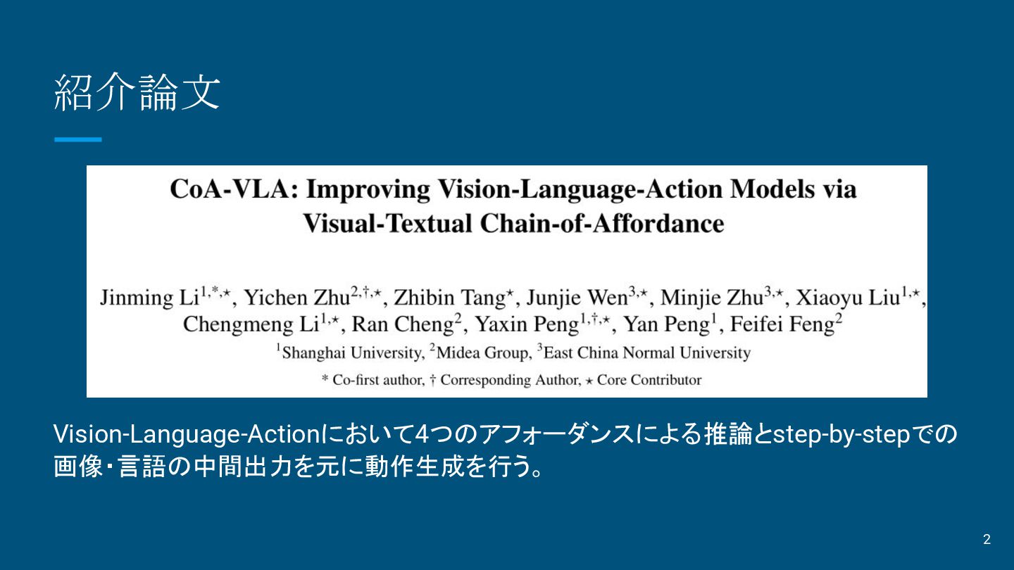 紹介論文 Vision-Language-Actionにおいて4つのアフォーダンスによる推論とstep-by-stepでの 画像・言語の中間出力を元に動作生成を行う。 2