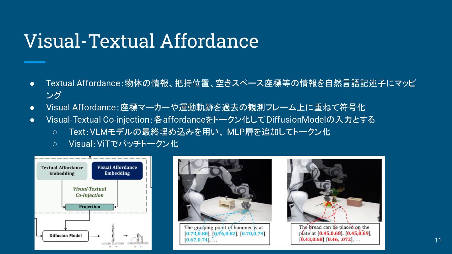 Visual-Textual Co-injection:各affordanceをトークン化してDiffusionModelの入力とする ◦ Text:VLMモデルの最終埋め込みを用い、 MLP層を追加してトークン化 ◦ Visual:ViTでパッチトークン化 11