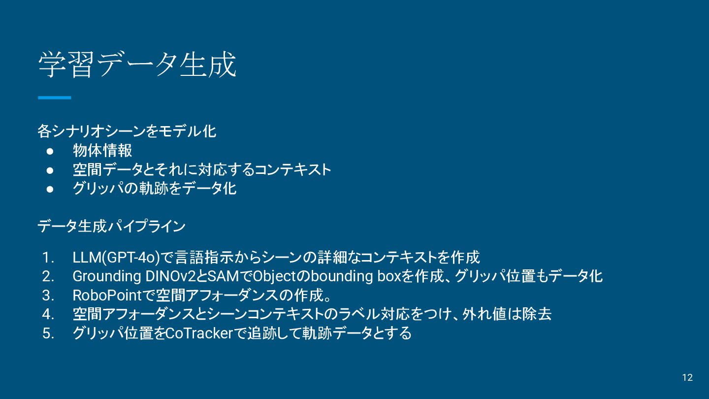 LLM(GPT-4o)で言語指示からシーンの詳細なコンテキストを作成 2. Grounding DINOv2とSAMでObjectのbounding boxを作成、グリッパ位置もデータ化 3. RoboPointで空間アフォーダンスの作成。 4. 空間アフォーダンスとシーンコンテキストのラベル対応をつけ、外れ値は除去 5. グリッパ位置をCoTrackerで追跡して軌跡データとする 12