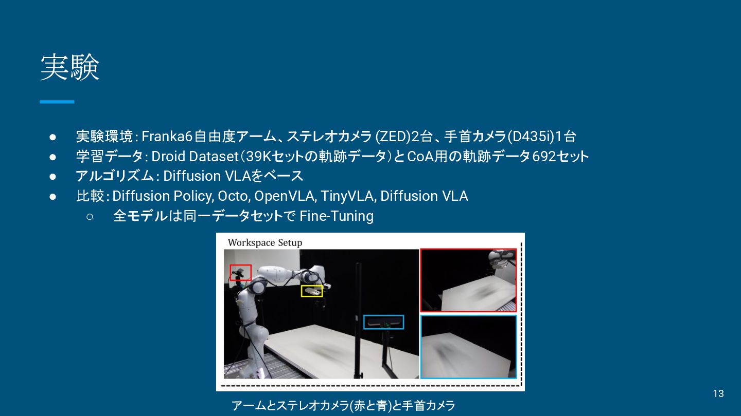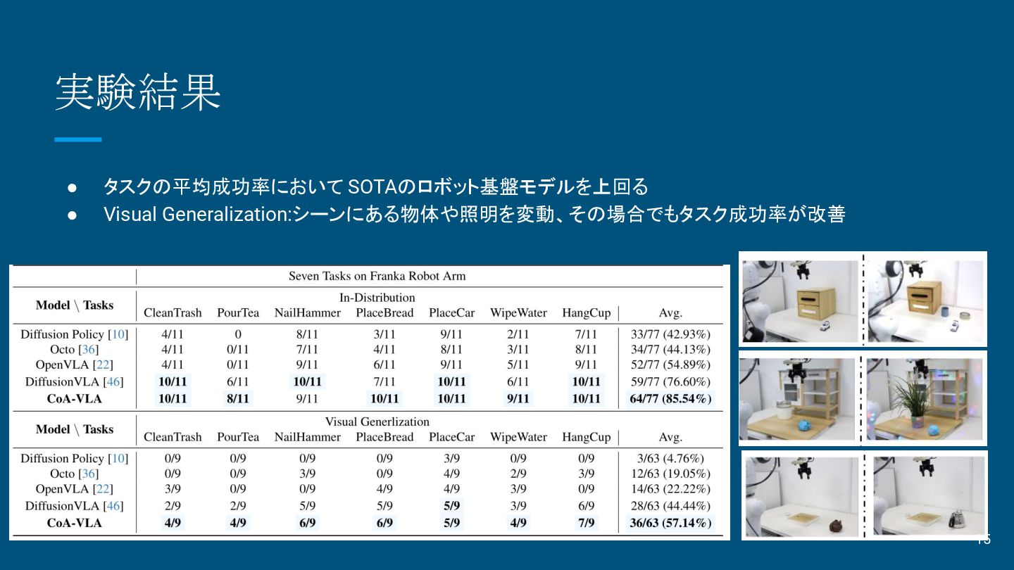 実験 • 実験環境:Franka6自由度アーム、ステレオカメラ (ZED)2台、手首カメラ(D435i)1台 • 学習データ:Droid Dataset(39Kセットの軌跡データ)と CoA用の軌跡データ692セット • アルゴリズム:Diffusion