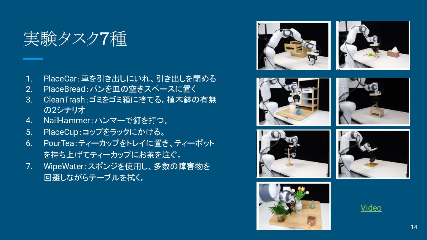 5. PlaceCup:コップをラックにかける。 6. PourTea:ティーカップをトレイに置き、ティーポット を持ち上げてティーカップにお茶を注ぐ。 7. WipeWater:スポンジを使用し、多数の障害物を 回避しながらテーブルを拭く。 14 Video
