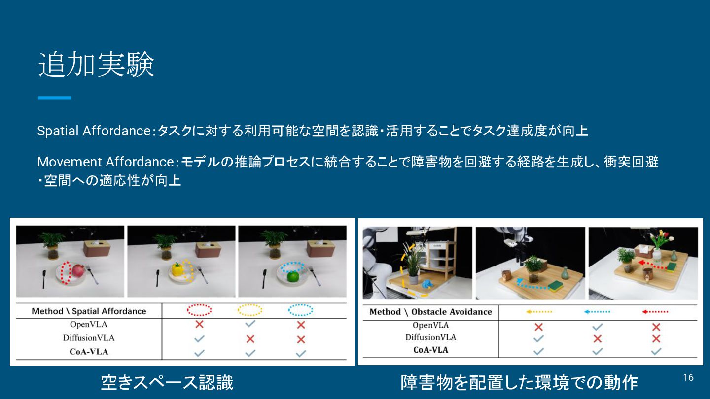 追加実験 Spatial Affordance:タスクに対する利用可能な空間を認識・活用することでタスク達成度が向上 Movement Affordance:モデルの推論プロセスに統合することで障害物を回避する経路を生成し、衝突回避 ・空間への適応性が向上 空きスペース認識 障害物を配置した環境での動作 16