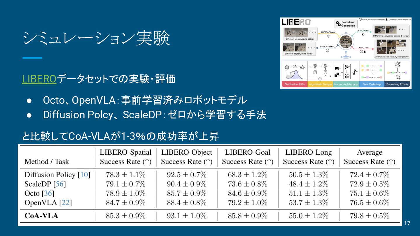 シミュレーション実験 LIBEROデータセットでの実験・評価 • Octo、OpenVLA:事前学習済みロボットモデル • Diffusion Polcy、 ScaleDP:ゼロから学習する手法 と比較してCoA-VLAが1-3%の成功率が上昇 17
