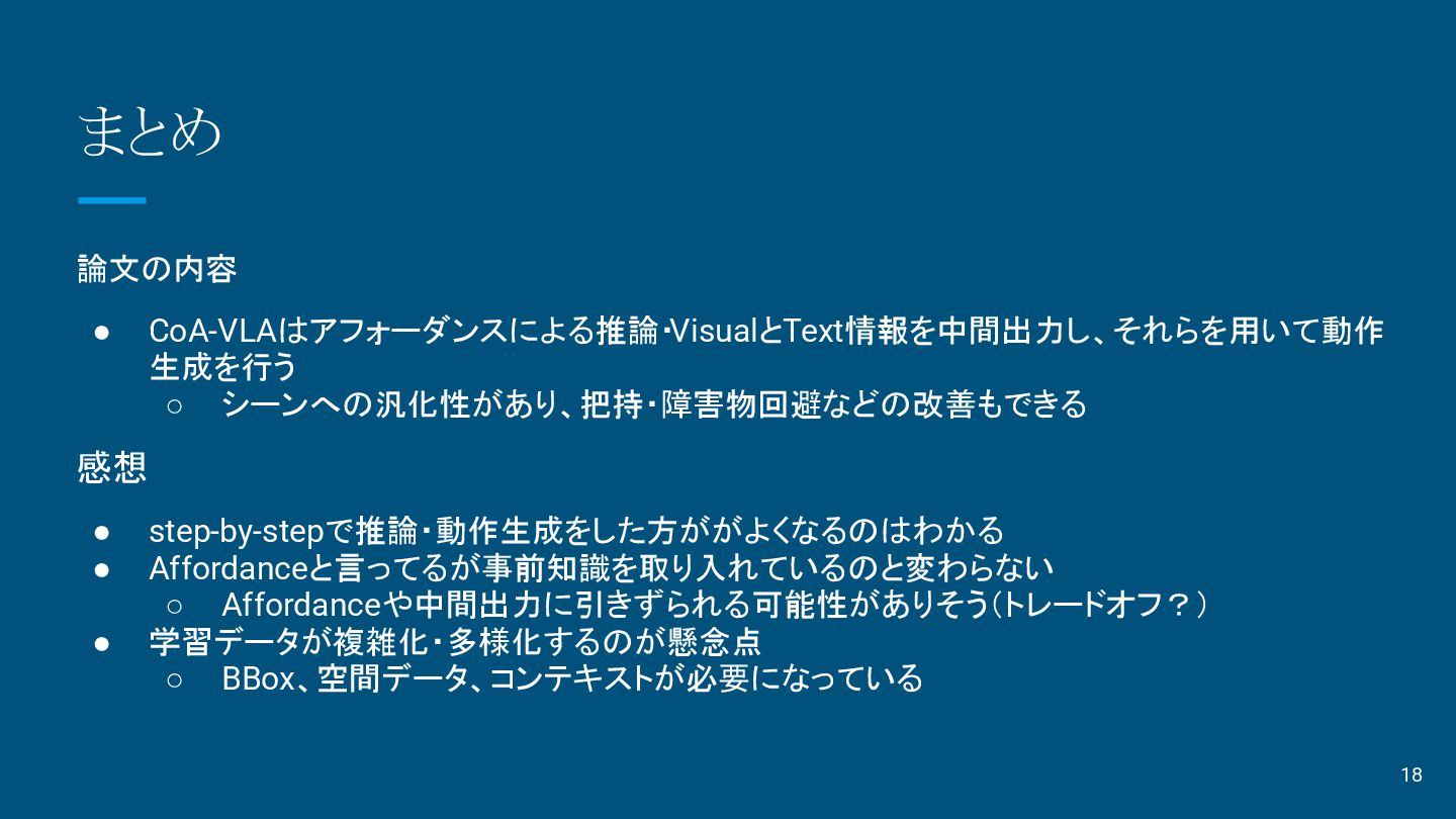 まとめ 論文の内容 • CoA-VLAはアフォーダンスによる推論・VisualとText情報を中間出力し、それらを用いて動作 生成を行う ◦ シーンへの汎化性があり、把持・障害物回避などの改善もできる 感想 • step-by-stepで推論・動作生成をした方ががよくなるのはわかる