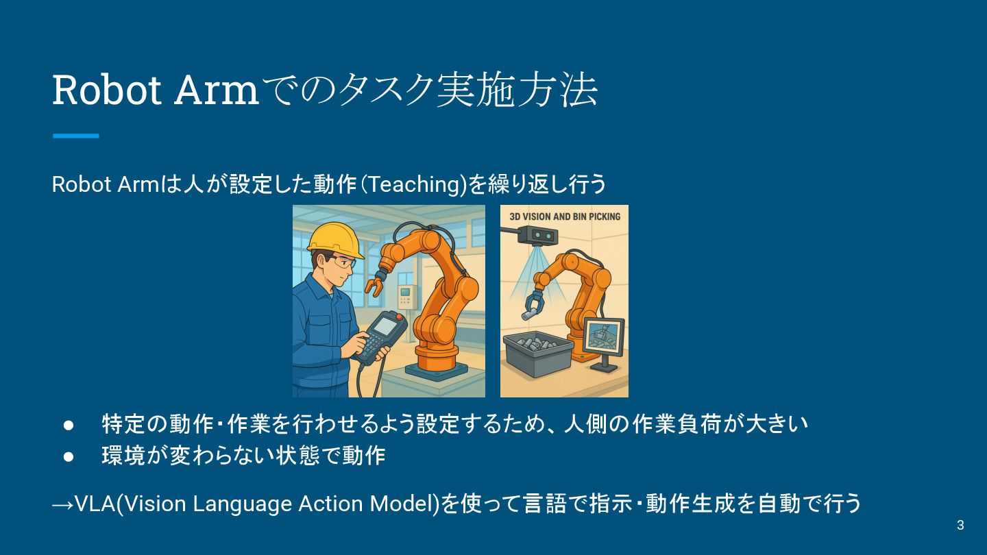 Robot Armでのタスク実施方法 Robot Armは人が設定した動作(Teaching)を繰り返し行う • 特定の動作・作業を行わせるよう設定するため、 人側の作業負荷が大きい • 環境が変わらない状態で動作 →VLA(Vision