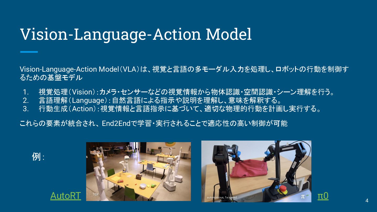 Vision-Language-Action Model Vision-Language-Action Model(VLA)は、視覚と言語の多モーダル入力を処理し、ロボットの行動を制御す るための基盤モデル 1. 視覚処理(Vision):カメラ・センサーなどの視覚情報から物体認識・空間認識・シーン理解を行う。 2. 言語理解(Language):自然言語による指示や説明を理解し、意味を解釈する。 3.