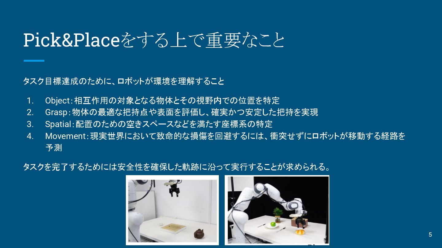 Pick&Placeをする上で重要なこと タスク目標達成のために、ロボットが環境を理解すること 1. Object:相互作用の対象となる物体とその視野内での位置を特定 2. Grasp:物体の最適な把持点や表面を評価し、確実かつ安定した把持を実現 3. Spatial:配置のための空きスペースなどを満たす座標系の特定 4. Movement:現実世界において致命的な損傷を回避するには、衝突せずにロボットが移動する経路を