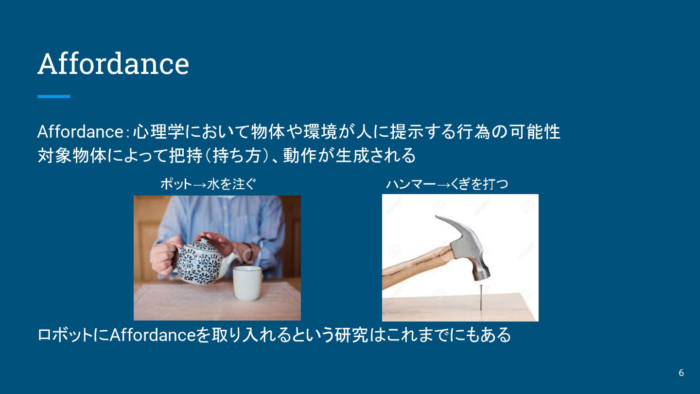 Affordance Affordance:心理学において物体や環境が人に提示する行為の可能性 対象物体によって把持(持ち方)、動作が生成される ロボットにAffordanceを取り入れるという研究はこれまでにもある ポット→水を注ぐ ハンマー→くぎを打つ 6