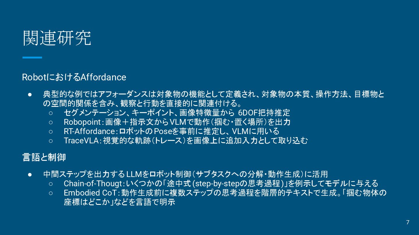 関連研究 RobotにおけるAffordance • 典型的な例ではアフォーダンスは対象物の機能として定義され、対象物の本質、操作方法、目標物と の空間的関係を含み、観察と行動を直接的に関連付ける。 ◦ セグメンテーション、キーポイント、画像特徴量から 6DOF把持推定 ◦ Robopoint:画像+指示文からVLMで動作(掴む・置く場所)を出力