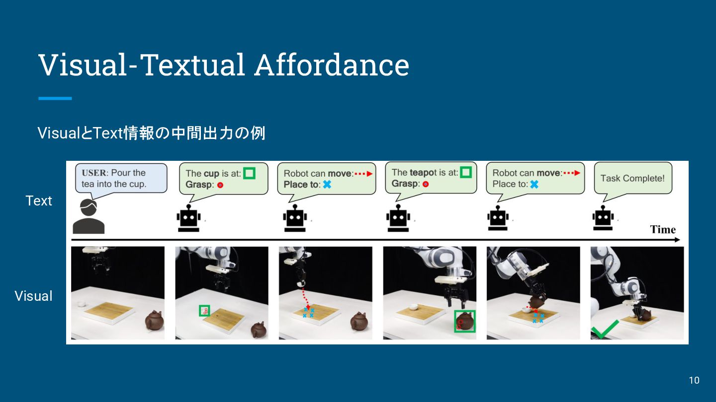Affordance:物体が操作可能な機能や方法を包括する概念で、物体の 把持点を表す 3. Spatial Affordance:ロボットが3D環境内の空間的関係を解釈・推論する能力 で、物体配置やナビゲーションのための衝突フリー領域の特定などを実現 4. Movement Affordance:タスク遂行中の軌道を定義、障害物などの環境変化 に動的に対応してタスクを完了させる Dynamic Affordance selection:objectとgraspは状況に応じて推論しない アフォーダンスをTextとVisualの組み合わせで中間出力する 9