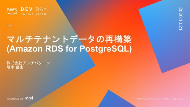 rights reserved. In Partnership with 移行後の問題点 パーティション化したテーブルで一部SQLが遅くなったが、パーティションIDを含めたインデックスで 対応。インデックスの効率を上げるため、部分インデックスに変更 ID tenantID type insert_date delete_flag 1 0000001 0 2020/05/01 20:10:00 0 2 0000002 0 2020/05/01 20:10:00 0 3 0000003 1 2020/05/01 20:10:00 0 SELECT tenantID, type FROM sample WHERE type = 0 GROUP BY tenantID, type 今までのインデックス create index on sample (tenantID、type); 変更した部分インデックス create index on sample (tenantID、type) where type = 0 ID tenantID type insert_date delete_flag 1 0000001 0 2020/05/01 20:10:00 0 2 0000002 0 2020/05/01 20:10:00 0 3 0000003 1 2020/05/01 20:10:00 0