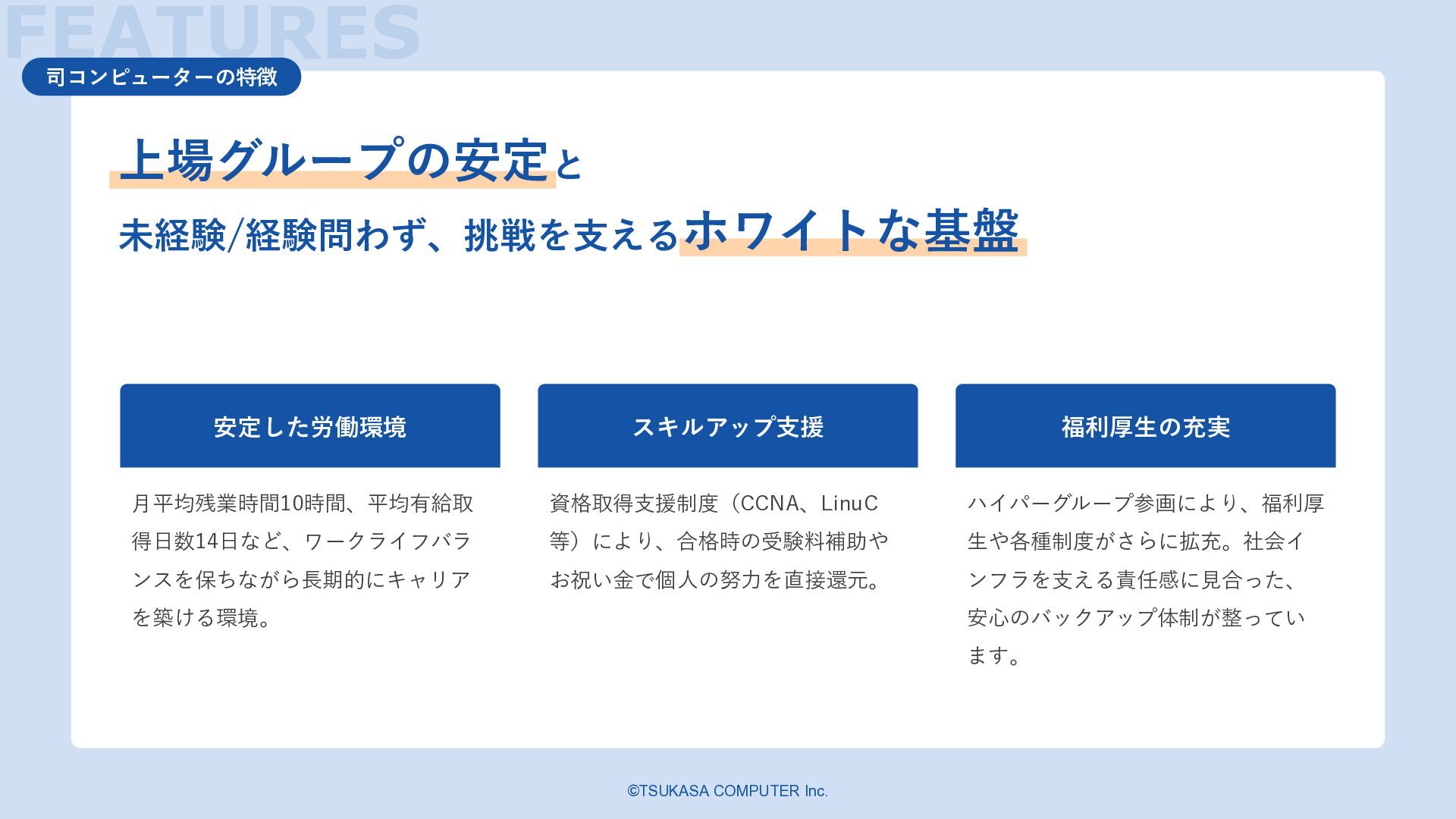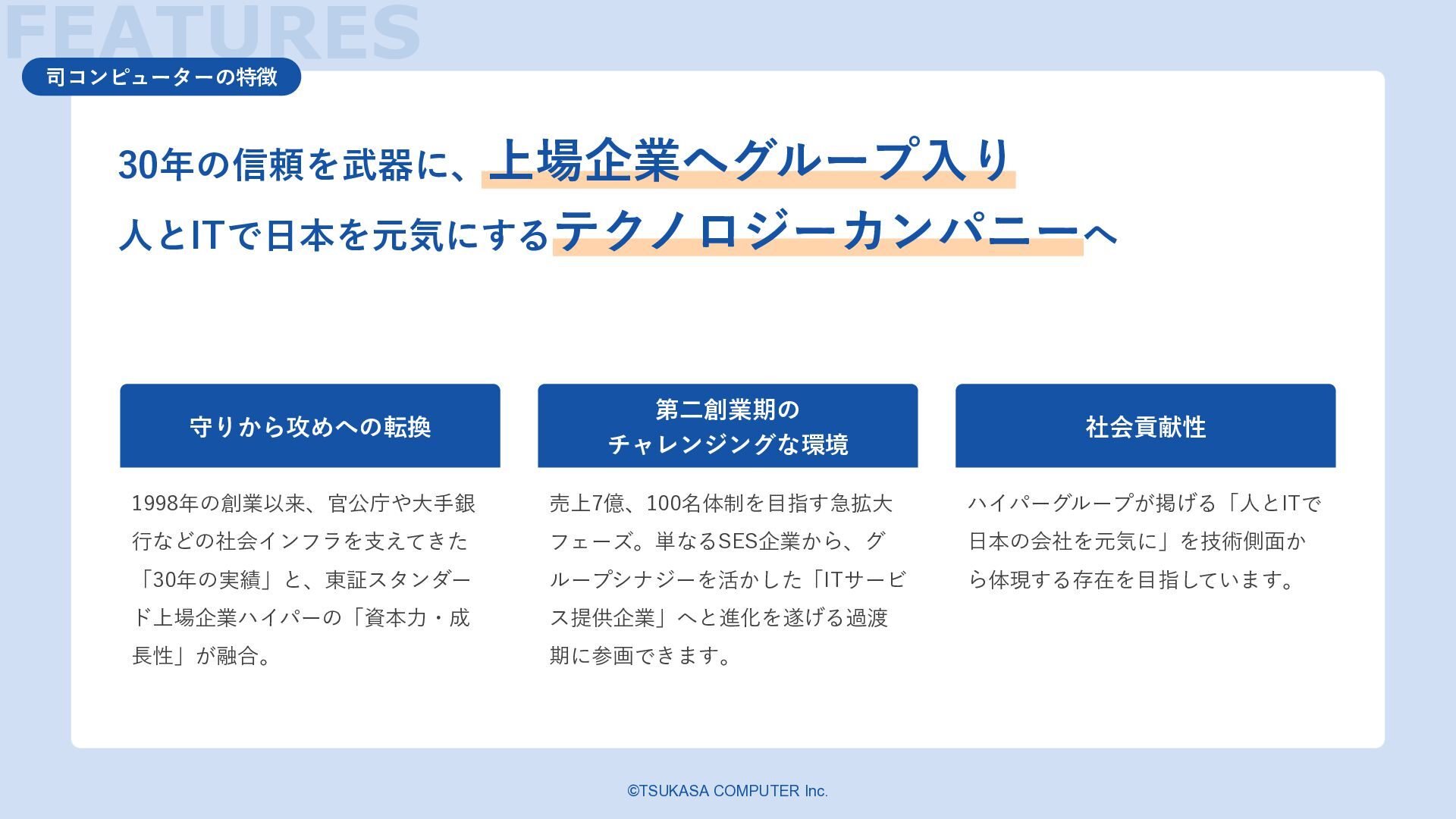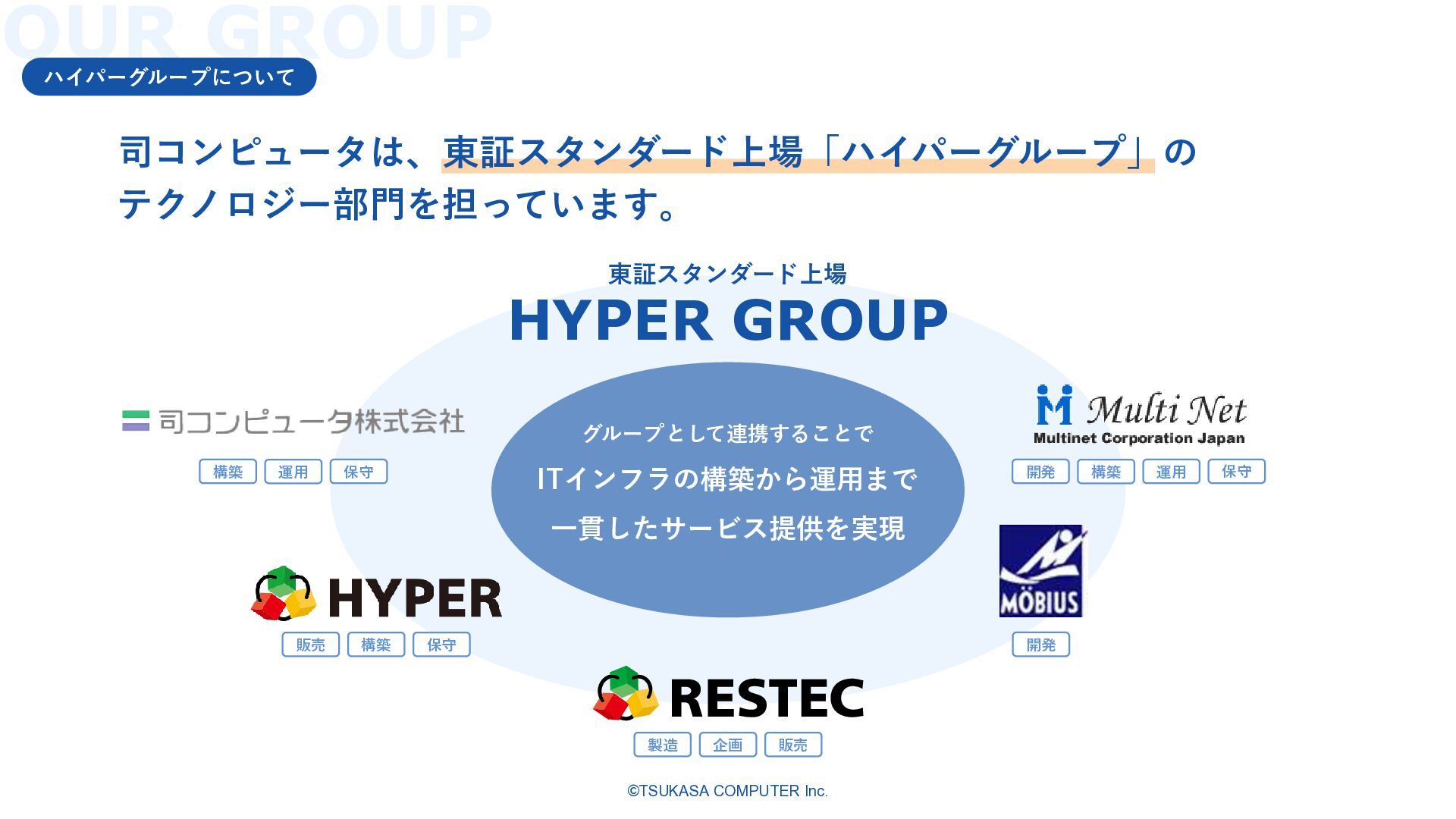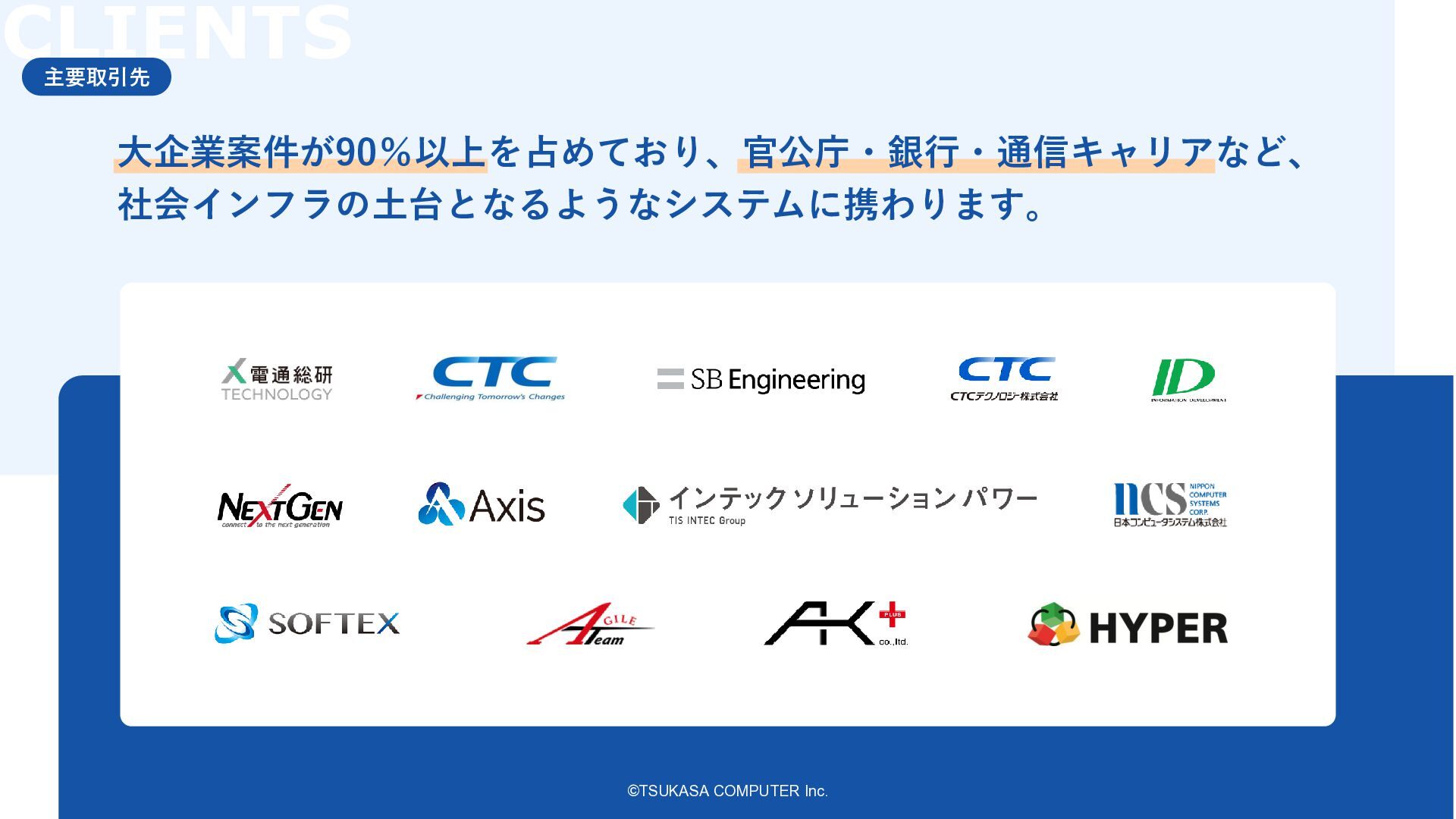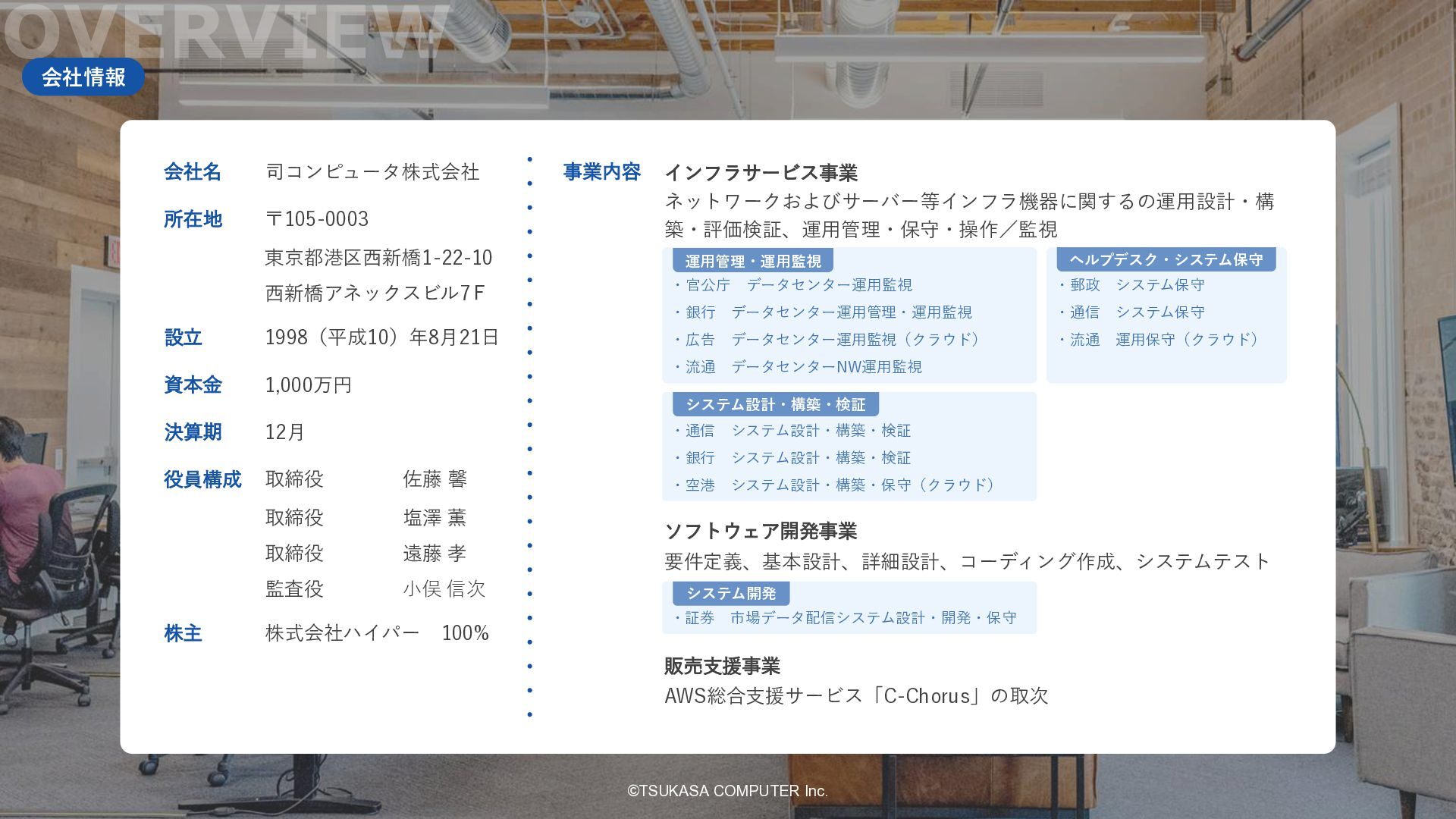 司コンピュータ株式会社 〒105-0003 東京都港区西新橋1-22-10 西新橋アネックスビル7F 1998(平成10)年8月21日 1,000万円 12月 取締役 佐藤 馨 取締役 塩澤 薫 取締役 遠藤 孝 監査役 小俣 信次 株式会社ハイパー 100% インフラサービス事業 ネットワークおよびサーバー等インフラ機器に関するの運用設計・構 築・評価検証、運用管理・保守・操作/監視 ソフトウェア開発事業 要件定義、基本設計、詳細設計、コーディング作成、システムテスト 販売支援事業 AWS総合支援サービス「C-Chorus」の取次 ・官公庁 データセンター運用監視 ・銀行 データセンター運用管理・運用監視 ・広告 データセンター運用監視(クラウド) ・流通 データセンターNW運用監視 運用管理・運用監視 ・郵政 システム保守 ・通信 システム保守 ・流通 運用保守(クラウド) ヘルプデスク・システム保守 ・通信 システム設計・構築・検証 ・銀行 システム設計・構築・検証 ・空港 システム設計・構築・保守(クラウド) システム設計・構築・検証 ・証券 市場データ配信システム設計・開発・保守 システム開発 会社情報 事業内容