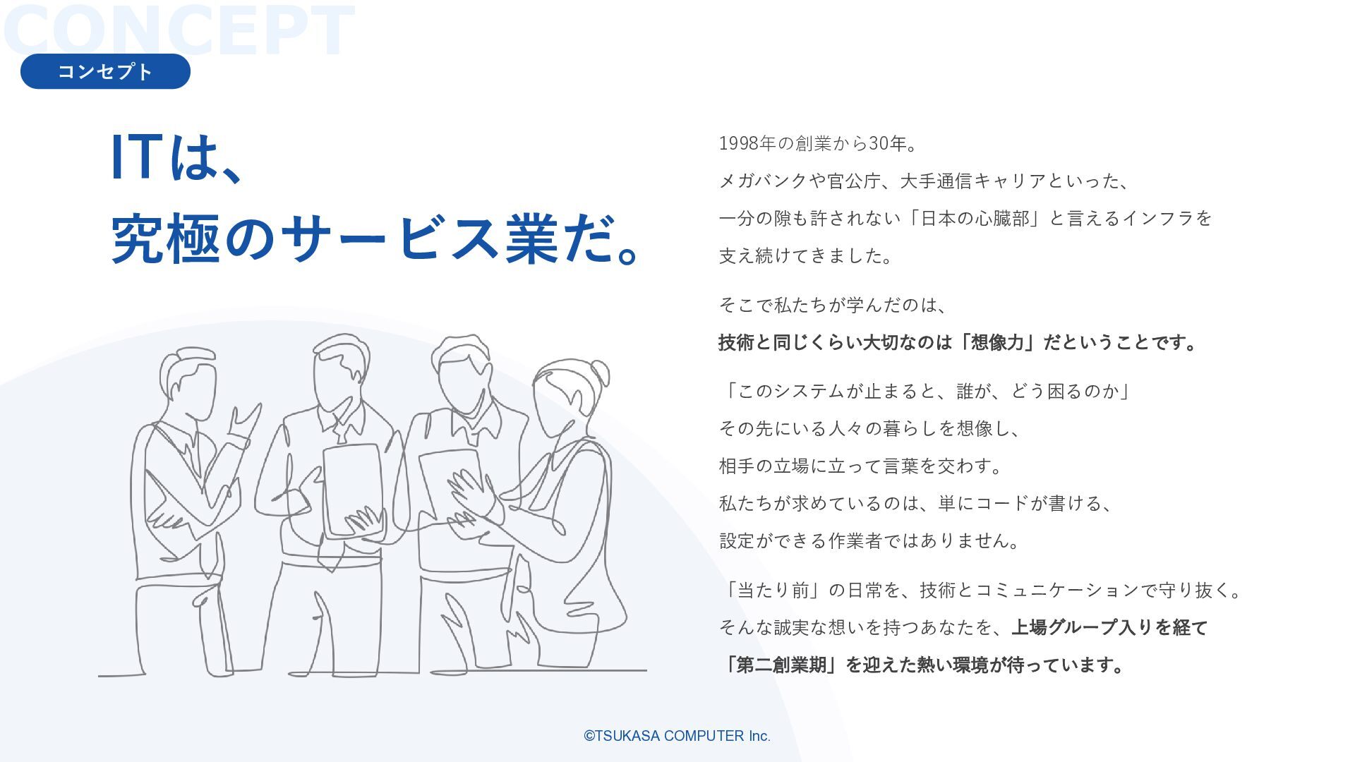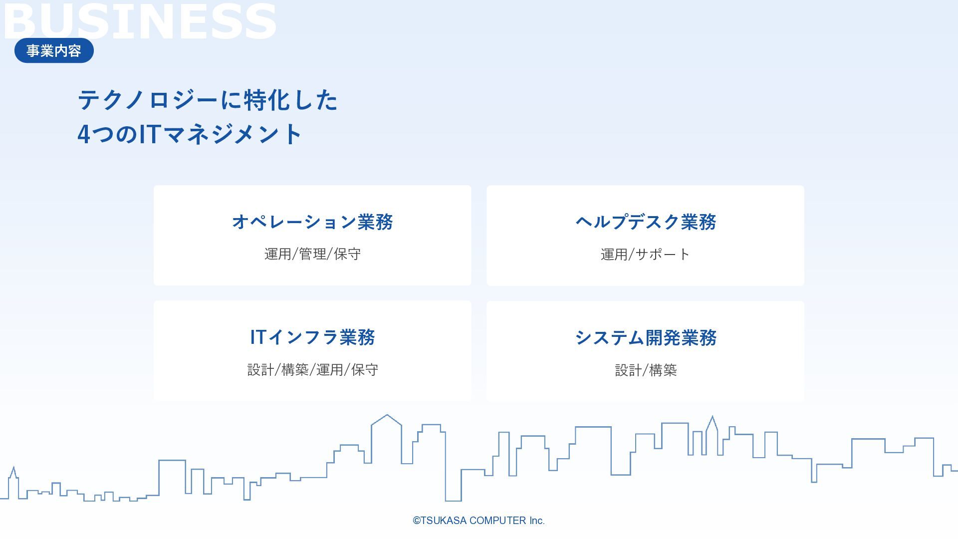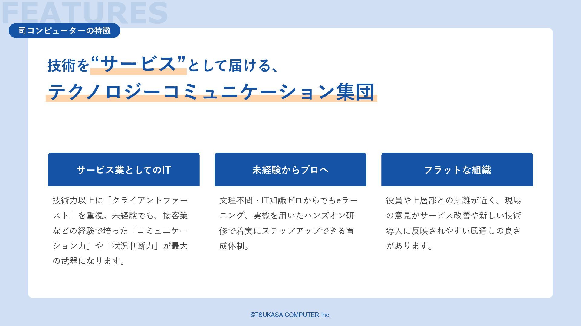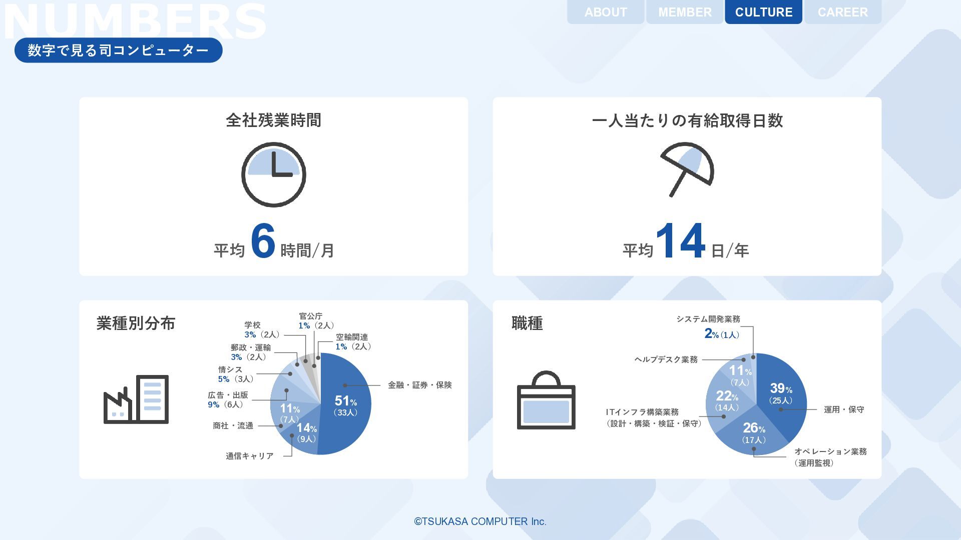 司コンピュータ株式会社 〒105-0003 東京都港区西新橋1-22-10 西新橋アネックスビル7F 1998(平成10)年8月21日 1,000万円 12月 取締役 佐藤 馨 取締役 塩澤 薫 取締役 遠藤 孝 監査役 小俣 信次 株式会社ハイパー 100% インフラサービス事業 ネットワークおよびサーバー等インフラ機器に関するの運用設計・構 築・評価検証、運用管理・保守・操作/監視 ソフトウェア開発事業 要件定義、基本設計、詳細設計、コーディング作成、システムテスト 販売支援事業 AWS総合支援サービス「C-Chorus」の取次 ・官公庁 データセンター運用監視 ・銀行 データセンター運用管理・運用監視 ・広告 データセンター運用監視(クラウド) ・流通 データセンターNW運用監視 運用管理・運用監視 ・郵政 システム保守 ・通信 システム保守 ・流通 運用保守(クラウド) ヘルプデスク・システム保守 ・通信 システム設計・構築・検証 ・銀行 システム設計・構築・検証 ・空港 システム設計・構築・保守(クラウド) システム設計・構築・検証 ・証券 市場データ配信システム設計・開発・保守 システム開発 会社情報 事業内容