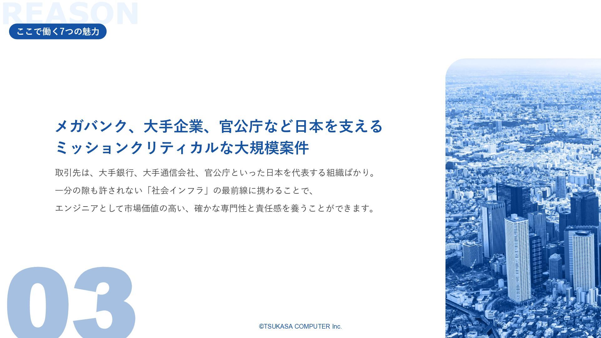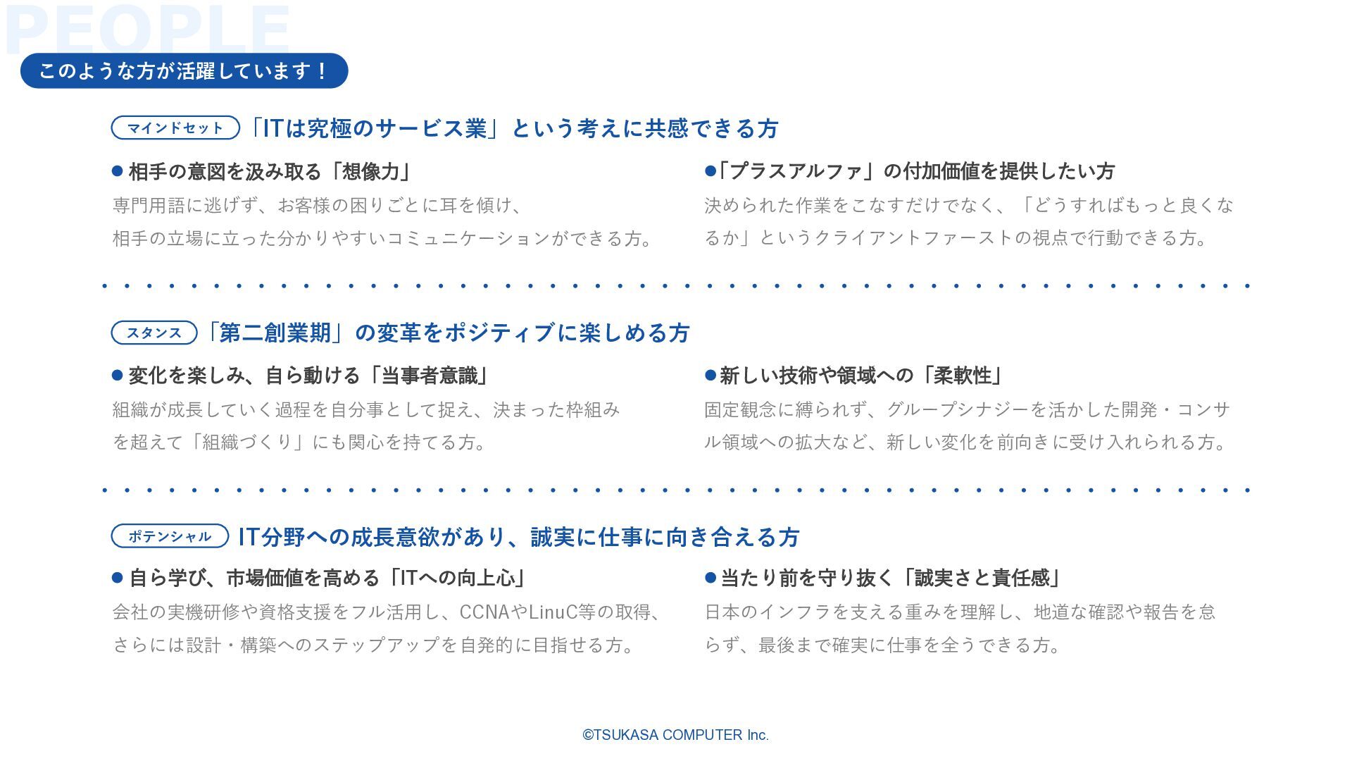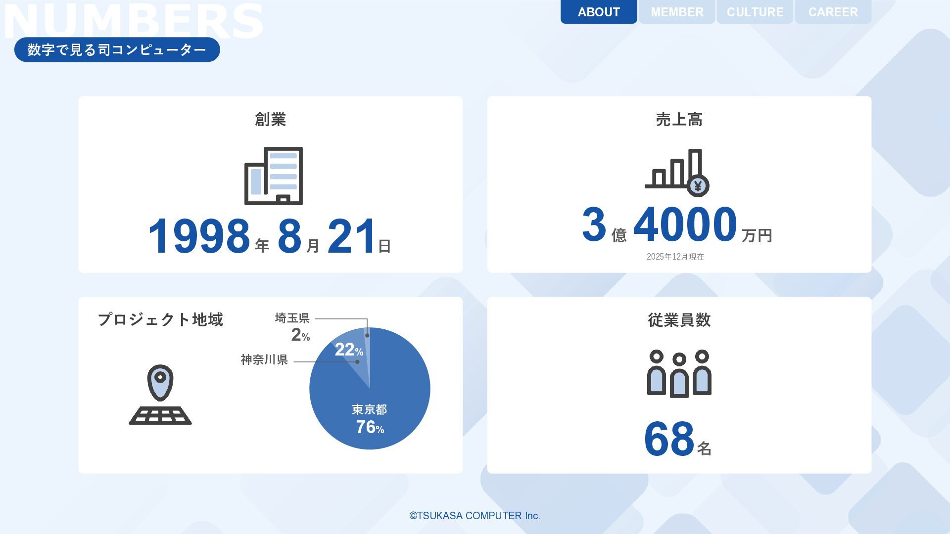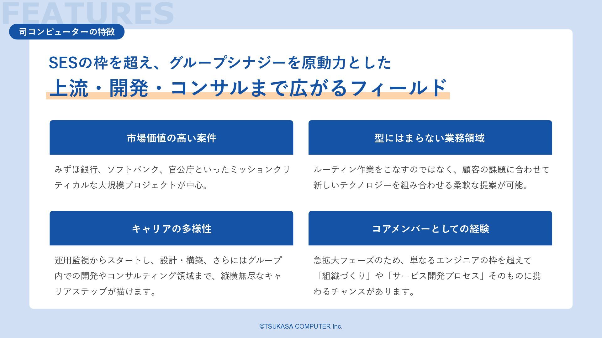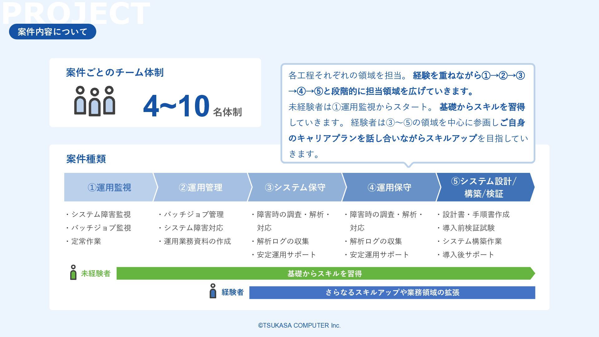 司コンピュータ株式会社 〒105-0003 東京都港区西新橋1-22-10 西新橋アネックスビル7F 1998(平成10)年8月21日 1,000万円 12月 取締役 佐藤 馨 取締役 塩澤 薫 取締役 遠藤 孝 監査役 小俣 信次 株式会社ハイパー 100% インフラサービス事業 ネットワークおよびサーバー等インフラ機器に関するの運用設計・構 築・評価検証、運用管理・保守・操作/監視 ソフトウェア開発事業 要件定義、基本設計、詳細設計、コーディング作成、システムテスト 販売支援事業 AWS総合支援サービス「C-Chorus」の取次 ・官公庁 データセンター運用監視 ・銀行 データセンター運用管理・運用監視 ・広告 データセンター運用監視(クラウド) ・流通 データセンターNW運用監視 運用管理・運用監視 ・郵政 システム保守 ・通信 システム保守 ・流通 運用保守(クラウド) ヘルプデスク・システム保守 ・通信 システム設計・構築・検証 ・銀行 システム設計・構築・検証 ・空港 システム設計・構築・保守(クラウド) システム設計・構築・検証 ・証券 市場データ配信システム設計・開発・保守 システム開発 会社情報 事業内容