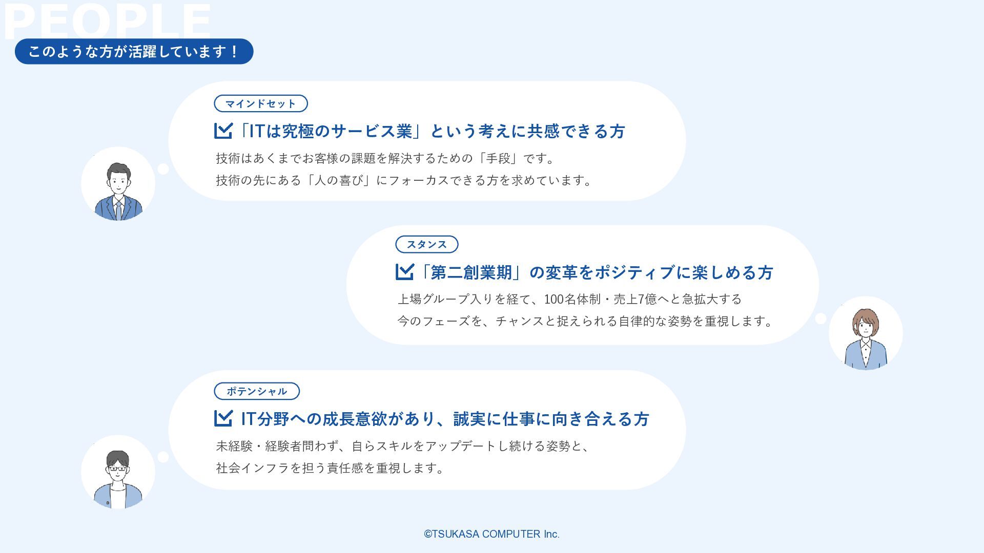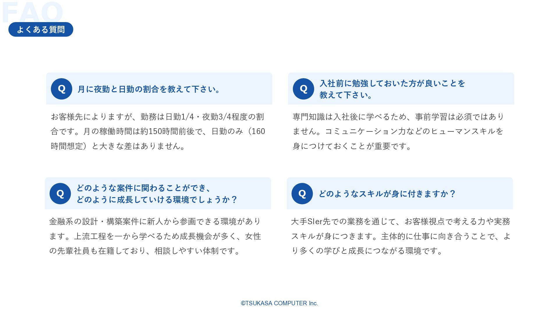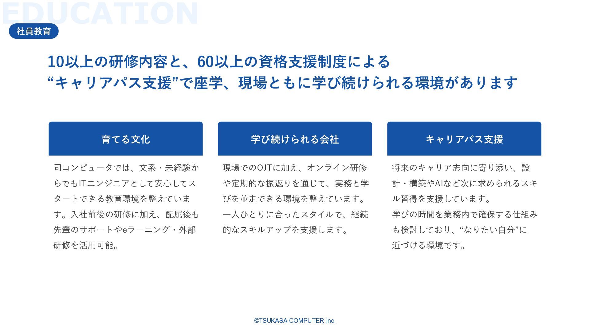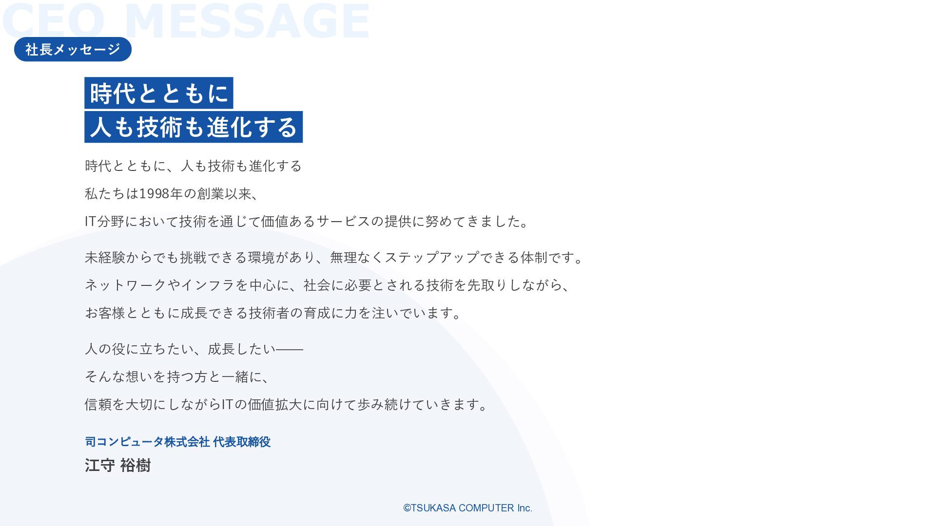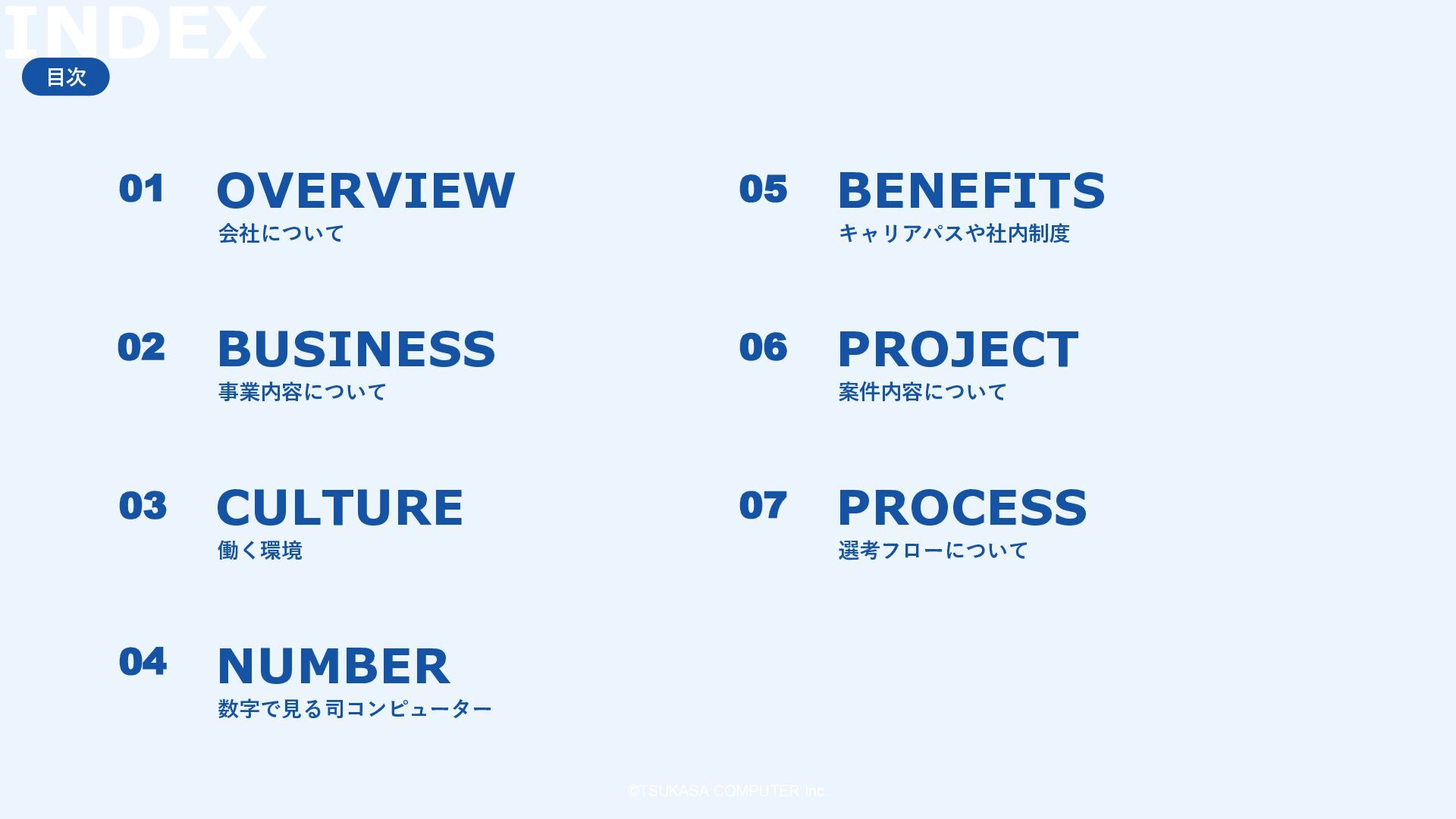 司コンピュータ株式会社 〒105-0003 東京都港区西新橋1-22-10 西新橋アネックスビル7F 1998(平成10)年8月21日 1,000万円 12月 取締役 佐藤 馨 取締役 塩澤 薫 取締役 遠藤 孝 監査役 小俣 信次 株式会社ハイパー 100% インフラサービス事業 ネットワークおよびサーバー等インフラ機器に関するの運用設計・構 築・評価検証、運用管理・保守・操作/監視 ソフトウェア開発事業 要件定義、基本設計、詳細設計、コーディング作成、システムテスト 販売支援事業 AWS総合支援サービス「C-Chorus」の取次 ・官公庁 データセンター運用監視 ・銀行 データセンター運用管理・運用監視 ・広告 データセンター運用監視(クラウド) ・流通 データセンターNW運用監視 運用管理・運用監視 ・郵政 システム保守 ・通信 システム保守 ・流通 運用保守(クラウド) ヘルプデスク・システム保守 ・通信 システム設計・構築・検証 ・銀行 システム設計・構築・検証 ・空港 システム設計・構築・保守(クラウド) システム設計・構築・検証 ・証券 市場データ配信システム設計・開発・保守 システム開発 会社情報 事業内容