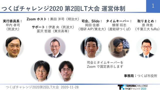 LT 2020-11-28 実行委員長: 坪内 孝司 (筑波大) Zoom ホスト:黒田 洋司(明治大) サポート:伊達 央(筑波大) 冨沢 哲雄(東京高専) 司会、Slido: 岡田 佳都 (理研 AIP/東北大) タイムキーパー: 横塚 将志 (産総研つくば) 取りまとめ: 原 祥尭 (千葉工大 fuRo) 事務局:つくば市役所 司会とタイムキーパーを Zoom で固定表示します