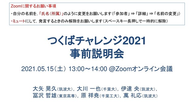 つくばチャレンジ2021 事前説明会 2021.05.15(土) 13:00~14:00 @Zoomオンライン会議 大矢 晃久(筑波大),大川 一也(千葉大),伊達 央(筑波大), 冨沢